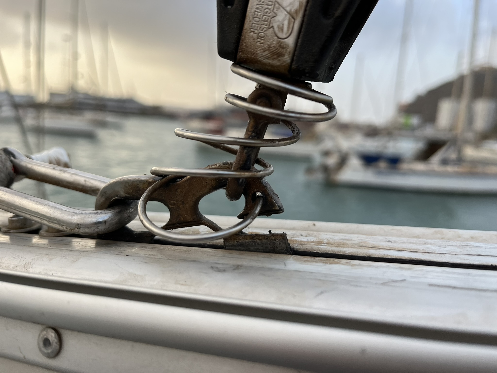 Was wir noch erledigt haben, ist zum Beispiel die Gasflaschen an der Tanke um die Ecke zu einem Spottpreis aufzufüllen. Ca 1/10 von den Kosten bei uns. Dann haben wir noch unserem Spibaum verbessert, der die Genua bei dem Rückenwind in Position hält. Unten ist jetzt ein Niederhalter drangebastelt der die Bewegung einschränkt, und für mehr Segelkomfort sorgen soll. Es werden morgen noch mal eine Ladung frische Sachen und andere Lebensmittelergänzungen besorgt. Wahrscheinlich gehen wir die letzte Nacht noch vor Anker, da sich hier im windigen Hafen die Windfahnensteuerung nicht montieren lässt.