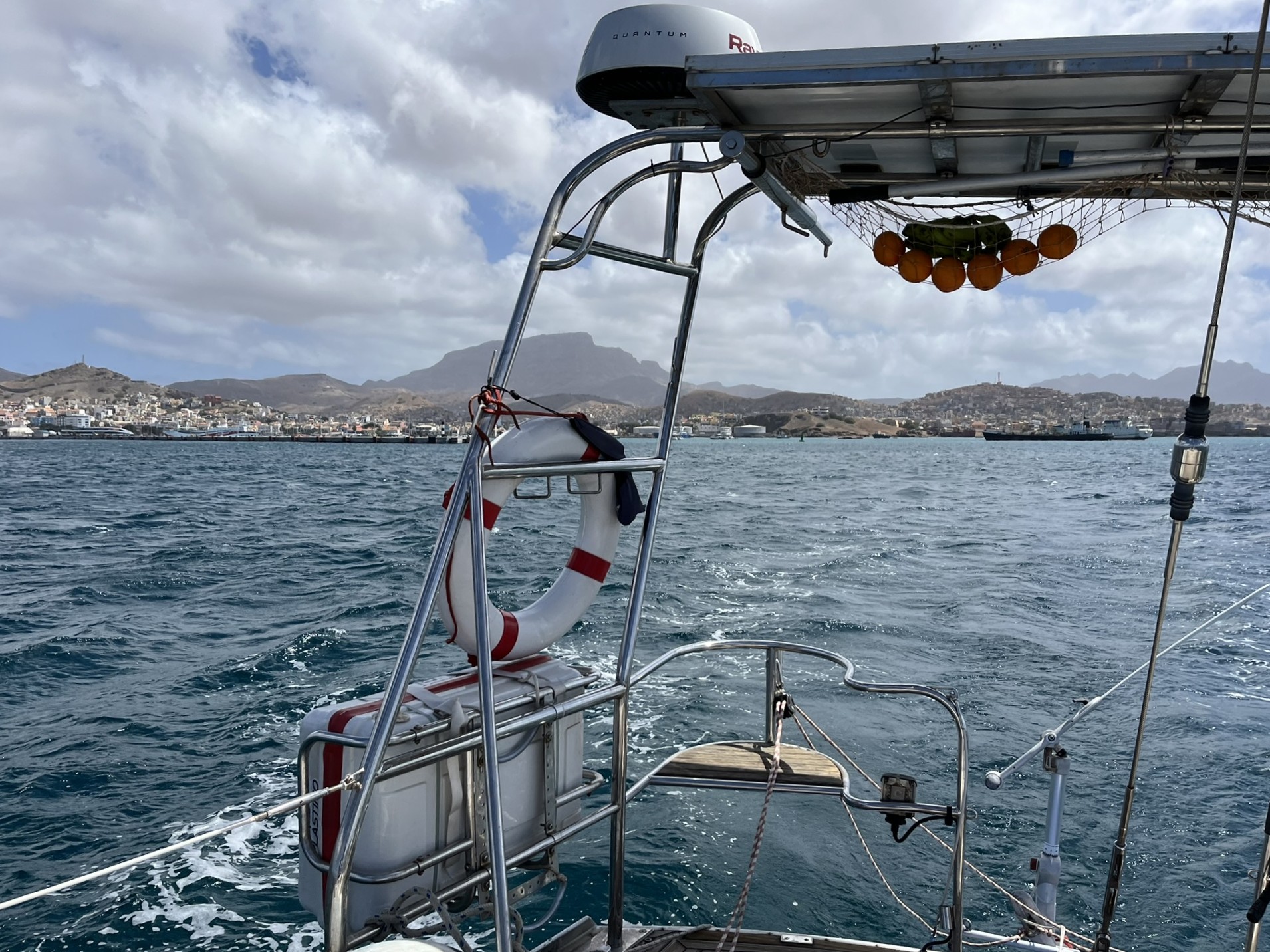 Und dann ging es los, Anker auf und raus in die Bucht vor Mindelo erstmal Kurs SW und dann W. Wir waren bereits gewarnt worden, zwischen den Insel Sao Vicente und Santo Antao entsteht durch die Verengung eine Düse die den Wind noch mal ordentlich verstärkt. Daher lassen wir uns mit dem Segel setzen Zeit und warten bis wir im Süden Santo Antao erreicht haben. Aber auch dann ist es recht ordentlich mit locker 6-7 Bft, aber von hinten was das etwas abmildert. Gemäß der Vorhersage verschwindet Abends der Wind für 2h weil wir in die Abdeckung der Insel kommen. Also wieder Motor an und so fahren wir in den Sonnenuntergang.