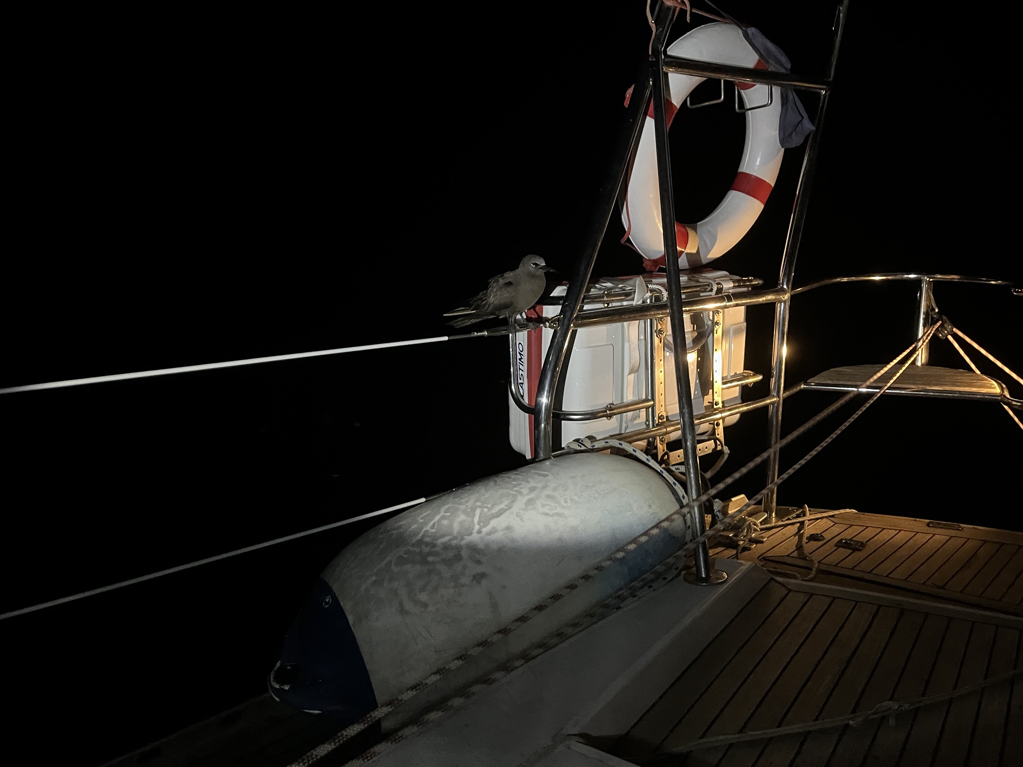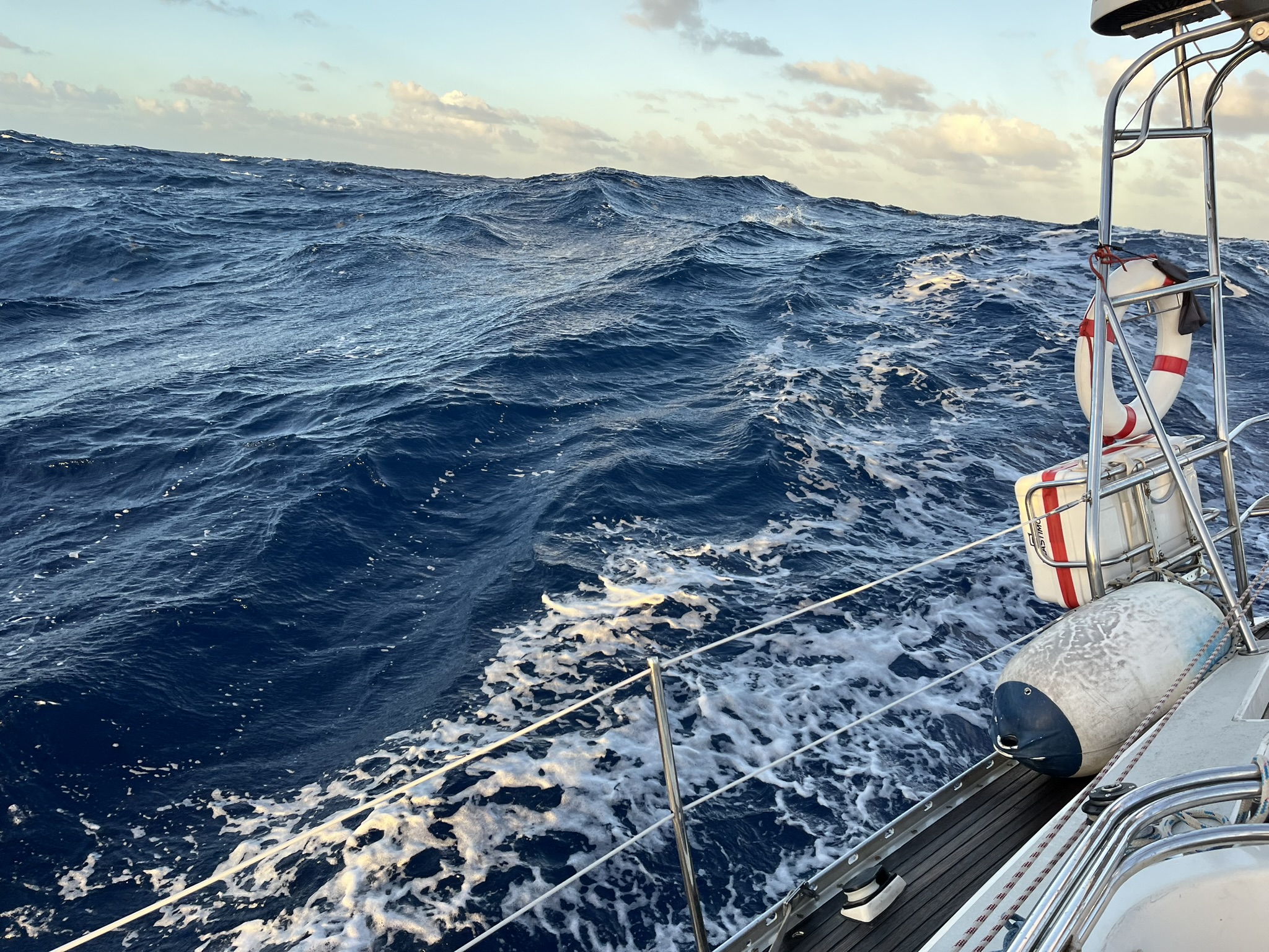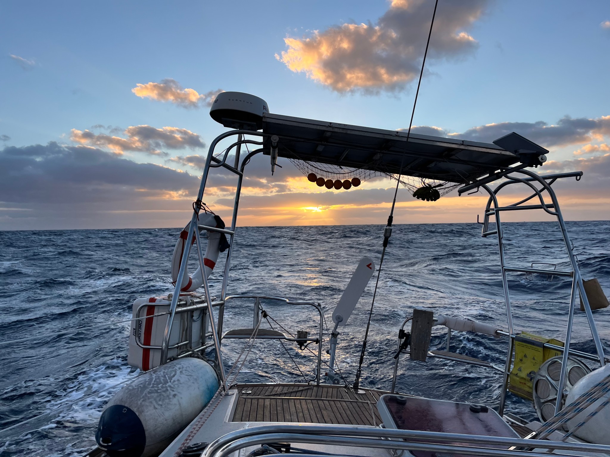 Obwohl wir eigentlich in tropischen Breiten sind, ist es morgens im Cockpit ganz schön feucht. Das liegt zum einen an den Wellen, die immer wieder ins Cockpit spritzen zum andern halt an der normalen Luftfeuchtigkeit. Umso schöner ist es dann, wenn die Sonne morgens nach dem aufgehen anfängt Kraft zu entfalten, und zügig alles trocknet. Durch das Salz ist allerdings alles etwas klebrig draussen und das wird wohl auch bis zum Ende der Fahrt so bleiben. Segeltechnisch haben wir heute eine entscheidende kleine Änderung durchgeführt. Da der Wind in der Nacht immer mehr nach hinten drehte, fing die Genua an immer mehr zu schlagen. Und da das Großsegel den Wind der Genua weggenommen hat, haben wir es kurzerhand eingeholt. Die Genua konnten wir deutlich vergrößern und seitdem fahren wir wie auf Schienen. Der Windpilot steuert super präzise, die Genua steht mit dem Spibaum wie eine Eins und im Boot ist deutlich mehr Stabilität. So kann es bleiben… Etmal schon wieder 133sm.