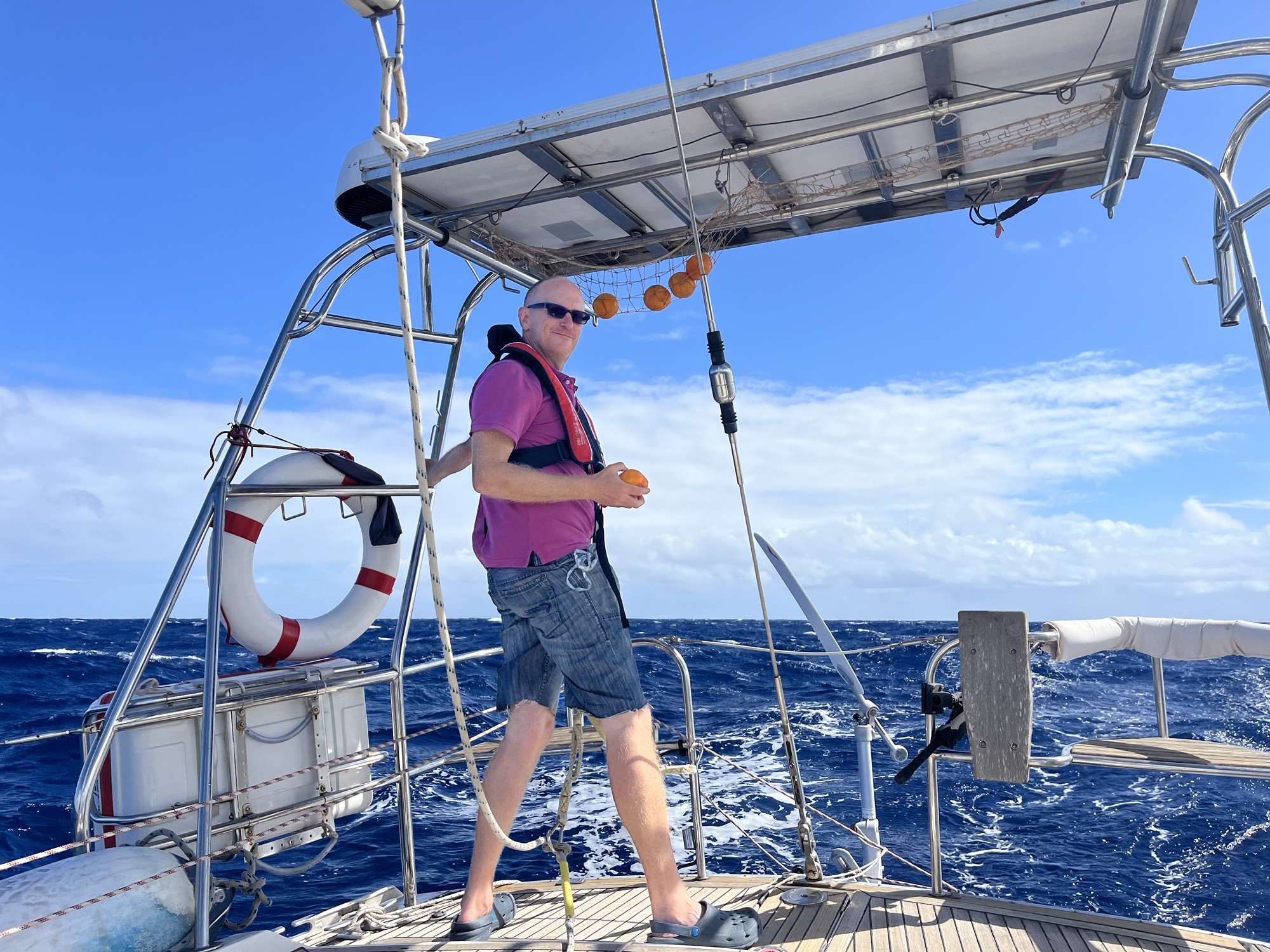 Wir sehen mitten auf dem Atlantik zum ersten Mal seit der Abfahrt ein Frachtschiff, das gibt einem ein gutes Gefühl doch nicht ganz so alleine in dieser Welt zu sein. Und noch eine Neuigkeit hat sich zugetragen, es hat zum ersten Mal ein wenig geregnet. Hat aber nicht dafür gereicht, das Deck mal etwas vom Salz zu befreien. Heute Morgen sind wir in die nächste Zeitzone hinein gefahren. Wir sind jetzt 4 Stunden hinter Mitteleuropa. Interessiert aber ansonsten hier draußen keinen Menschen. Dann hat unser Windpilot angefangen, komische Bewegung hinten am Heck zu machen. Er kippte nur noch in eine Richtung.  Das ist bei der Wellensituation da draußen immer etwas haarig hinten am Heck rum zu turnen. Es war aber nur eine Leine, die sich dort falsch verfangen hatte und konnte schnell behoben werden. Natascha scheint ihre Magen-Darm Probleme überwunden zu haben und ist wieder voll belastbar. Etmal 122 sm.