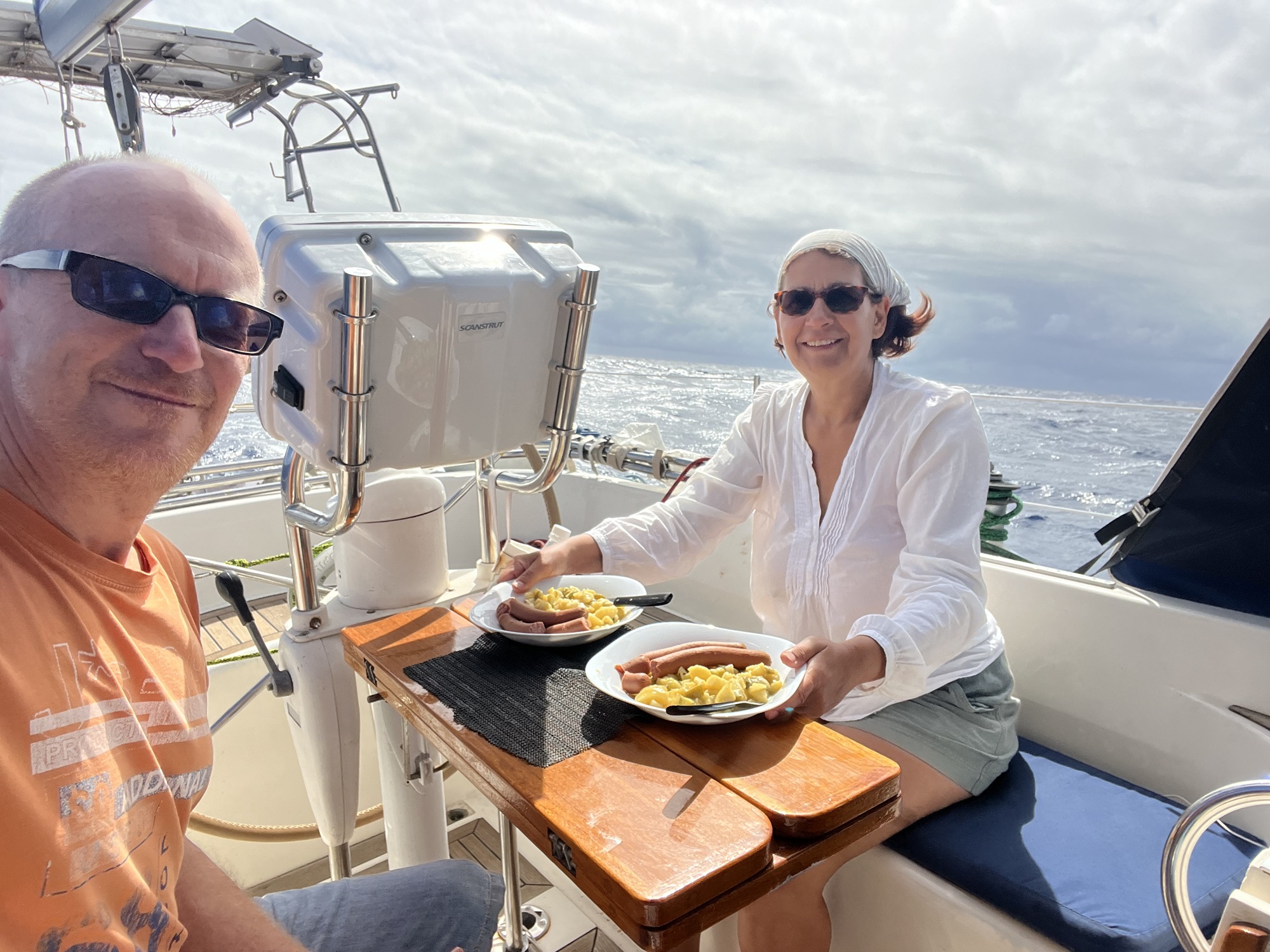 Obwohl wir auf so engem Raum zu zweit leben, fiel uns auf, dass wir uns eigentlich gar nicht so viel sehen. Einer sitzt immer im Cockpit und der andere schläft oder macht was in der Küche oder vertreibt sich sonst irgendwie die Zeit.  Zum Essen treffen wir uns immer im Cockpit und können dann in Ruhe quatschen. Durch das Rollen von rechts nach links des Bootes haben wir unseren Schlafplatz vom Salon in das Schlafzimmer hinten verlegt. Dort kann man auf dem Boden quer zur Fahrtrichtung schlafen und kippelt dadurch viel weniger. Nach einiger Zeit gewöhnt man sich sogar dran. Für die nächsten drei Tage ist das Wetter nun deutlich wilder geworden. Die Wellen gehen auf über 3 m und von hinten haben wir 6-7 Bft Windstärke.  Das ist aber machbar und trifft im Moment jeden der vielen Segler auf dem gesamten Atlantik. Etmal wieder 122sm.