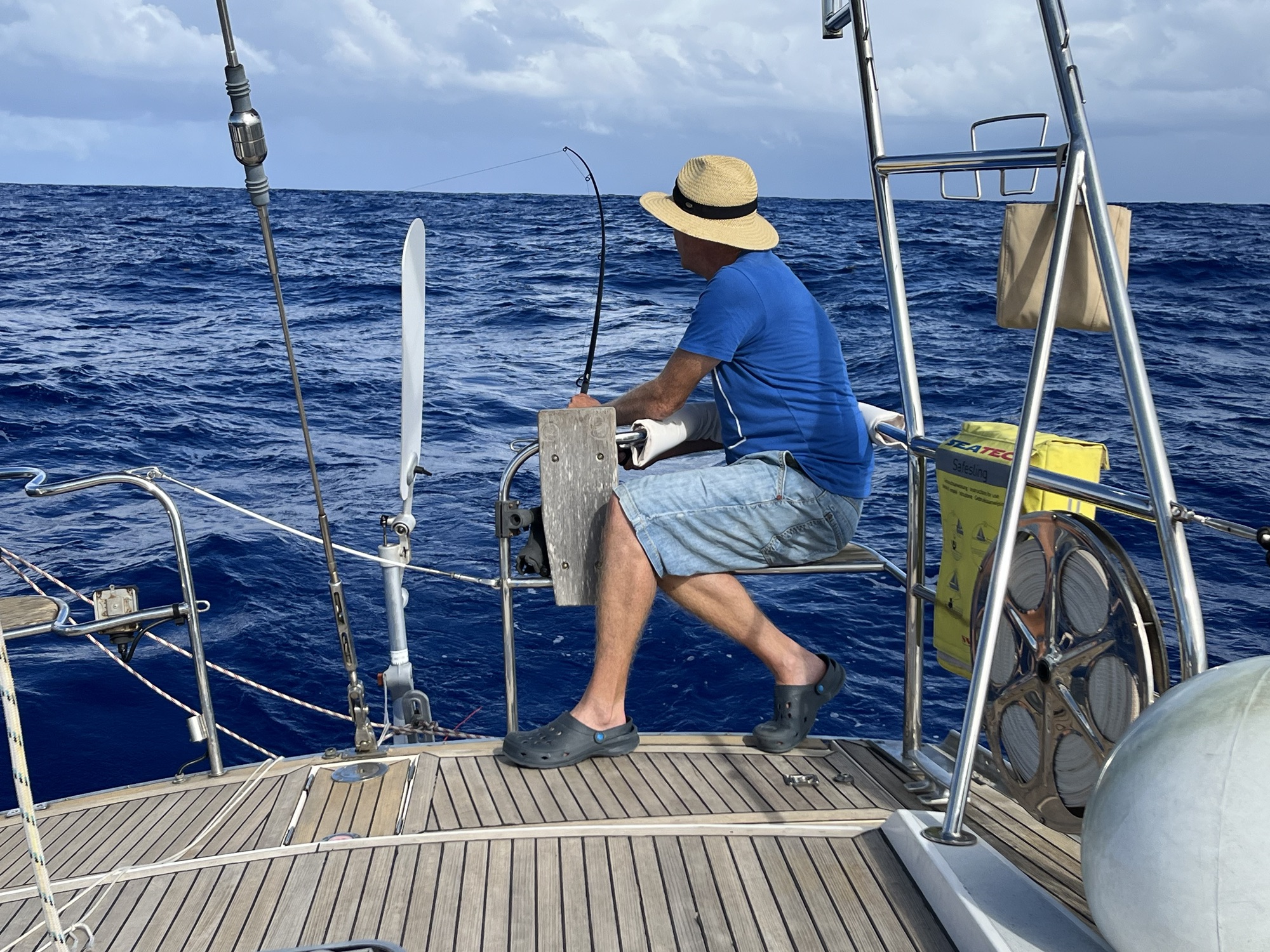 Wir versuchen es mal wieder mit Fische fangen und lassen die Rute mit einem Gummiwobbler mitlaufen. Das Problem ist, es verfängt sich ständig Seegrass was die Kurbel auch ausschlagen lässt und für regelmäßigen Fehlalarm sorgt. Am Abend haben wir dann tatsächlich mal wieder eine Goldmakrele am Haken, die sich im letzten Moment vor dem Einholen losgerissen hat. Pech, gibt es doch keinen frischen Fisch mehr heute.