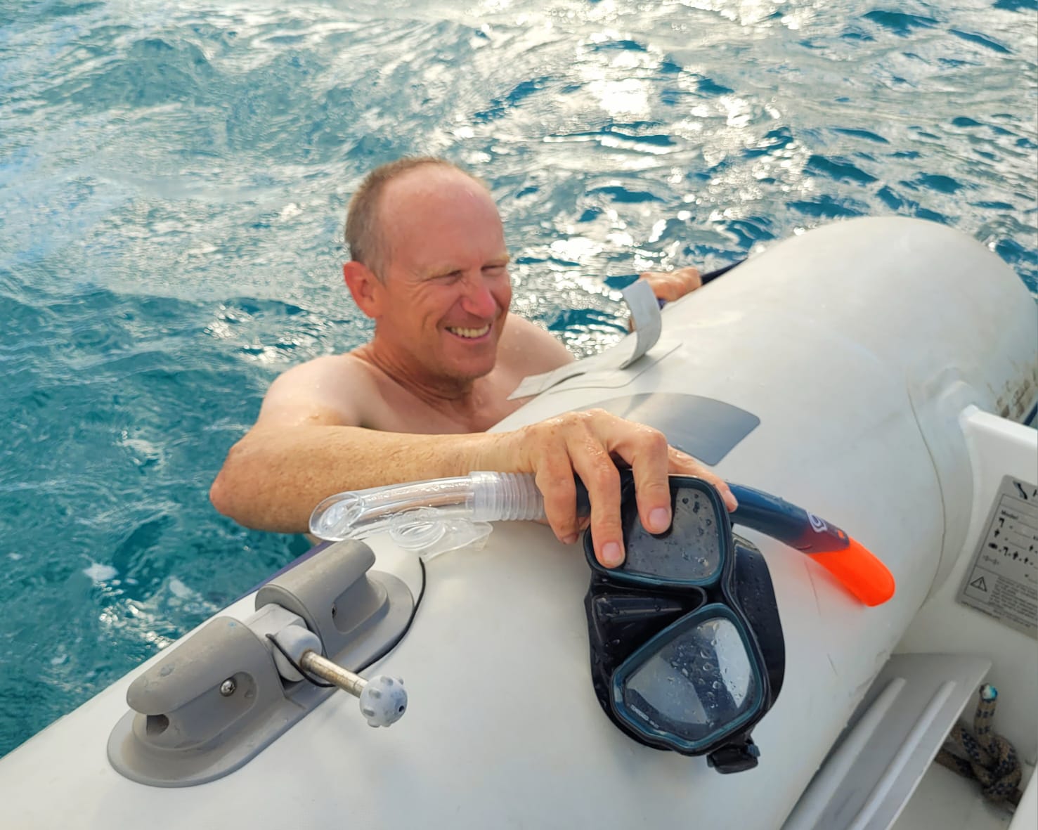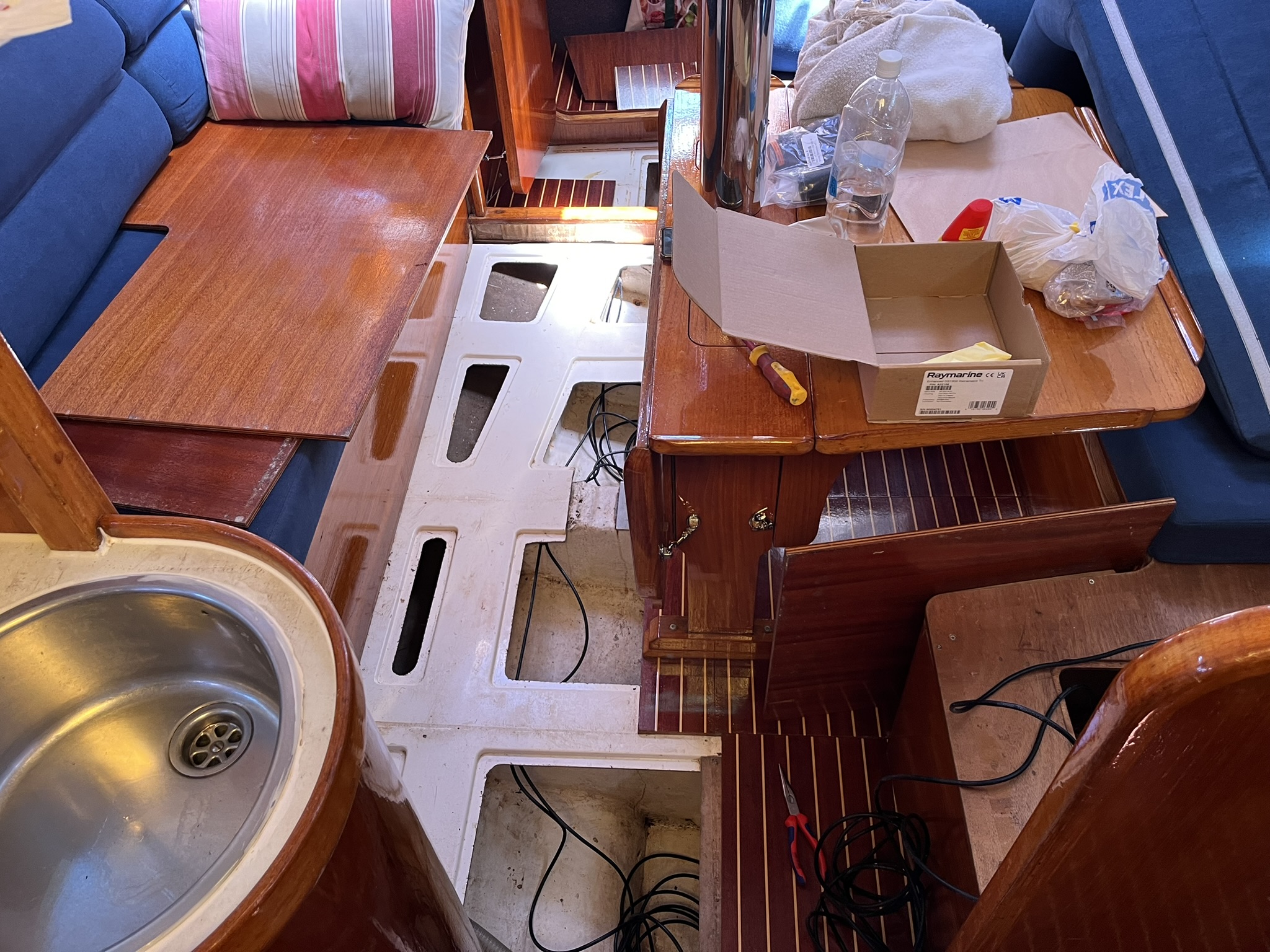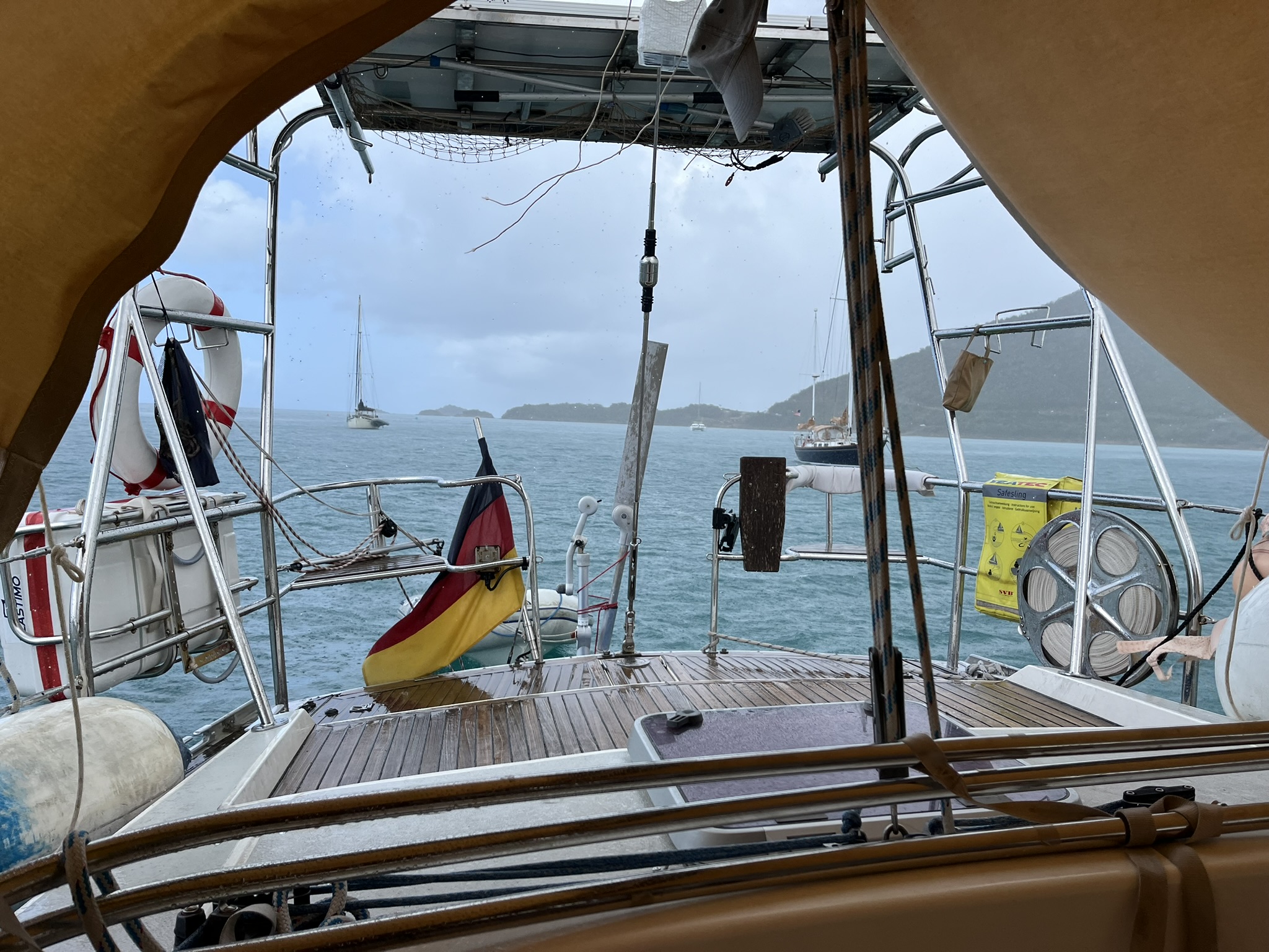 Zwischendurch gibt es auch sehr durchwachsene Tage, an denen ständig kurze aber heftige Schauer runterkommen. Wir nutzen das um mit unserem Bordgetüddel weiterzumachen. Es wird zum Beispiel ein neuer Sensor für unsere Tiefenmessung und Geschwindigkeit durch das Wasser eingebaut. Leider muss dafür durch das gesamte Boot ein Kabel gezogen werden. Wir schaffen es auch unser Ankerlicht zu reparieren (bzw. das Kabel was unten nicht richtig verbunden war) und die Decksbeleuchtung am Mast geht auch wieder. Durch die hohen Wassertemperaturen steigt auch der Bewuchs am Rumpf deutlich an. Unser schönes Antifouling ist inzwischen mit Algen und kleinen Schnecken bewachsen. Der Skipper schnappt sich einen großen Spachtel und taucht eine Stunde um das Boot und schabt soweit es geht das grüne Zeug ab. Das bringt bestimmt eine etwas höhere Geschwindigkeit.