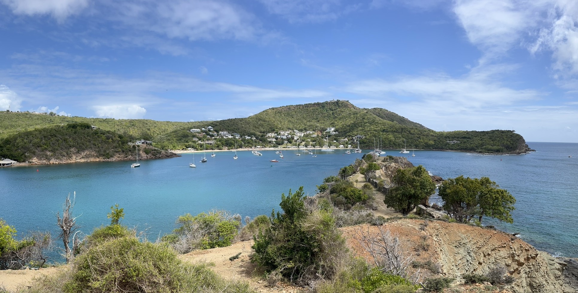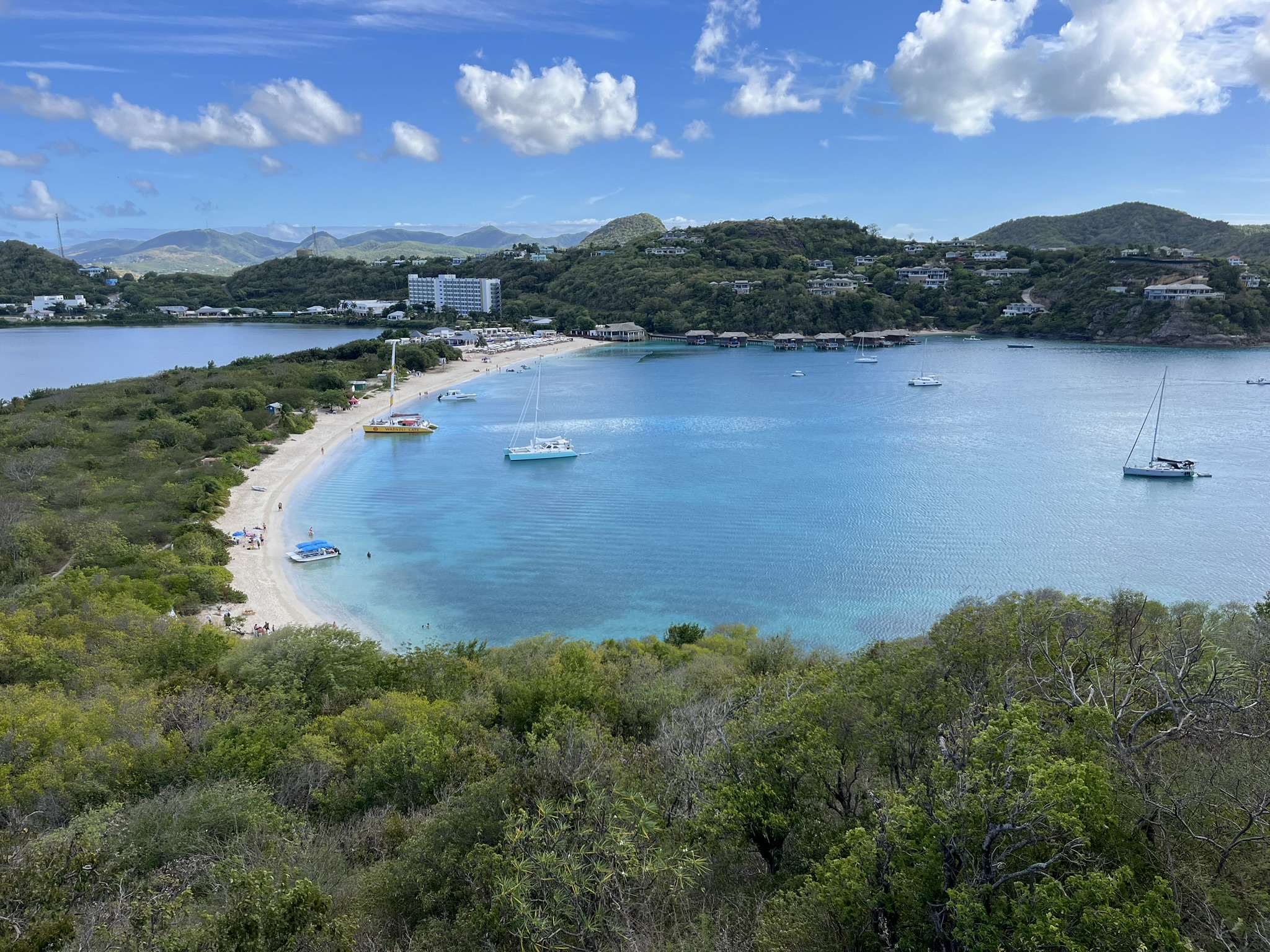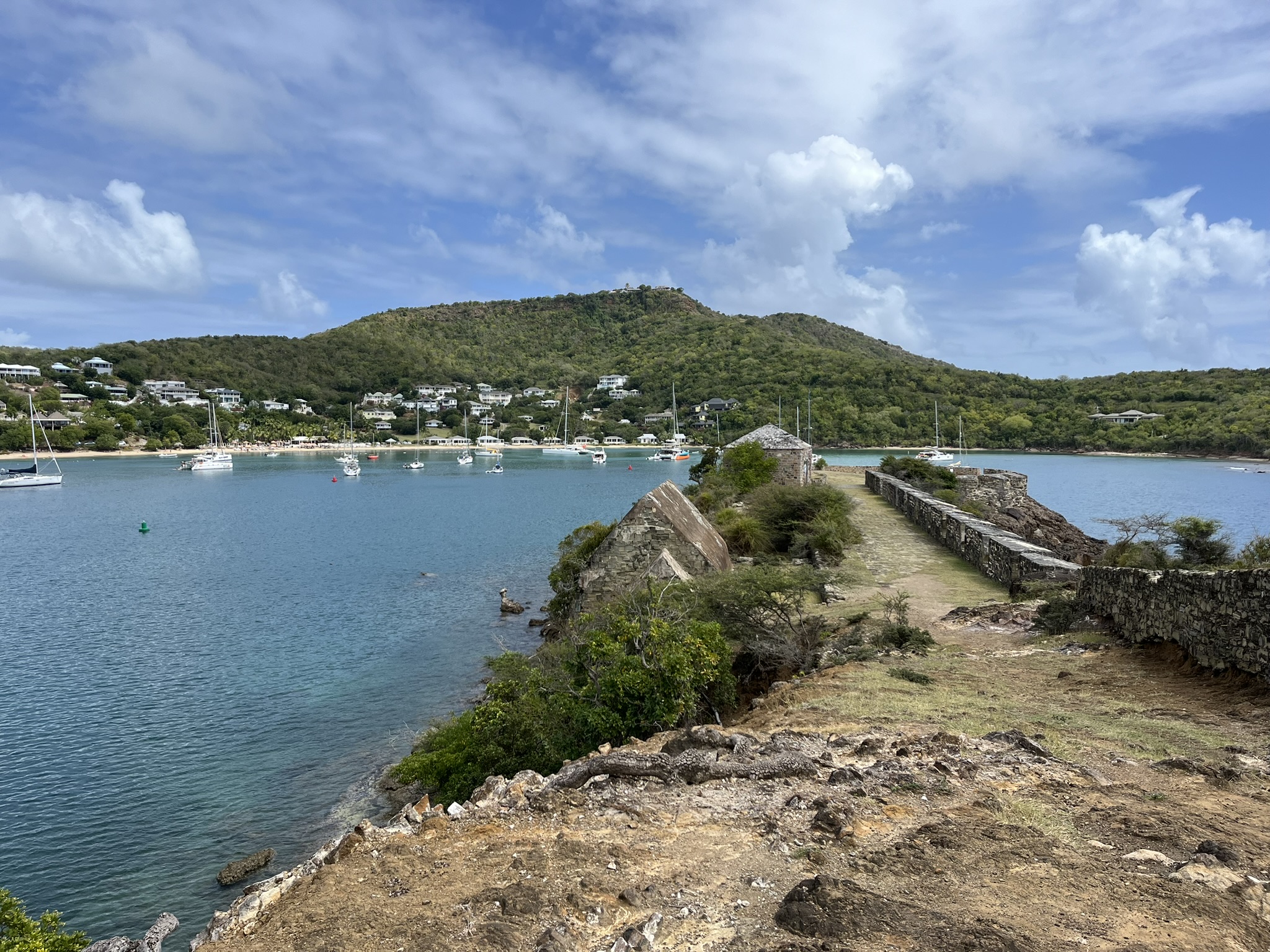 So langsam ist es an der Zeit mal wieder den Platz zu wechseln. Wir fahren ein letztes Mal mit dem Dinghi nach Jolly Harbour rein und gehen zu den Behörden zum ausklarieren. Und so fahren wir am nächsten Morgen noch mal zur Tanke die Wassertanks füllen, und dann geht es das kurze Stück die Küste rauf zur Deep Bay. Kommentare im Netz behaupten das wäre der schönste Strand Antiguas. Ja, wirklich nett, nur die Jettskifahrer nerven ungemein. Die knallen mit einem Affenzahn an den friedlichen Ankerliegern vorbei ohne Rücksicht auf Verluste. Wir gehen erstmal ein paar Runden um das Boot schwimmen und fahren dann zum Strand rüber. An der Seite kann man auf einen Hügel wandern, wo ein altes englisches Fort steht was ca. 250 Jahre alt ist. Von oben hat man einen schönen Blick auf die Bucht. Unser letzter Tag auf Antigua ist wirklich entspannend, wir laufen noch etwas den schönen Strand auf und ab und finden nachher in der Bucht noch ein Wrack wo man schnorcheln kann. An der Stelle schaut nur noch der verrostete Schornstein aus dem Wasser, trotzdem kann man wegen des trüben Wassers nicht viel sehen.