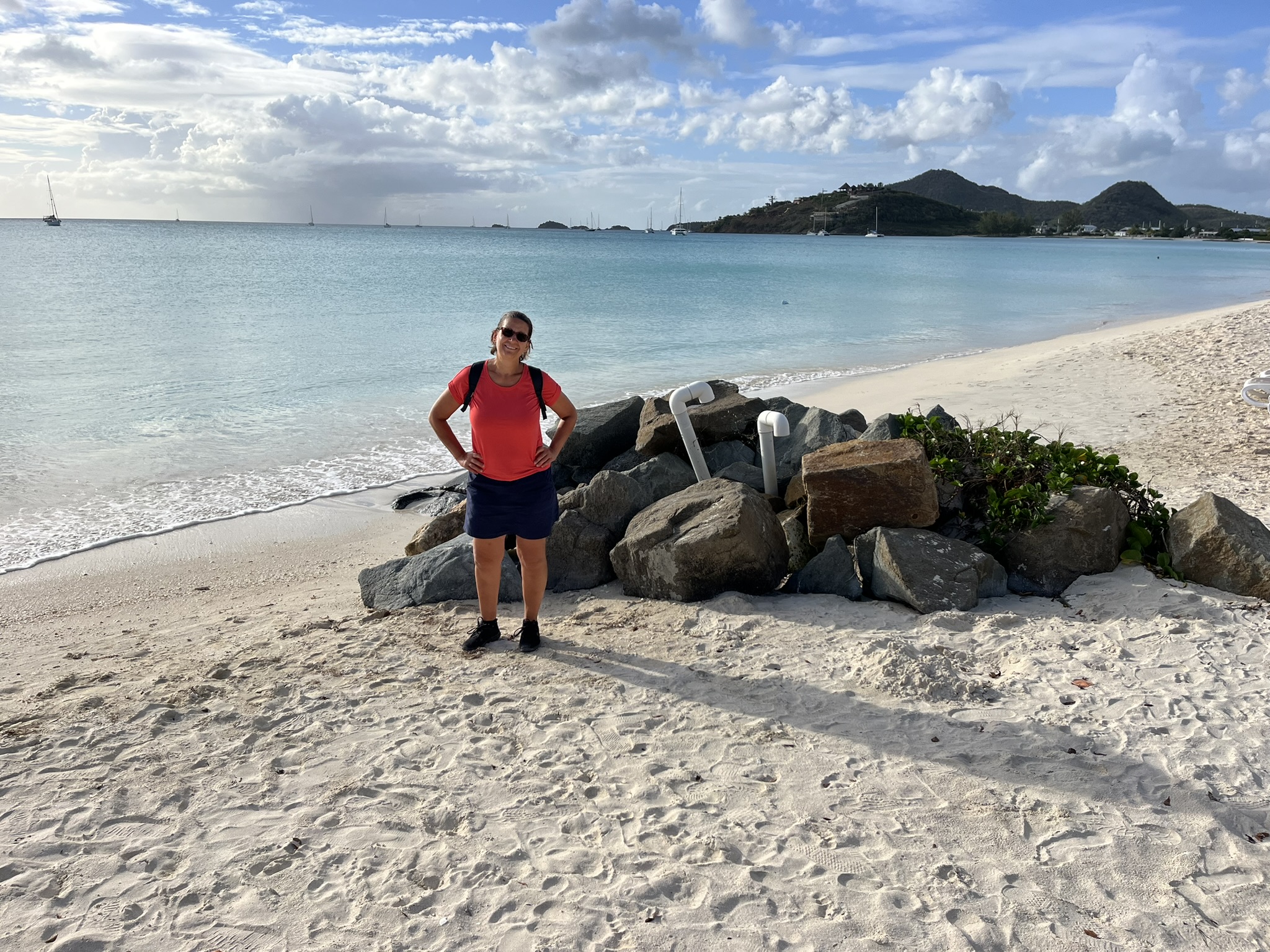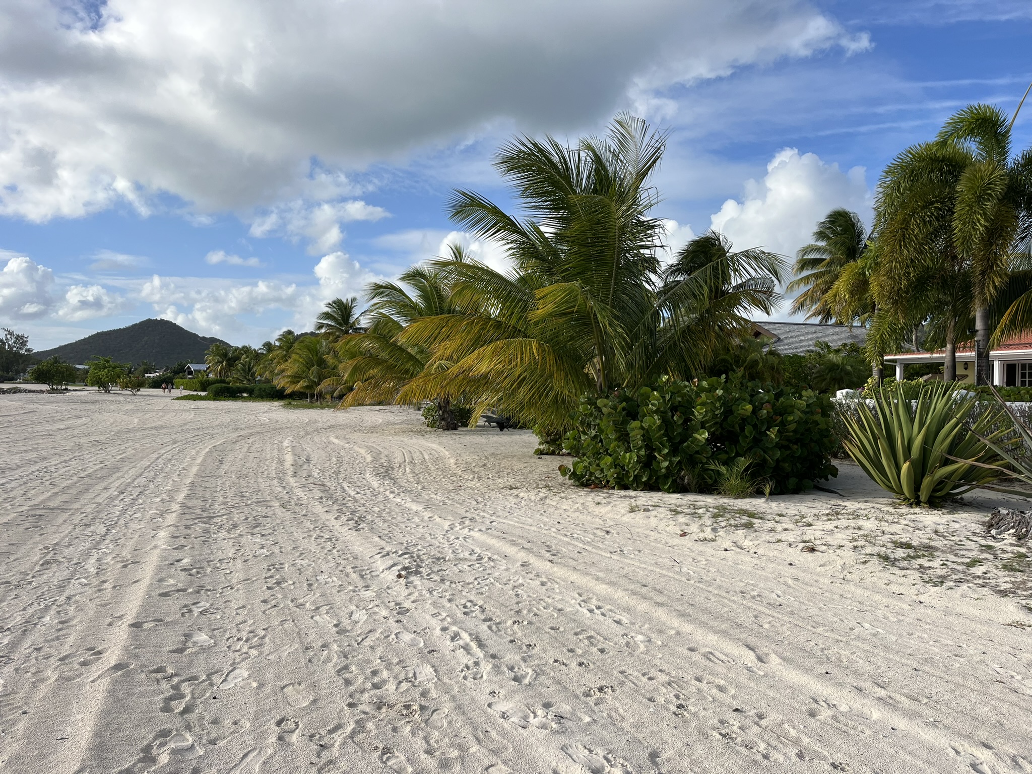 Zurück in Jolly Harbour finden wir auf der östlichen Seite unserer Ankerbucht einen netten Strand. Dort gibt es den ultimativ gepflegten Sand der anscheinend täglich wie ein Tennisplatz abgezogen wird. Das liegt sicherlich an den Villen die direkt hinter dem Strand liegen und ein äußerst exklusives Flair verbreiten.