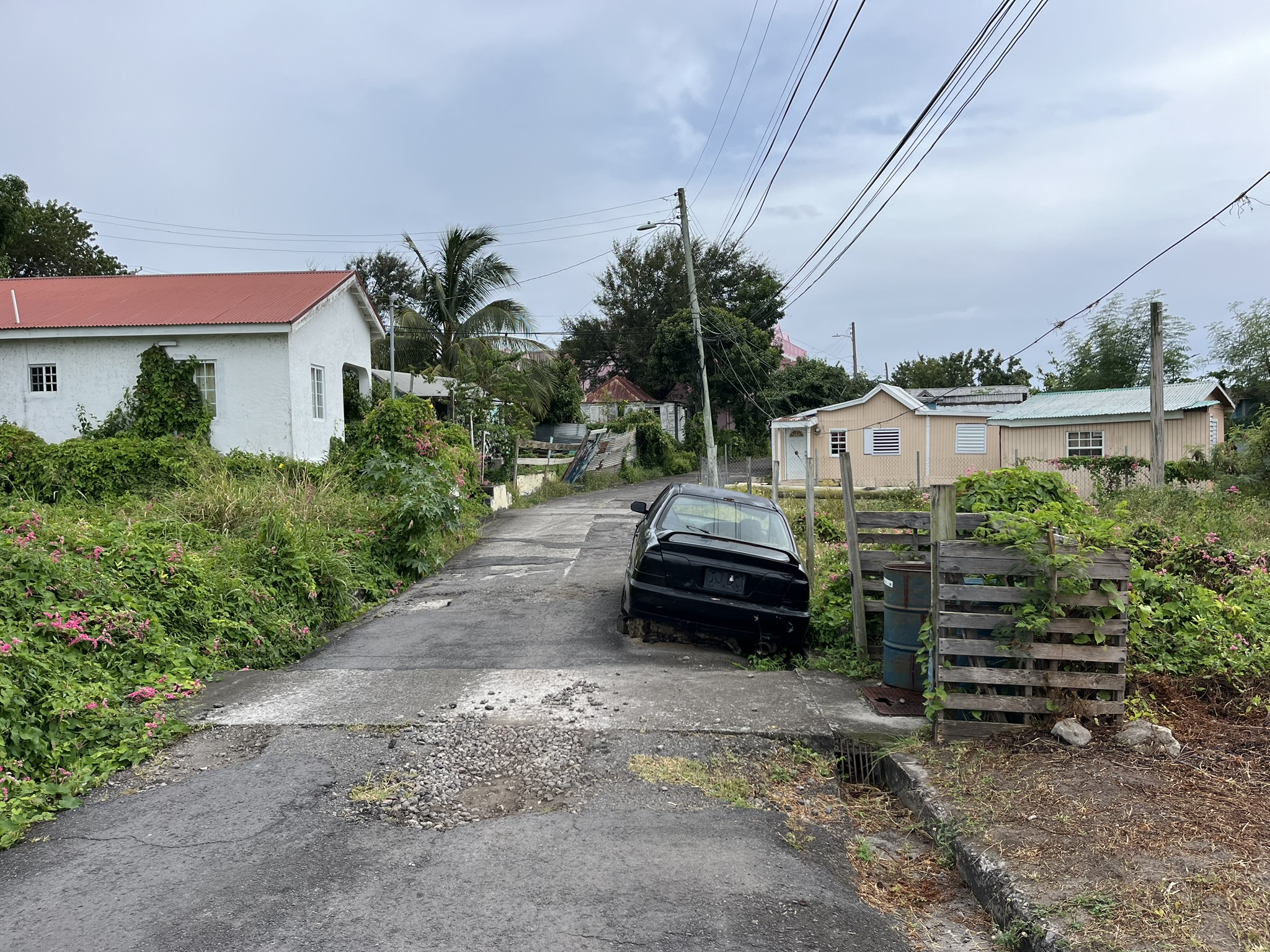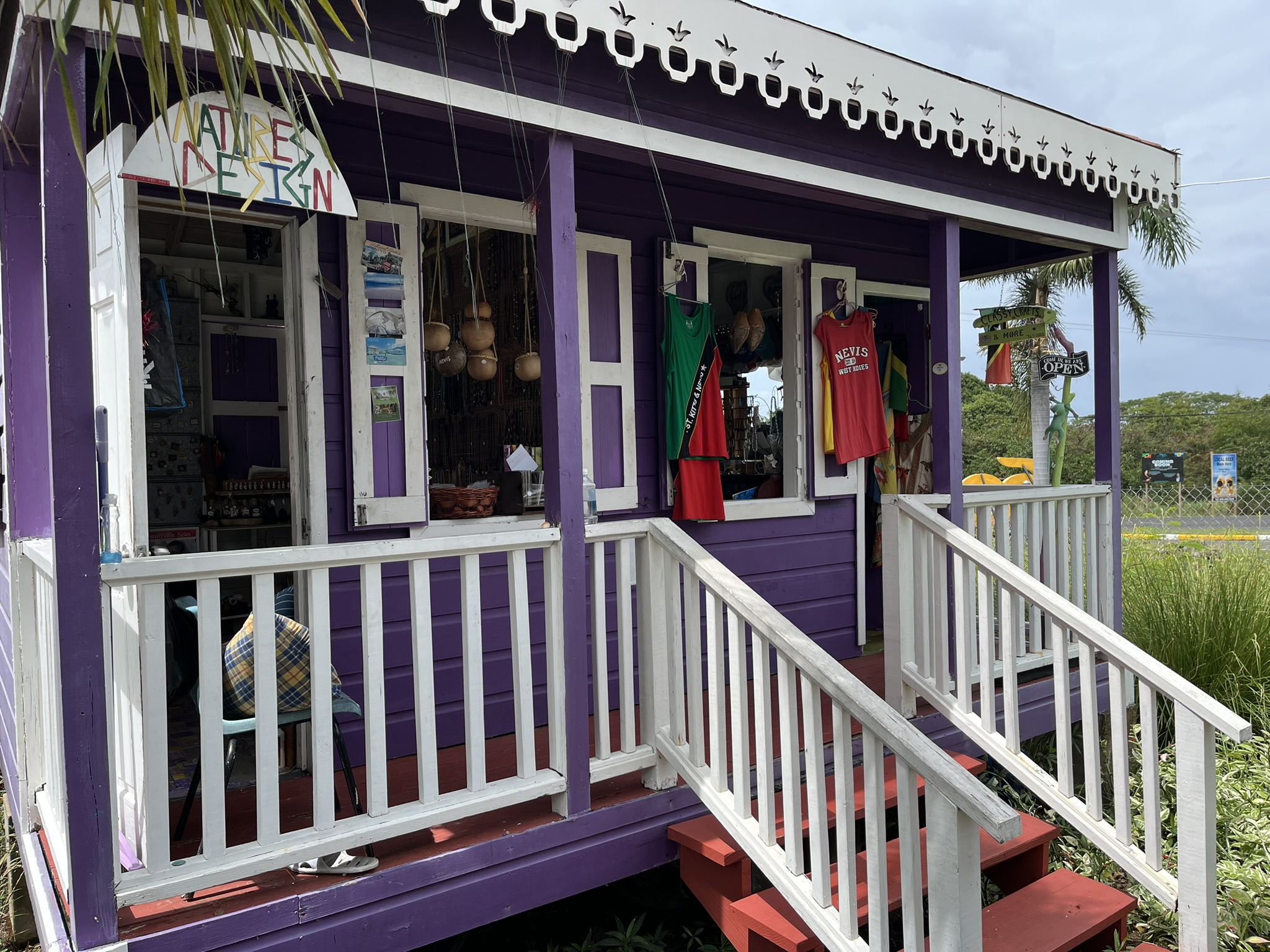 Man kann auch auf den höchsten Berg der Insel den Nevis Peak auf 985m heraufwandern. Das ist ein alter ruhiger Vulkan um den herum sich Regenwald befindet. Wir lassen das aus mehreren Gründen mal sein, erstens ist es durch den vielen Regen wahrscheinlich mehr als nass und matschig, und zweitens sind wir um Moment konditionell nicht in allerbester Verfassung. Wir besuchen stattdessen lieber ein kleines Künstlerdorf mit bunt gestrichenen Häusern und selbstgebasteltem Kunsthandwerk wie Bilder, Körbe, Tücher etc…