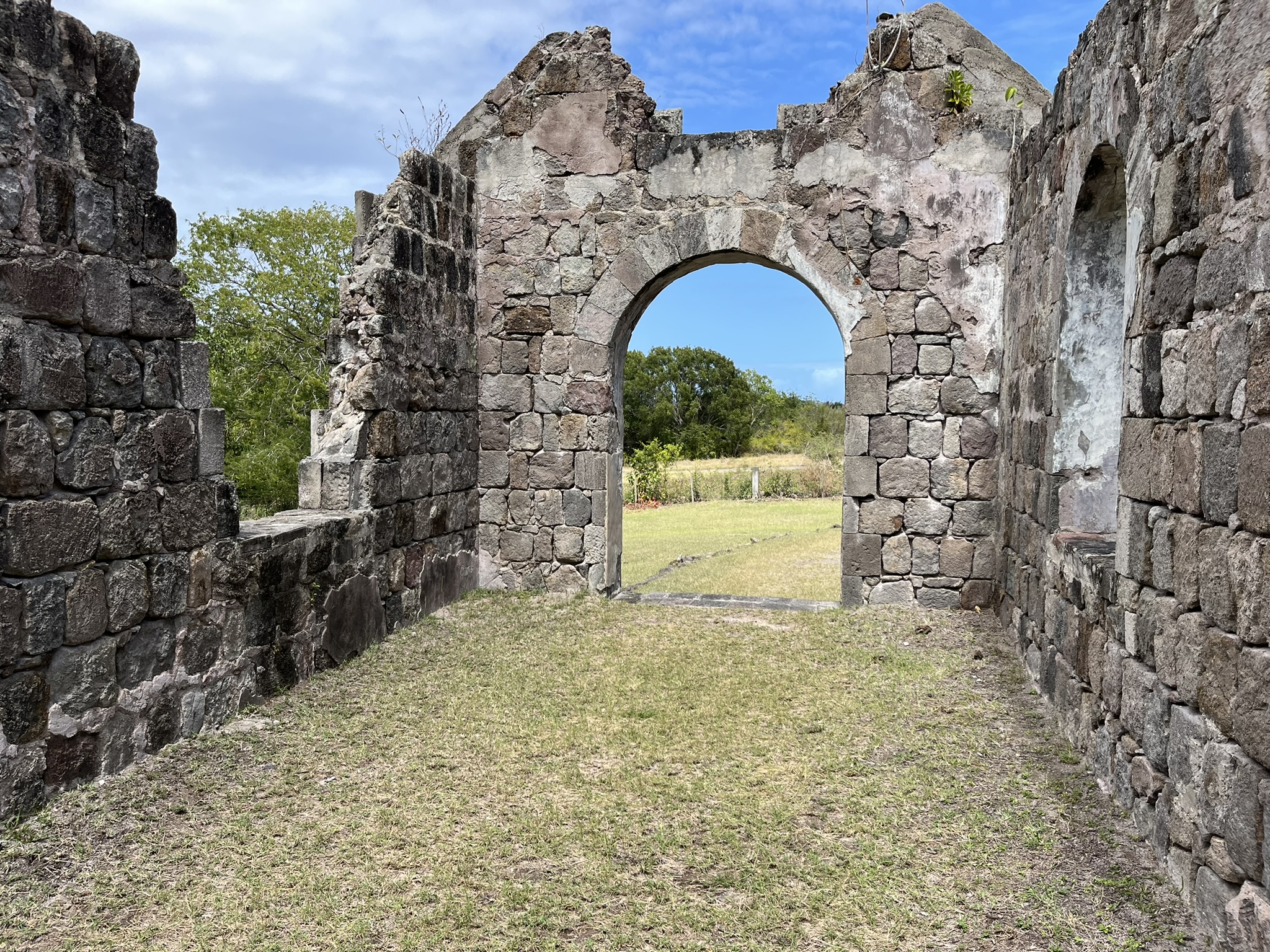 Das nächste Ziel ist im Norden der Insel, eine alte Kirchenruine die viel über die Geschichte der Sklaverei auf der Insel zu erzählen hat. Wir fahren mit einem kleinen Minibus leider etwas zu weit und müssen ein ganzes Stück zurück laufen. Zum Glück hält ein sehr freundliches älteres Ehepaar an und nimmt uns ein paar Kilometer mit zu der Kirche. Die beiden kommen aus Kanada und verbringen die Wintermonate auf Nevis. An den Kirchenruinen gibt es viele Informationstafeln, die über den Bau und die Hintergründe der damaligen Zeit berichteten. Die Kirche wurde vor 200 Jahren von einem englischen Reverend gebaut. Natürlich nicht von ihm selber sondern von seinen Sklaven. Im Prinzip wurde auf der gesamten Insel überhaupt nichts von den englischen Kolonialisten gebaut sondern von deren Sklaven. Der Bau der Kirche fiel in eine Zeit wo die englische Regierung anfing an der Abschaffung der Sklaverei zu arbeiten. Es wurde zum Beispiel verboten neue Sklaven aus Afrika zu verschleppen, was aber nicht heißt, dass damit das Grauen zu Ende war. Dieser Reverend (er wurde als ein „Guter“ dargestellt) hat dann dafür gesorgt, dass die Kirche zum ersten Mal auf der Insel von Schwarzen und Weißen gemeinsam besucht werden durfte. Wir sind unsicher, ob das Schicksal der Sklaven auf den Inseln ausreichend dargestellt wurde. Insgesamt war es aber interessant, dass es überhaupt mal thematisiert wurde. Von den heutigen Inselbewohnern stammen fast 90% von den Sklaven ab.