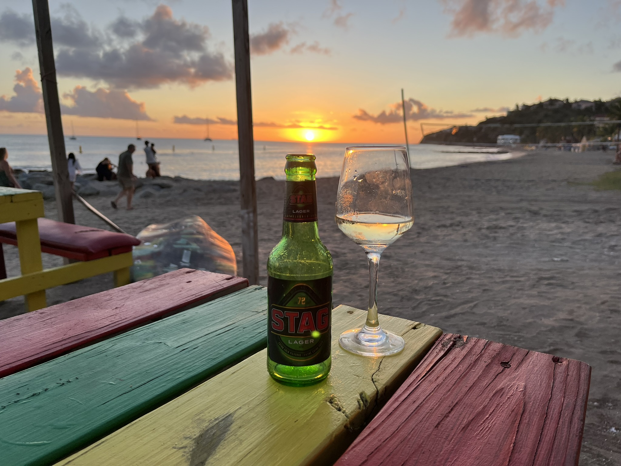 Nach dem Besuch von Nevis fahren wir eine Stunde hinüber auf die Hauptinsel St. Kitts und ankern in der sehr schönen Fregat Bay. Es gibt auch hier einen schönen weißen Strand mit einigen Reggae Bars. Wir gönnen uns mal ein paar Drinks in so einer Bar und genießen den Sonnenuntergang, sehr romantisch.