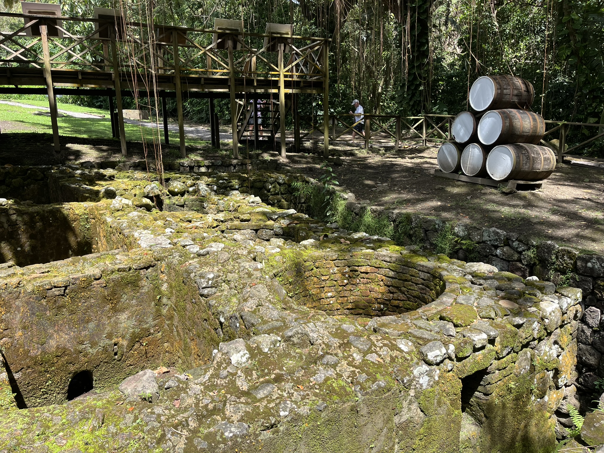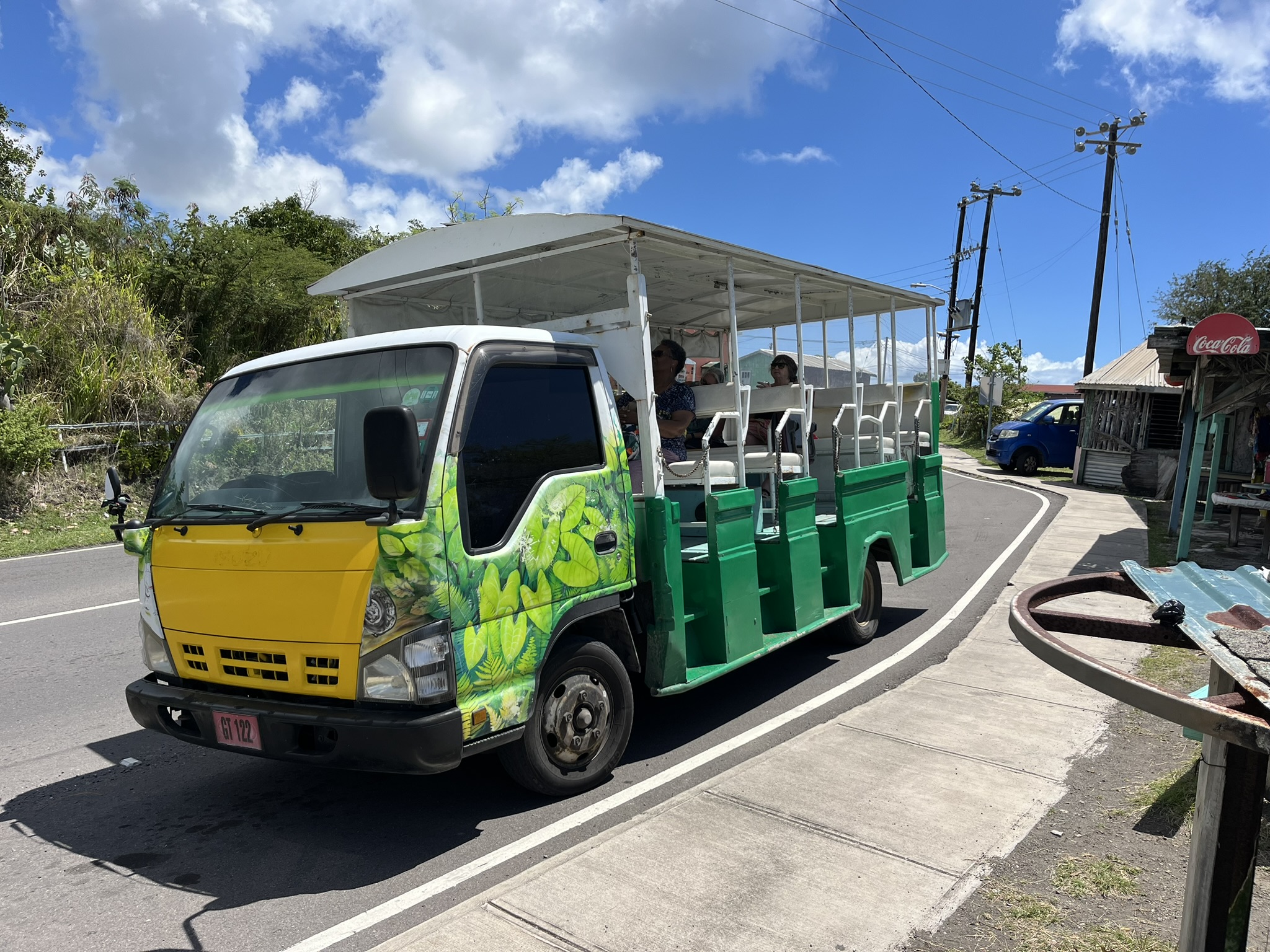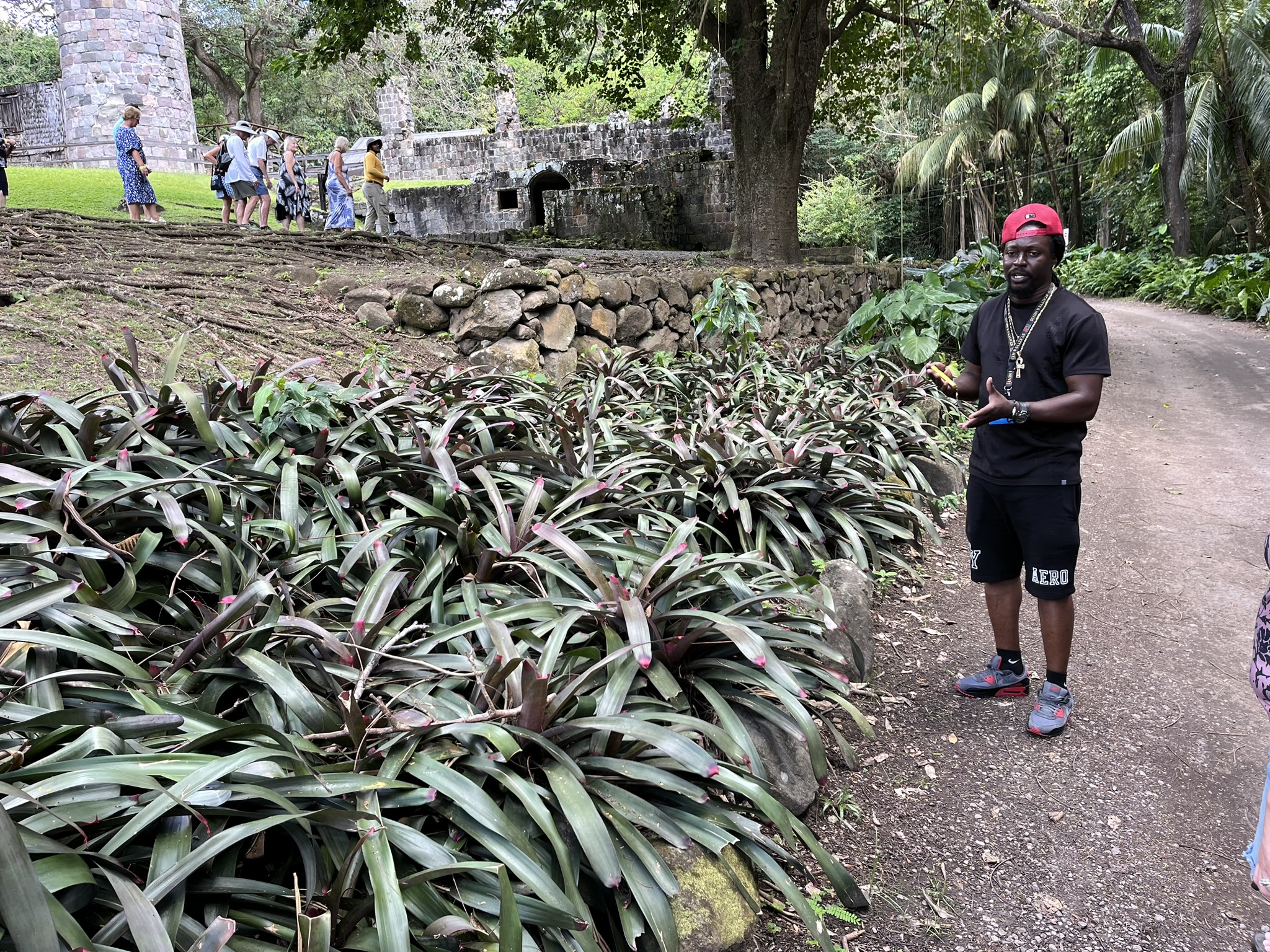 Wir fahren mit dem Bus in die Hauptstadt Basseterre und werden dort von Typen angesprochen, die Touren über die Insel anbieten. Zum ersten Mal auf unserer Reise gönnen wir uns das, und befinden uns direkt in einer Gruppe von amerikanischen Kreuzfahrttouristen in einem bunten offenen Bus. Die Tour geht in den Norden in den Regenwald. Wir halten an diversen Punkten an, und der Guide erzählt viele Dinge über Flora und Fauna der Insel. Auch die schrecklichen Zeiten während der Kolonialisierung kommen nicht zu kurz. Zu diesen Zeiten wurden noch Zuckerrohrfelder von den Sklaven beackert um anschließend daraus Rum herzustellen. Wir besuchen die Ruinen einer Rumbrennerei im Regenwald die schon vor 300 Jahren in Betrieb war. Wir durften auch mal Rumpunsch probieren, also Rum mit leckerem Fruchtsaft. Wir lassen uns von dem Bus in der Nähe unserer Bucht absetzen und sparen so noch den Rückweg von Basseterre.