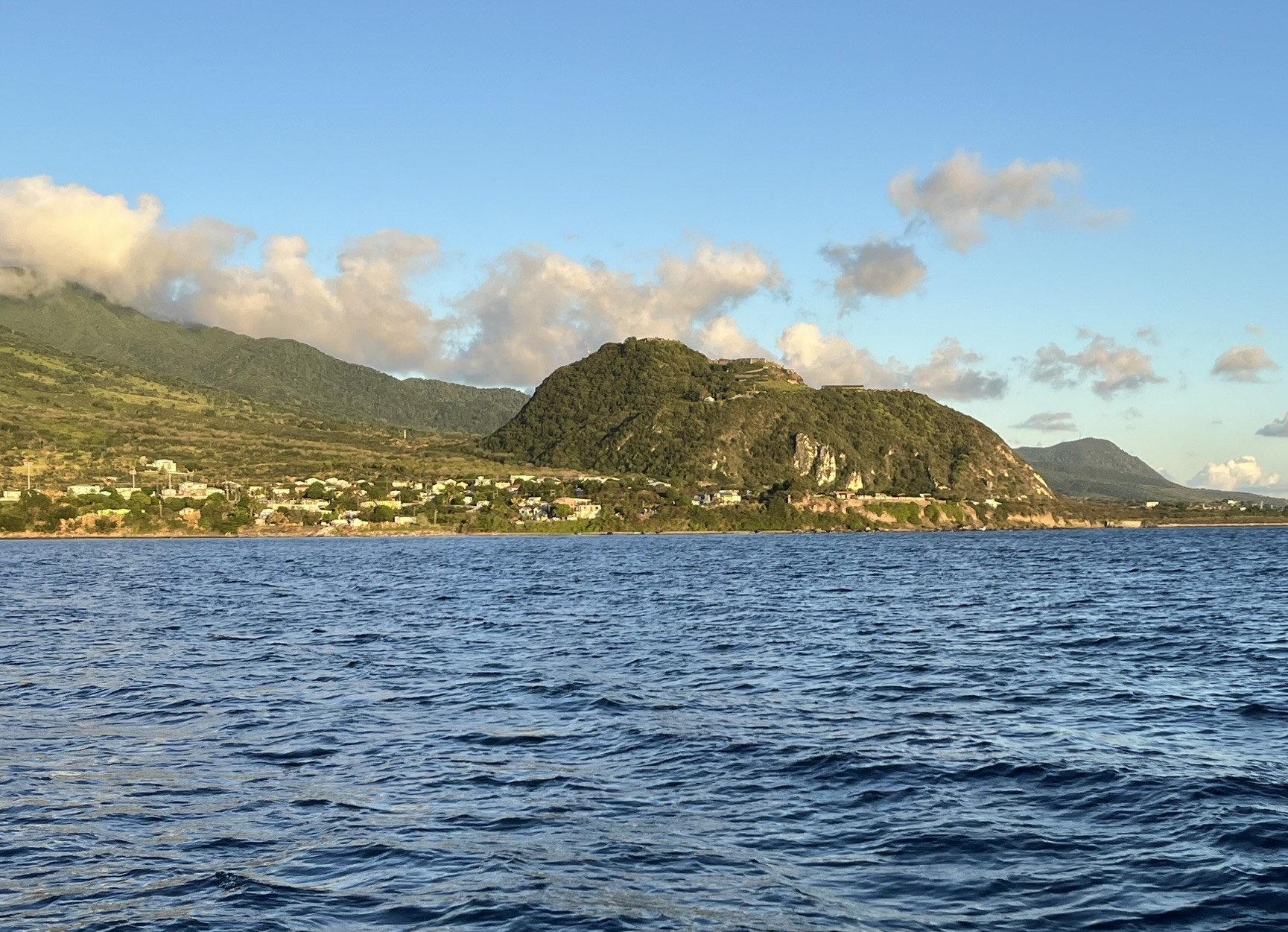 St. Kitts und Nevis gehört zu den 12 kleinsten offiziell anerkannten Staaten der Welt, und hat gerade mal 51.000 Einwohner. Die beiden Inseln liegen direkt nebeneinander und lassen sich beide per Segelboot besuchen. Wir sind sehr gespannt was uns erwartet. Der Wecker klingelt erbarmungslos um 06.00, da wir noch im Hellen ankommen möchten. Die Fahrt ist unspektakulär bis auf unseren erneuten Angelversuch. Plötzlich rauscht die Kurbel mit Schwung raus und dann kommt ein Knack, die Rute ist tatsächlich gebrochen. Da hat anscheinend der große unbekannte Riesenfisch angebissen und auch direkt wieder losgelassen.