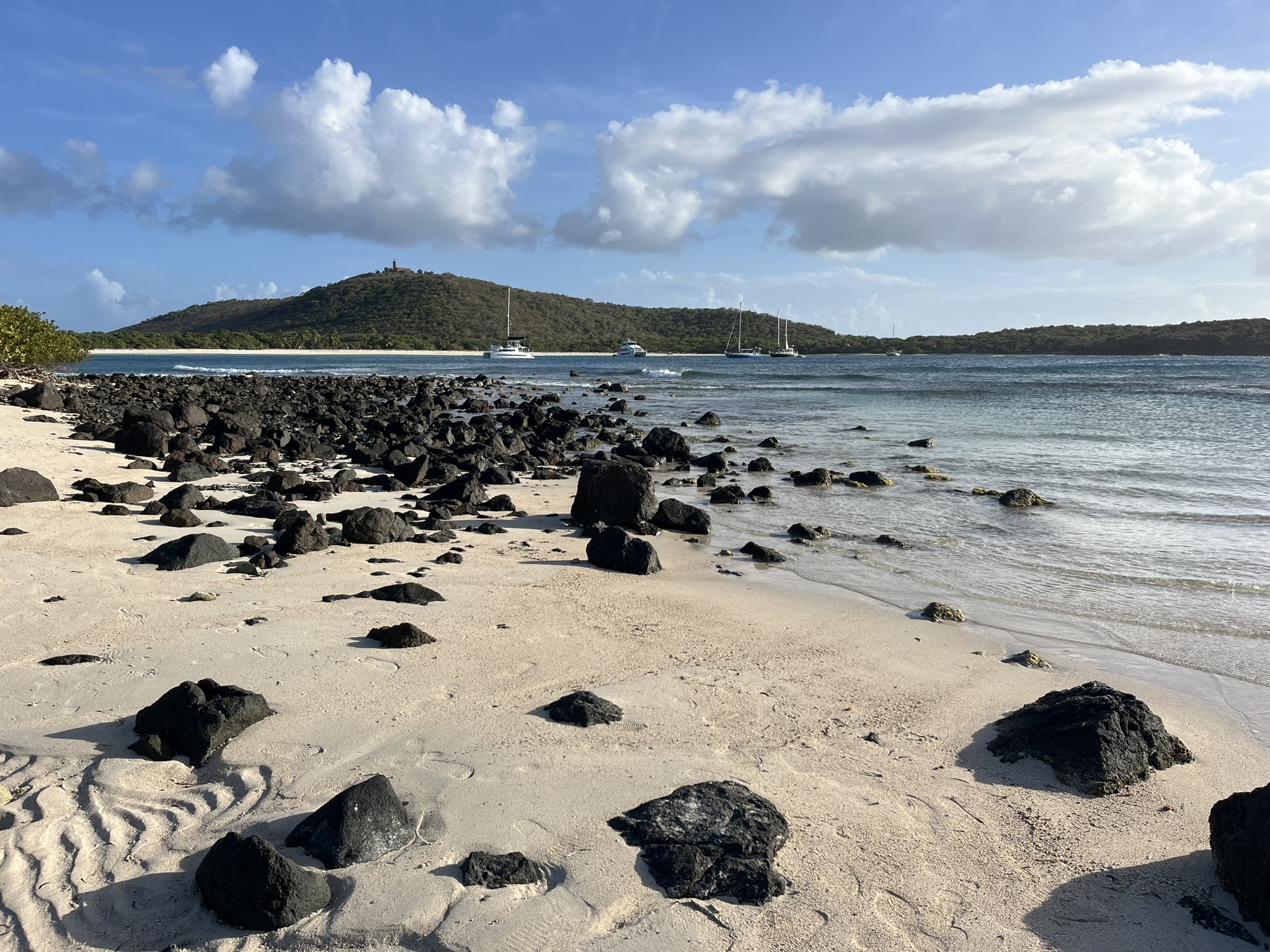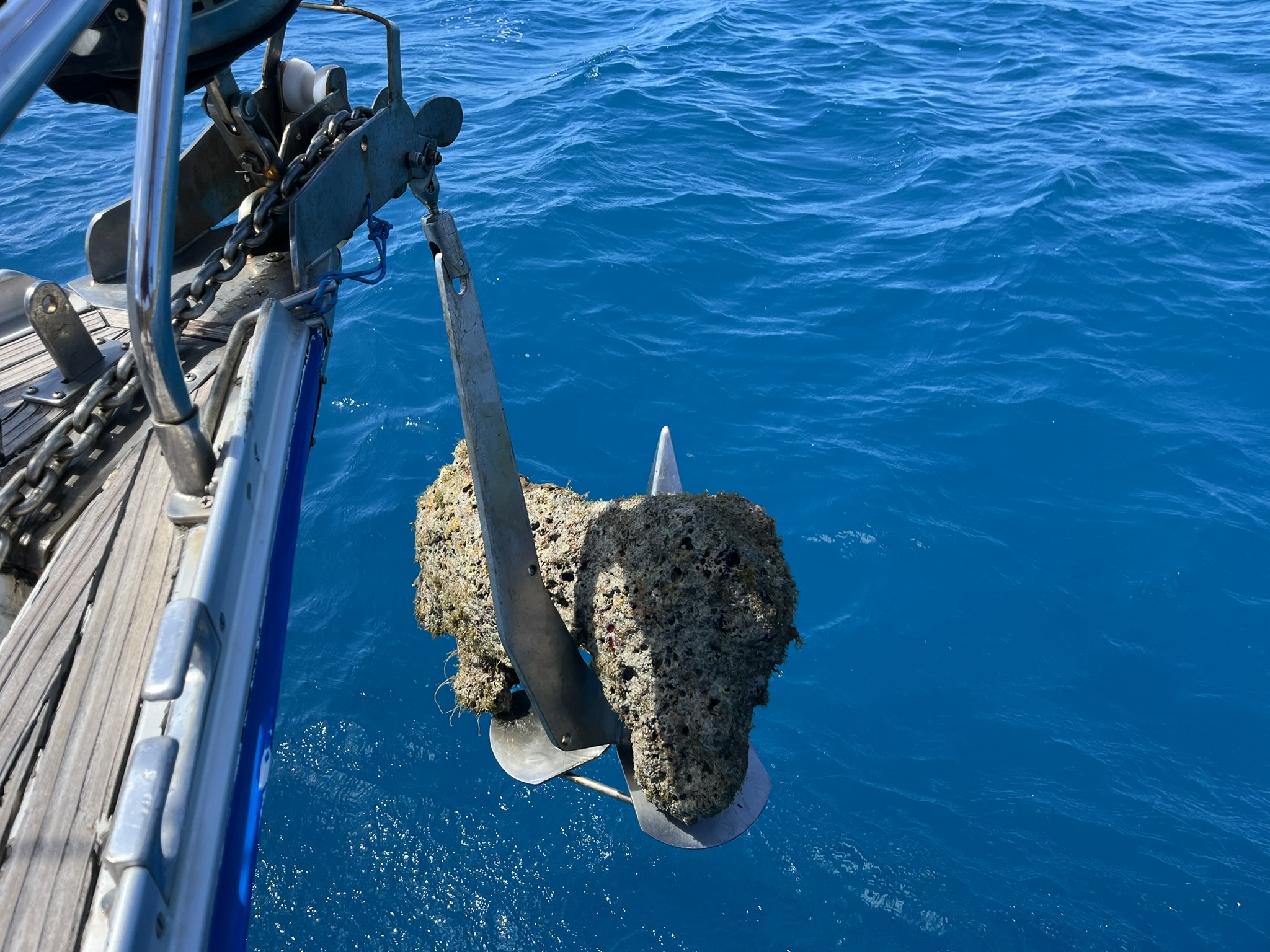 Wir frühstücken gemütlich und holen dann den Anker hoch um nach Culebra zu fahren. Die Ankerwinsch macht auf den letzten Metern sehr komische Geräusche, und wir befürchten schon dass sie anfängt das Zeitliche zu segnen. So schlimm ist es dann doch nicht, sondern sie holt einen wirklich ordentlichen Stein nach oben der sich im Anker verkeilt hat. Der Stein sitzt so fest, dass er sich durch schubsen oder schütteln nicht bewegen lässt. Wir binden auf der Rückseite des Ankers ein Seil fest was an Deck auf der Klampe festgemacht wird. Dann lassen wir den Anker wieder runter was dazu führt, dass er nach vorne kippt und der Stein aus seiner Umklammerung rausfällt. Glück gehabt, jetzt können wir die 7h nach Culebra mit Verzögerung starten.