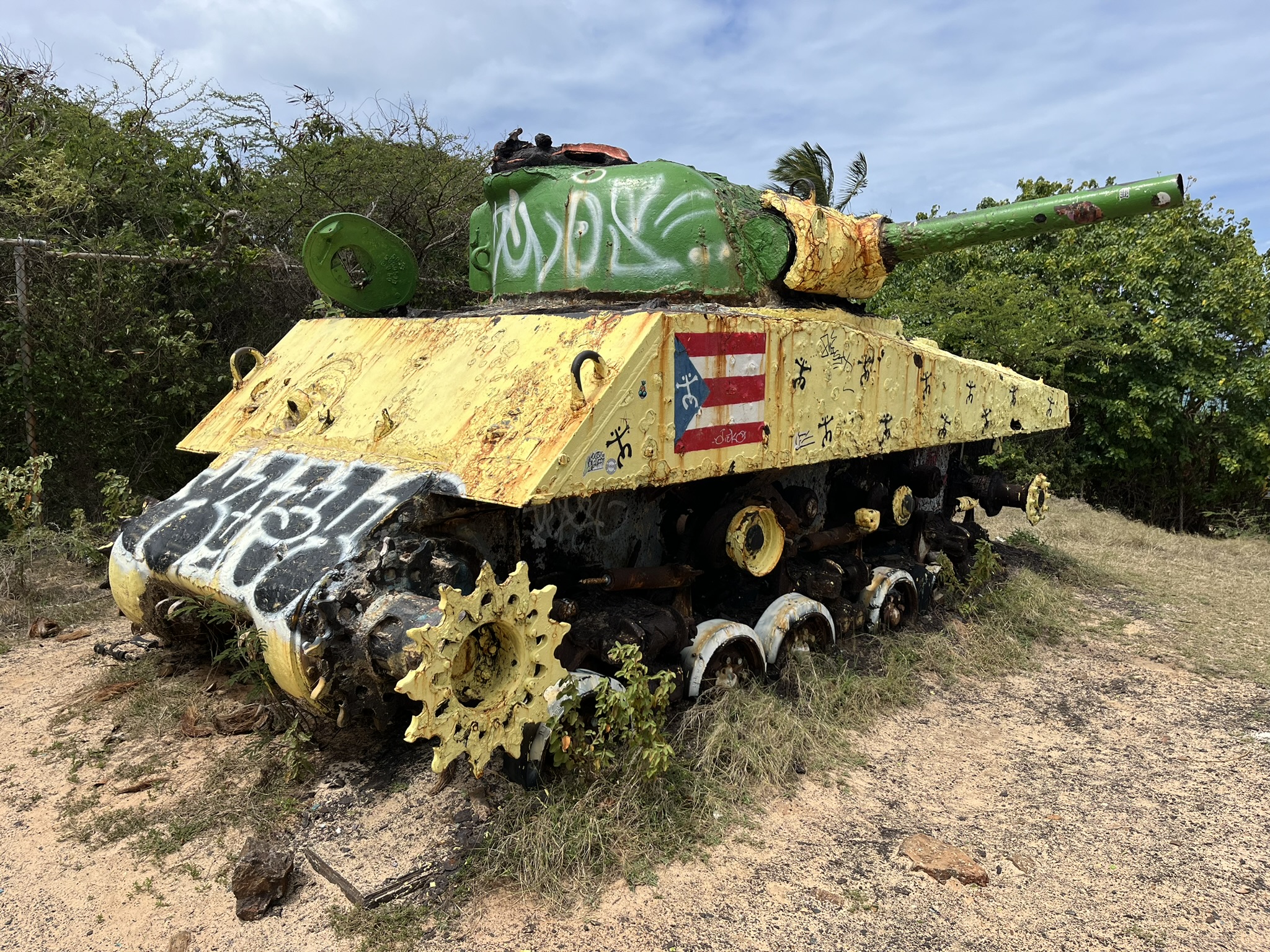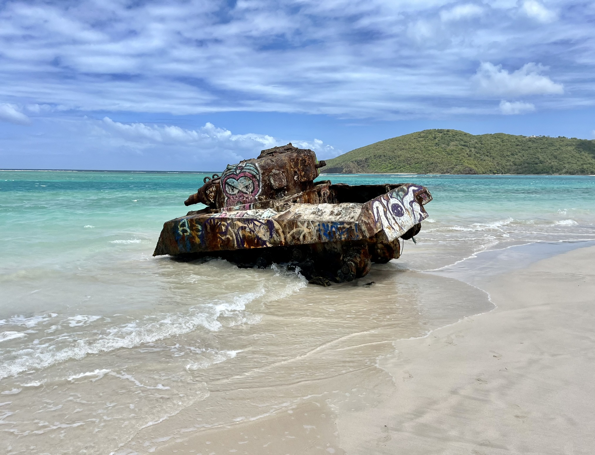 Dann wollen wir mal schauen was Culebra so zu bieten hat. Die Insel hat gerade mal 1200 Einwohner und lebt ganz gut vom Tourismus. Das wiederum liegt vor allem an ein paar Traumstränden die es hier gibt. Der bekannteste ist der Flamenco Beach an der Nordseite der Insel. Wir müssen mal wieder die Beine etwas auf Touren bringen und laufen eine gute Stunde dorthin. Der Strand wird regelmäßig in die Liste der schönsten Strände der Welt aufgenommen. Der Nachteil an so berühmten Stränden ist leider, dass sie nun mal auch relativ gut besucht sind. Trotzdem ist es beeindruckend, der Strand geht sichelförmig um die ganze Bucht und das hellblaue Wasser und die Korallen entsprechen jedem Karibikklischee. Auffällig sind zwei alte Panzer die am Strand und in den Dünen stehen. Die wurden vor über 50 Jahren von der US-Armee, die auf der Insel für den Vietnam Krieg geübt hat, dort stehen gelassen. Heute sind die Dinger bemalt und dienen als Fotomotiv. Auf dem Rückweg haben wir Glück, eine nette ältere Dame hält mit Ihrem schicken Jeep an und nimmt uns in den Ort mit zurück.