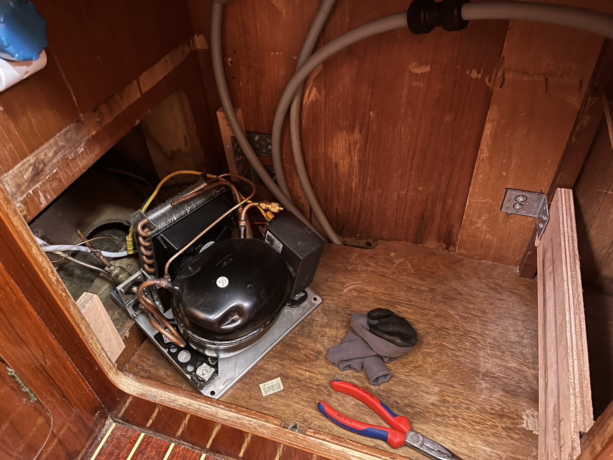 Zwischendurch sind wir auch produktiv. Der Lüfter von unserem Kühlaggregat geht nicht mehr, was zu einem ziemlich heißen Kompressor führt. Der Skipper baut das Teil aus und findet tatsächlich ein loses Kabel. Das ist doch immer das Beste wenn es so einfach ist. Nur das der Kühlapparat anschließend nicht mehr anspringt war nicht der Plan. Wir werden ziemlich nervös, weil ohne Kühlschrank bei der Hitze geht garnicht. Nach einigem Gefummel am Thermostat springt er plötzlich wieder an, und der Lüfter geht auch wieder, hoffentlich bleibt das auch so.
