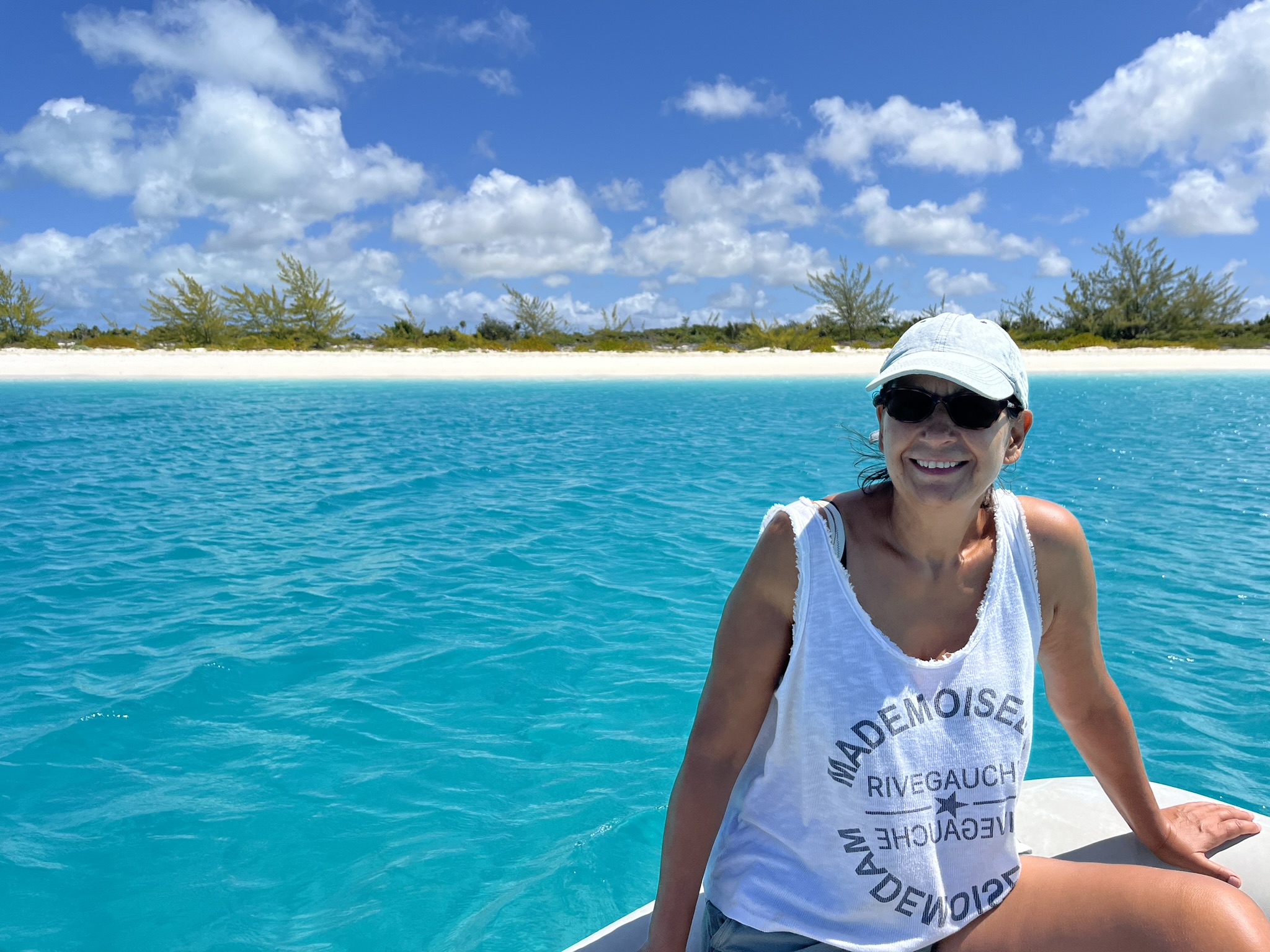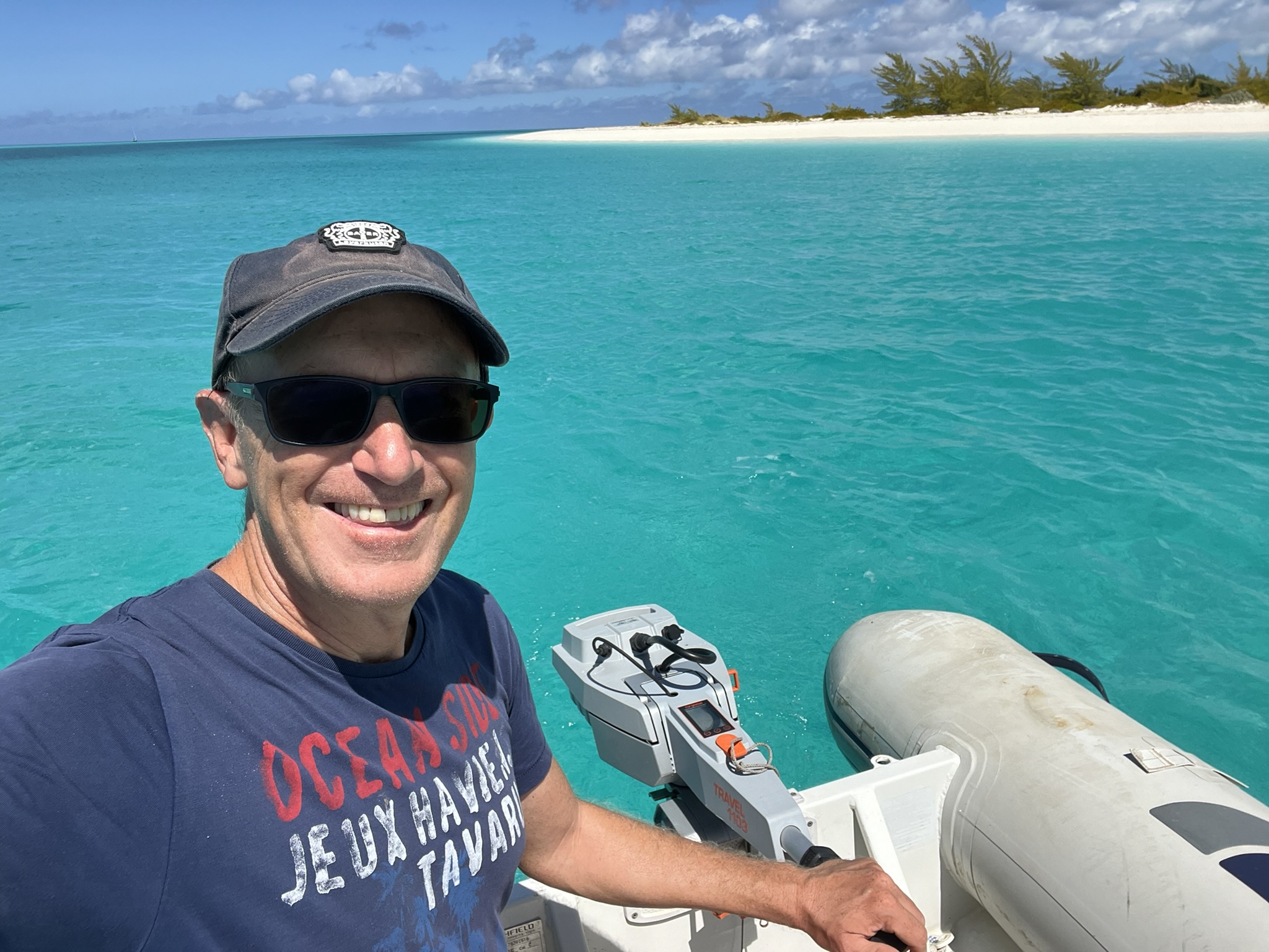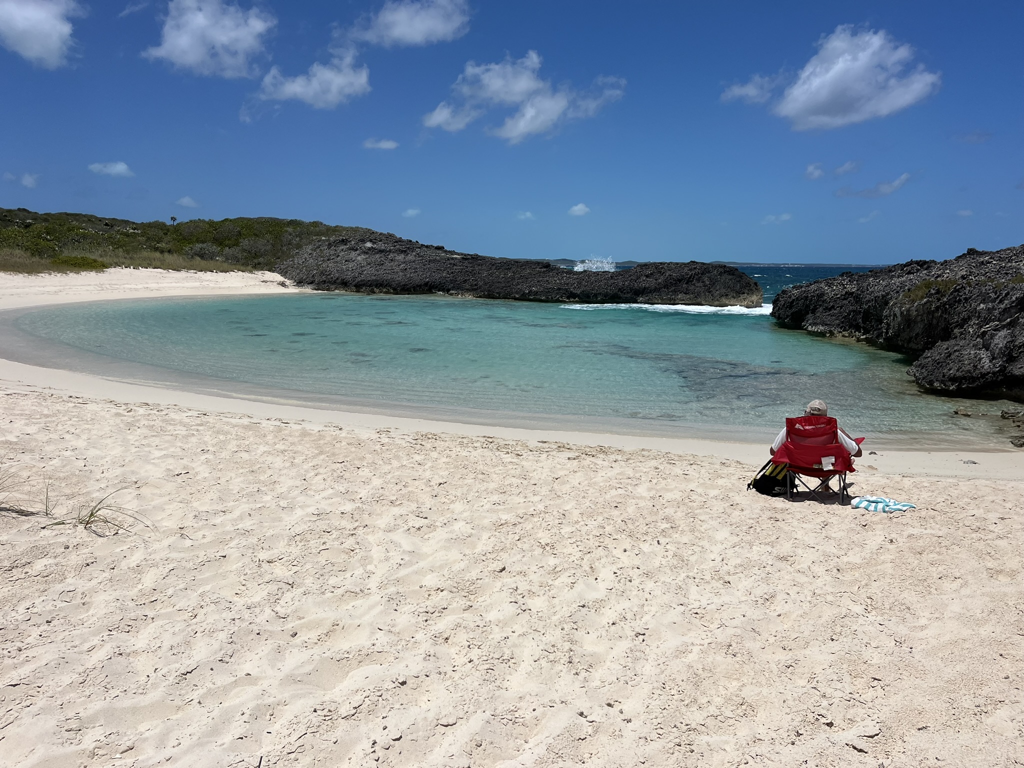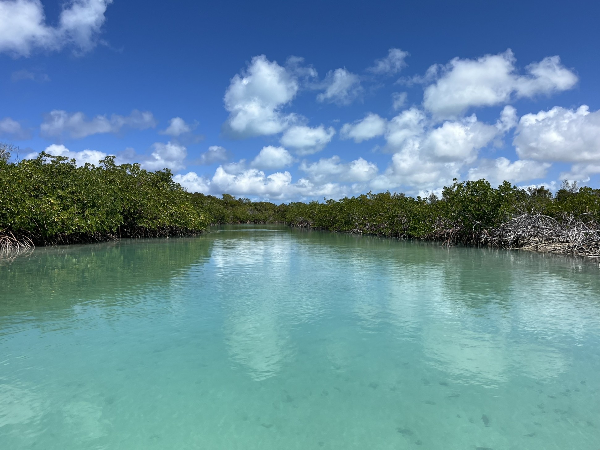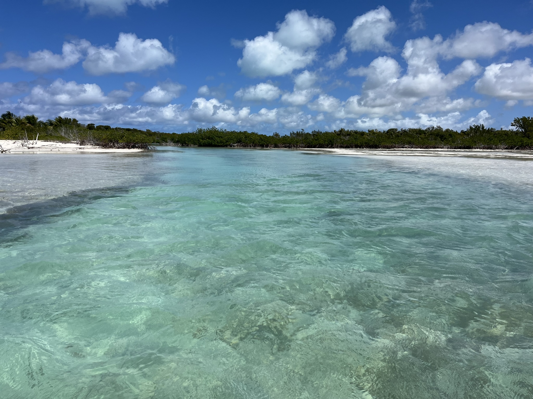 Unser Ankerplatz vor Crooked Island ist ausgesprochen einsam. Das letzte andere Boot vor Ort macht sich gerade auf den Weg, und so sehen wir weit und breit niemanden mehr. Und das soll auch den ganzen Tag so bleiben. Wir liegen wegen des flachen Wassers fast 800 m vom Land weg und kämpfen uns mit dem Beiboot durch die kabbelige See bis zum Strand. Dort gibt es rechts eine Öffnung in der Lagune, hinter der man bei relativ starker Strömung in einen kleinen Fluss hineinfahren kann. Dort sind wieder dichtverwurzelte Mangroven, die eine wunderbare Ruhe ausstrahlen. Wie in der Dominikanischen Republik fahren wir geräuschlos mit dem E-Außenborder durch die Landschaft. Zurück Richtung Strand landen wir sportlich, wie immer, mit Schwung an und ziehen das Boot hoch. Der Bewegungsdrang ist groß, und wir laufen kilometerweit diesen Traumstrand entlang. Es ist wirklich unglaublich, wir treffen keinen einzigen Menschen, und auch andere Zivilisationsrückstände, wie Müll oder Sonstiges, gibt es nicht. Wir planschen im hellblauen Wasser und liegen am weißen Strand. Dieser Ort toppt wirklich jedes Karibikklischee. Wir finden beide, dass heute einer der beeindruckendsten Tage unserer Reise war.