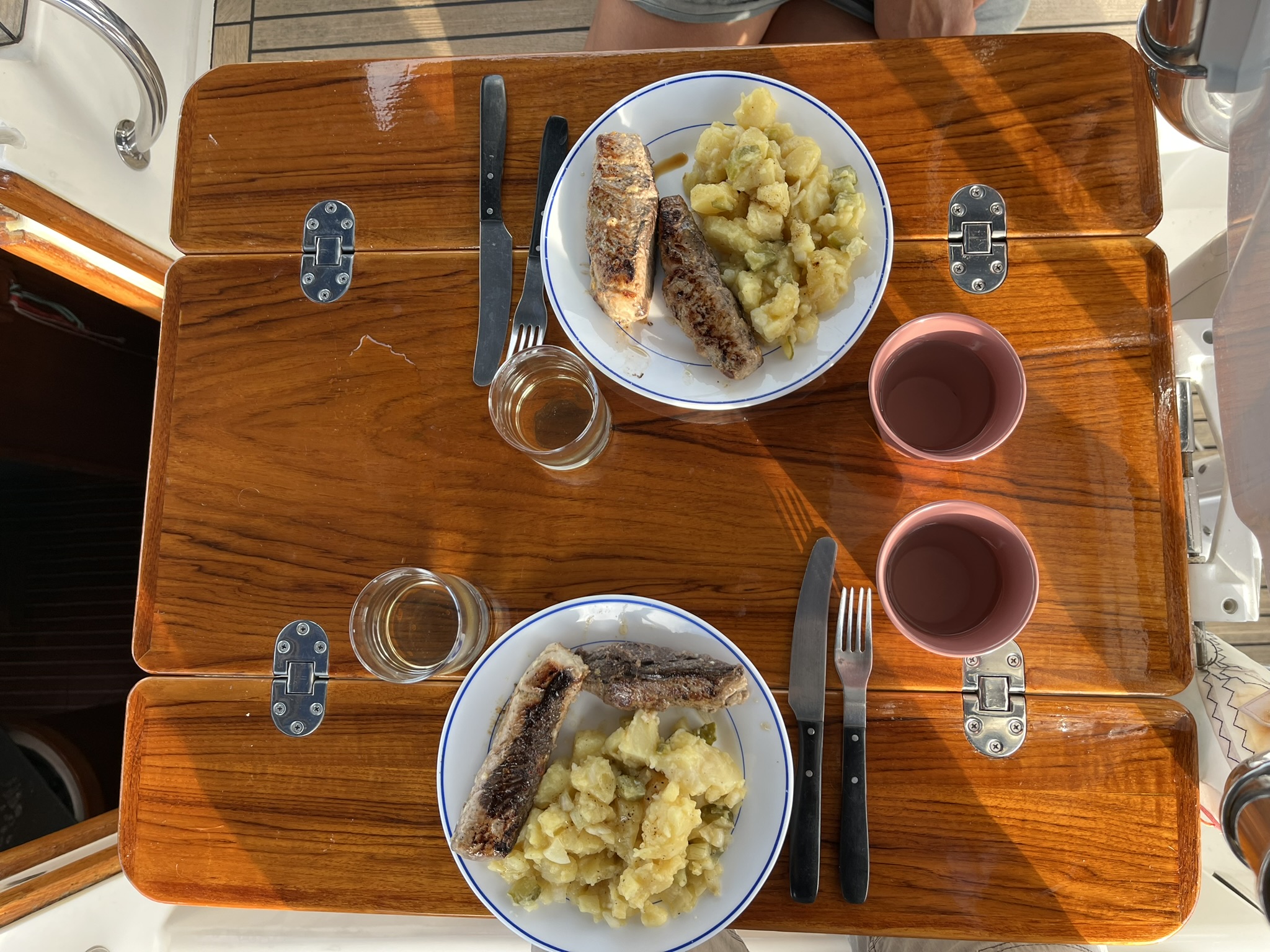 Der Wind für den nächsten Tag stimmt, und so machen wir uns früh auf nach Clarence Town, einem kleinen Ort auf Long Island. Die Entfernung ist etwa 45 sm, und wir freuen uns, mal nicht in die Nacht hinein fahren zu müssen. Unterwegs fangen wir mal wieder einen Fisch (Bonito), aus dem wir vier ordentliche Steaks hinausbekommen. Vor Clarence Town gibt es eine große Bucht, in der schon 8 andere Boote ankern. Auch hier ist der Weg an Land recht weit, und das Wasser ist unruhig. Leider darf man hier in der Bucht nicht schwimmen, da es in letzter Zeit zu einigen Unfällen mit Haien gekommen ist. Die Fischer schmeißen schon mal die Abfälle ins Wasser, was die Tiere nun mal anlockt. Der Ort Clarence Town besteht neben verstreuten Wohnhäusern aus einer Marina, zwei Restaurants, Ericas Bäckerei und zwei Kirchen. Zur Feier des Tages, gehen wir ausnahmsweise mal in der schicken Marina essen.