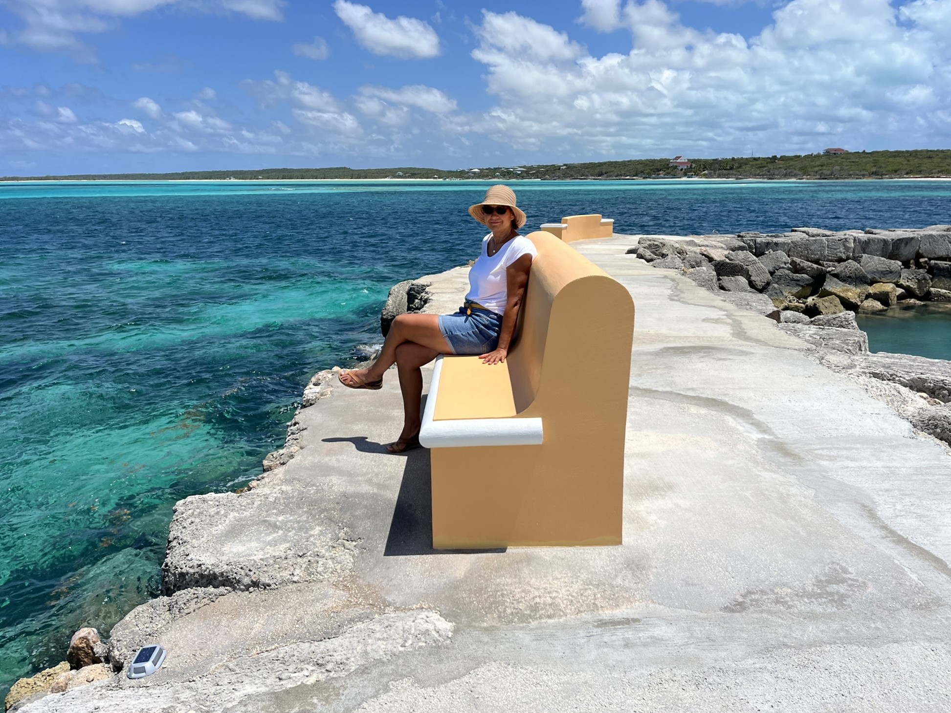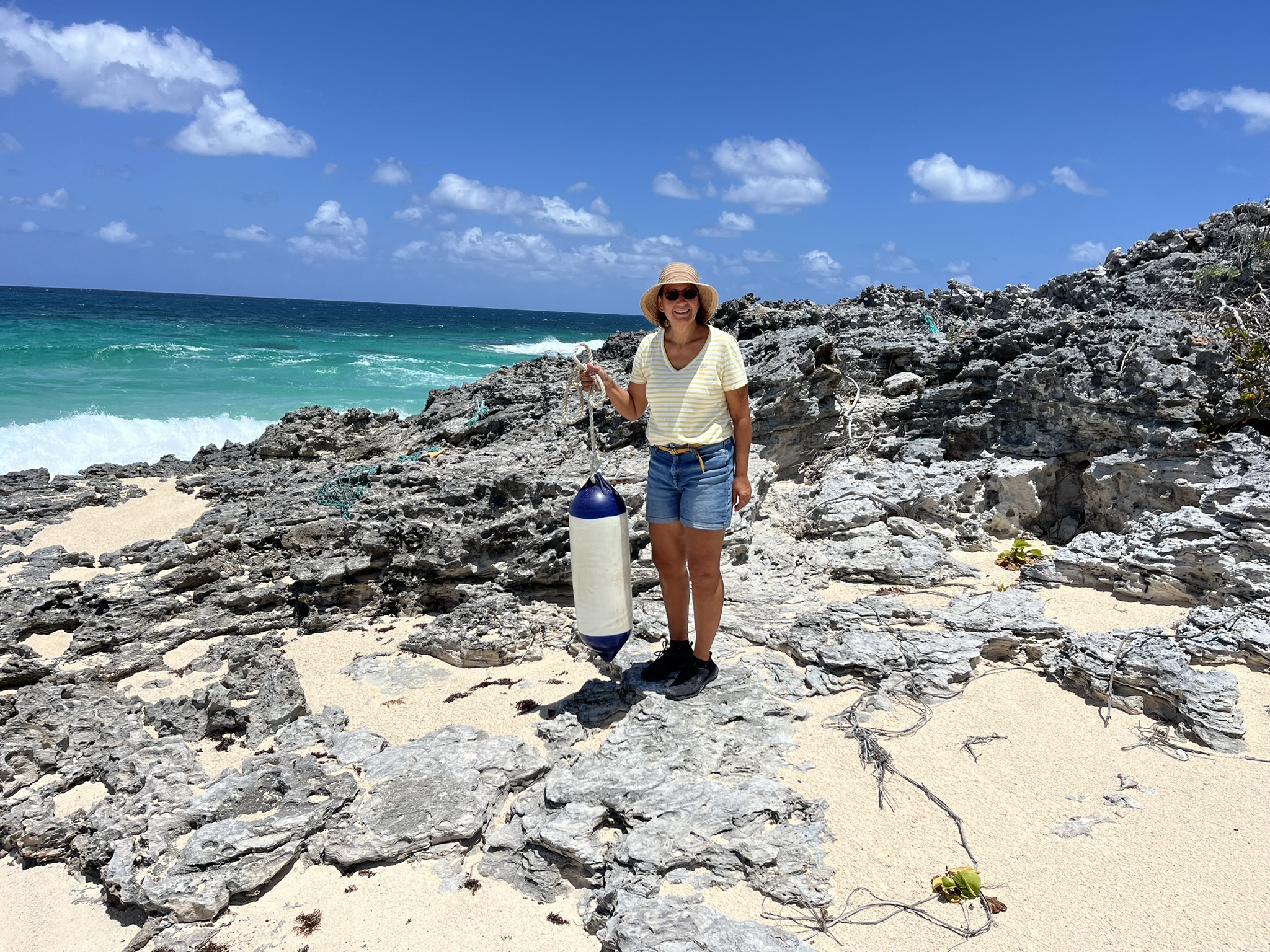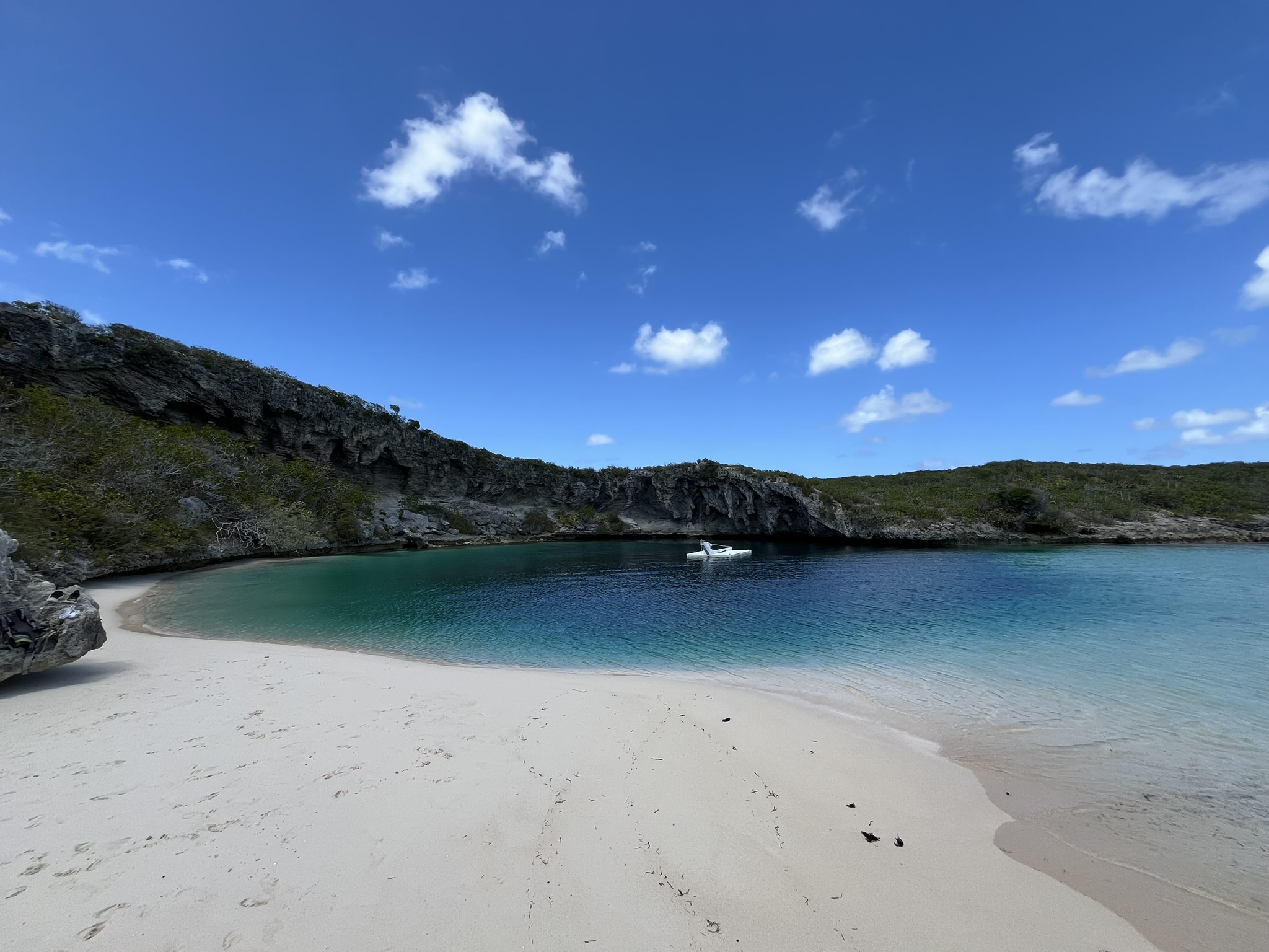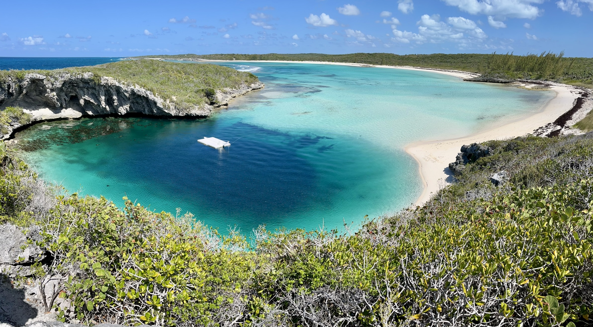 Heute wollen wir eine kleine Attraktion besuchen, Dean’s Blue Hole. Wir gehen gute 5 km den Strand entlang, über Stock und Stein bzw. Klippen. Eine schöne Bucht folgt auf die nächste, mit der leider negativen Begleiterscheinung von ziemlich viel angeschwemmtem Plastik und Netzen. Das Meiste ist anscheinend von Fischern ins Meer geworfen. Ein Fundstück nehmen wir mit, einen fast neuen Fender, den wir gut gebrauchen können. Dean’s Blue Hole ist beeindruckend. Es ist das dritttiefste Blue Hole der Welt, mit 202 Metern, und liegt am Ende einer Bucht hinter dem Riff. Der weiße Sand läuft wie in einen Trichter hinein, in die Tiefe. In der Mitte ist eine Plattform installiert, deren Sinn wir uns nicht erklären können. Aufklärung gibt es bei Youtube. Hier finden jährlich Tieftauchwettbewerbe statt, bei denen an einem Seil, ohne Atemluft, versucht wird, möglichst tief zu kommen. Eine Frau hat hier den Weltrekord von 122 m geschafft, unfassbar. Neben dem Blue Hole sind einige Gedenksteine von gestorbenen Tauchern, die es hier immer wieder gibt. Alles sehr skurril. Als wir ankamen, waren wir alleine, und es sah überhaupt nicht so aus, als würden hier solche Spektakel stattfinden. Wir lernen ein paar Amerikaner kennen, die auch mit dem Segelboot hier sind. Die sind so nett und nehmen uns mit dem Mietwagen zurück nach Clarence Town.