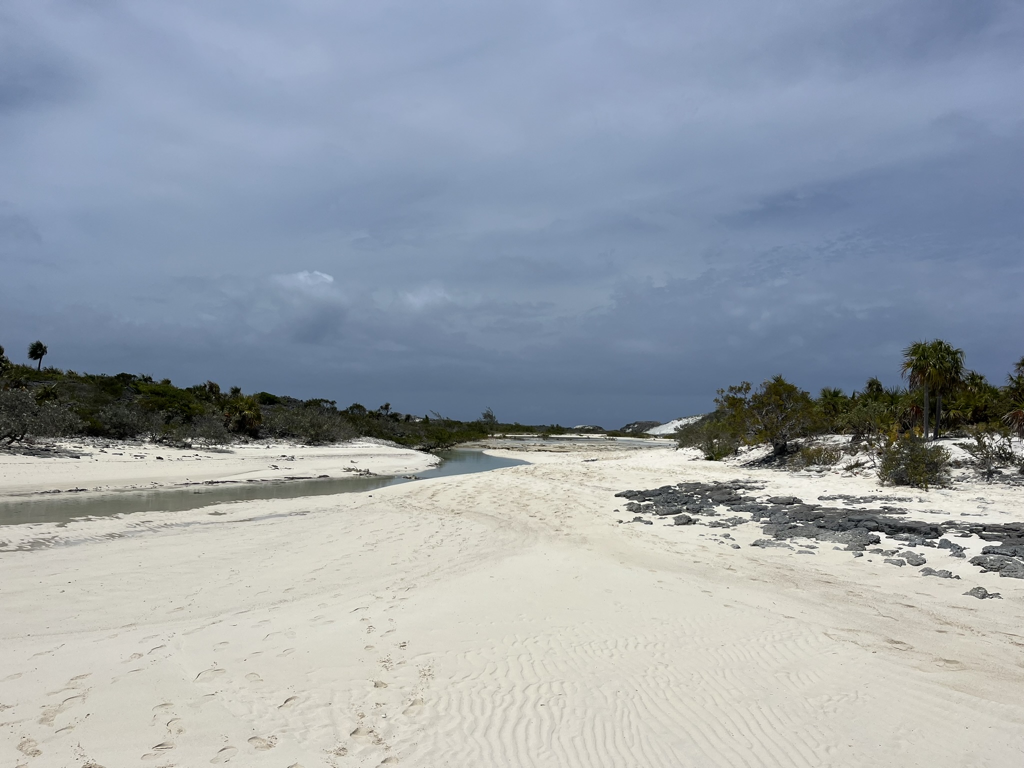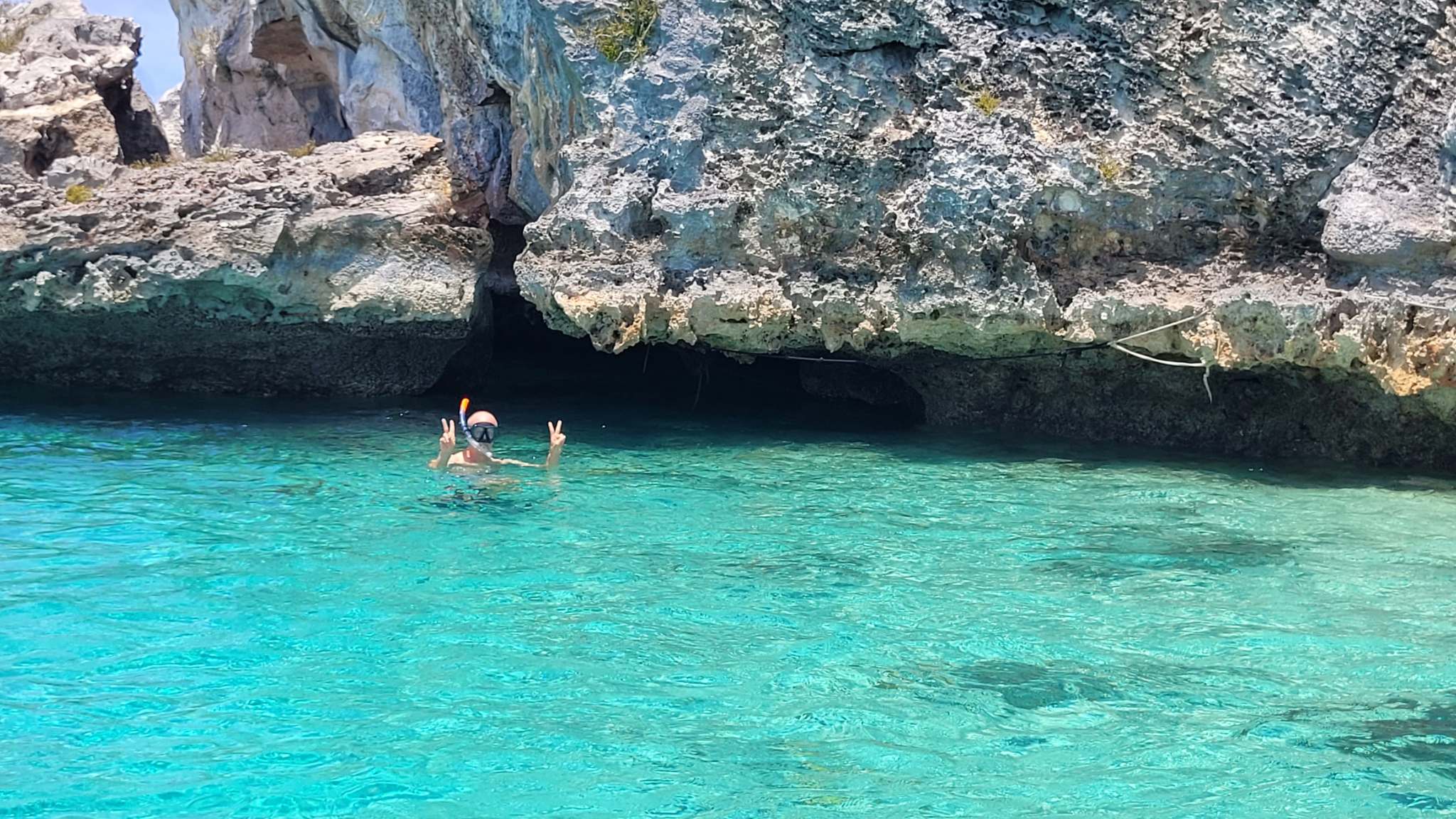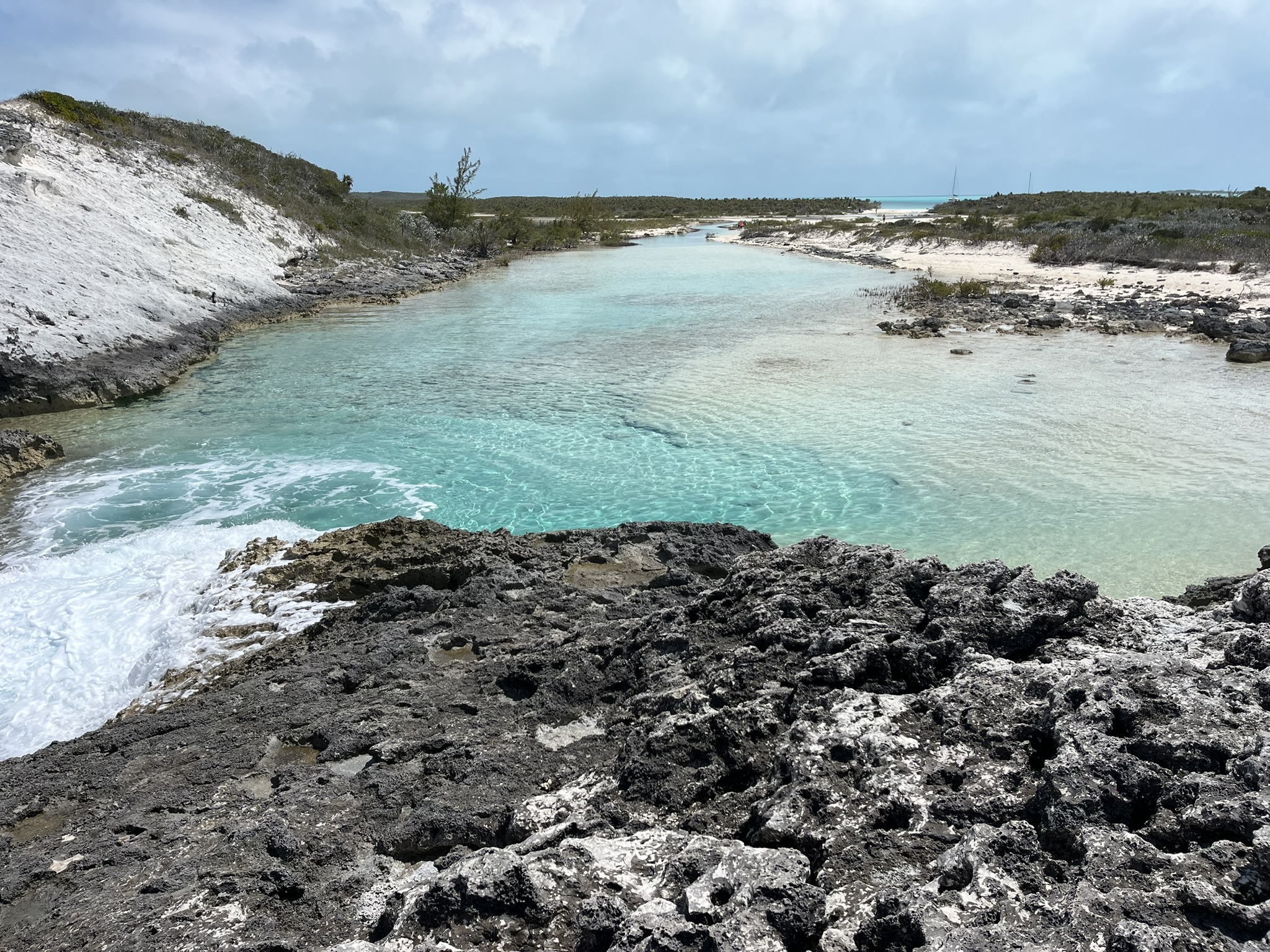 Beim Motor anmachen und Anker hochholen fällt dem Skipper auf, dass das übliche Blubbergeräusch am Heck fehlt. Unser Motor zieht normalerweise Wasser aus dem Meer durch einen Kreislauf und spuckt es hinten wieder aus. Wenn er das nicht macht, muss man sofort den Motor ausmachen, da Überhitzung droht. Das hat gerade noch gefehlt, notfallmäßig wird erstmal der Anker wieder runtergelassen. Wir überzeugen uns, dass kein bzw. nur sehr wenig Wasser durch die Schläuche geht. Es gibt so eine Art Checkliste, was man alles nachschaut, wenn dieser Fall eintritt. Nach diversen Überprüfungen scheint aber nur Luft im System gewesen zu sein. Wir kippen in den Vorfilter einige Liter Wasser hinein, und daraufhin fördert die Pumpe wieder. Na hoffentlich bleibt das auch so. Die Fahrt rüber nach Compass Cay ist nicht weit. Die Einfahrt durch den sogenannten Cut zwischen den Inseln ist allerdings ziemlich wild, da wir Wind gegen Welle haben. Auf der Insel machen wir einen schönen Spaziergang zu Rachels Bath. Das ist ein innenliegender Pool, der durch die Wellen von außen mit frischem Wasser spektakulär gefüllt wird. Wir baden eine Runde und laufen dann noch ein paar Kilometer den Strand rauf und runter.