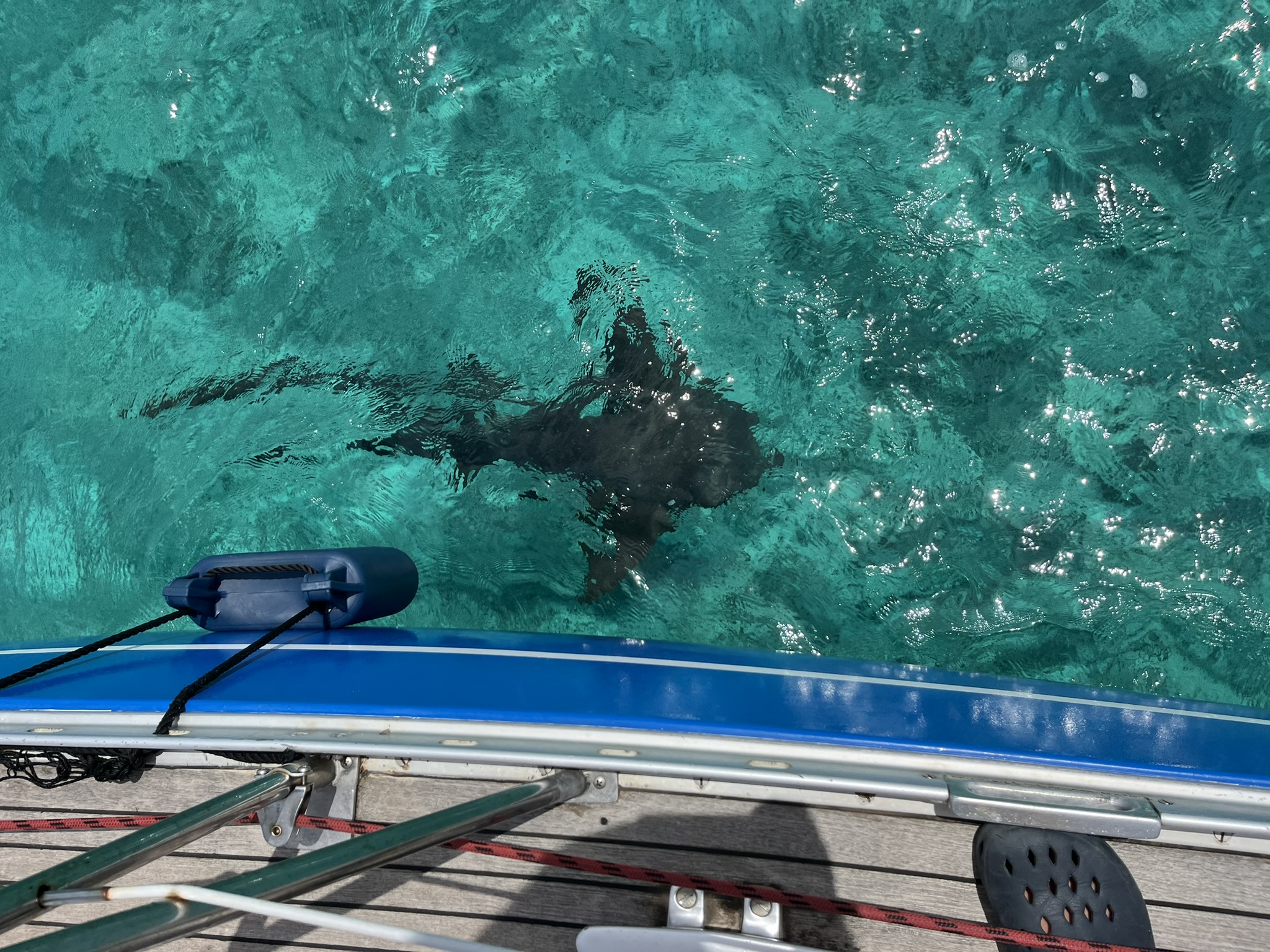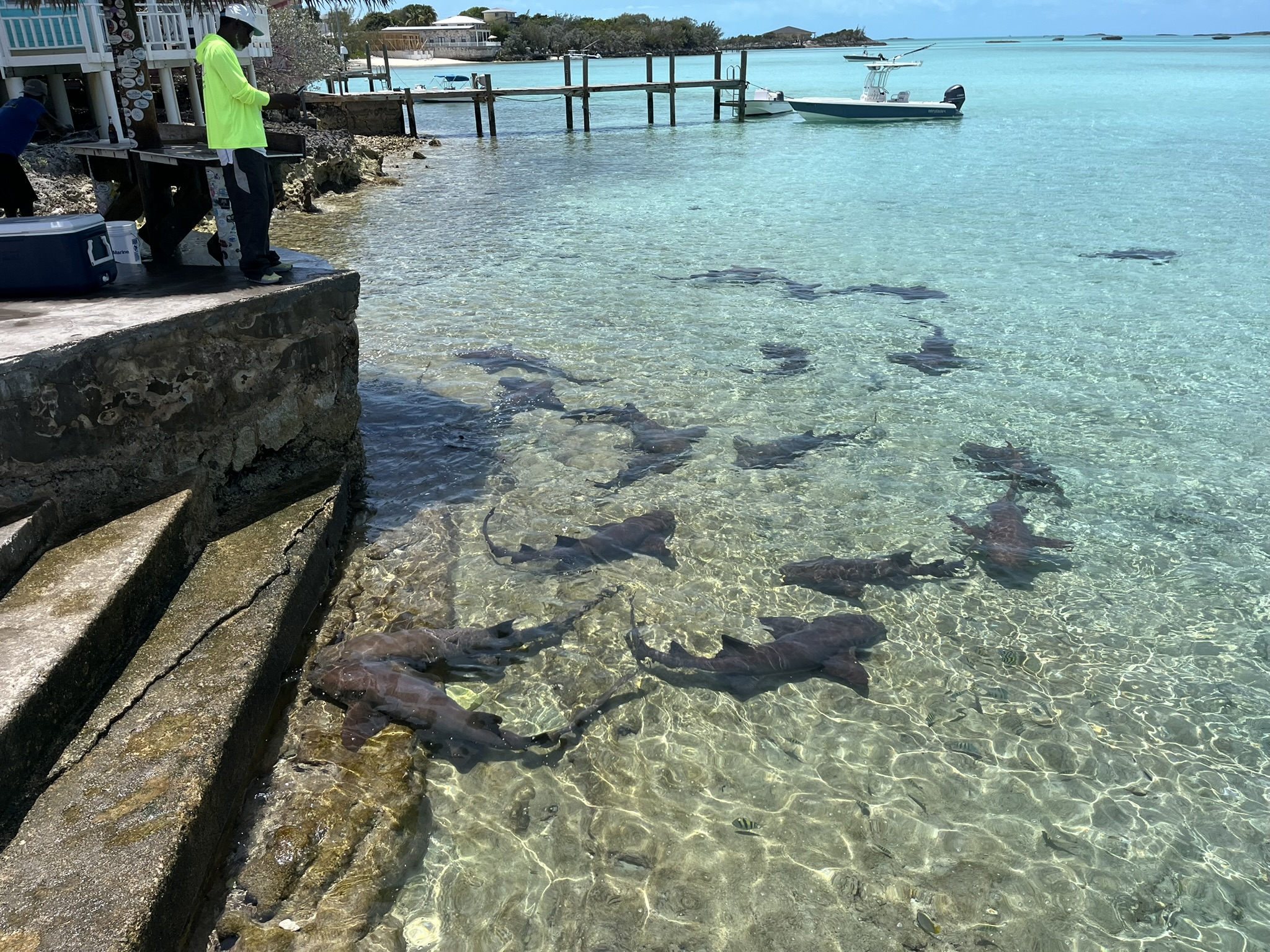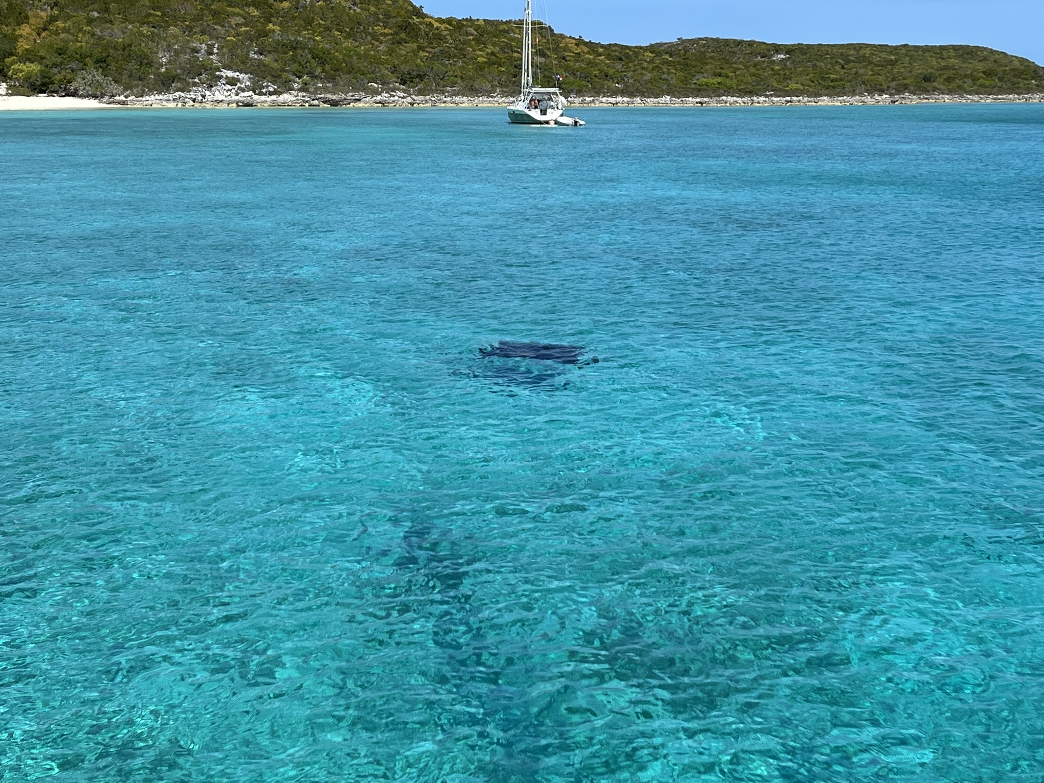 Die nächste Insel, die wir uns ausgesucht haben, ist Staniel Cay. Hier ist die Einfahrt für Segelboote mit Tiefgang wirklich tricky. Generell muss man an den meisten Durchfahrten, um hinter die geschützte Insel von der Seeseite aus zu kommen, auf die Gezeiten achten. Es kann passieren, dass sich meterhohe Wellen aufbauen, wenn der Wind gegen das auslaufende Wasser steht. In Staniel Cay muss man zusätzlich zur Strömung noch einige Felsen und Untiefen umkurven, und wir hatten dann einen Ankerplatz mit einem Meter Wasser unter dem Kiel. Staniel Cay ist im Prinzip für zwei Dinge berühmt: Zum einen ist auf der Nachbarinsel wieder eine Schweinekolonie, und zum anderen gibt es die Thunderball Grotte. Hier hat schon 1965 James Bond im Film Thunderball gegen die bösen Buben gekämpft. Wir vertreten uns erstmal die Beine und machen einen ausgedehnten Spaziergang über die Insel, bis zum Pirates Beach, wo wir ganz alleine sind. Es gibt auch einen wunderschönen großen Salzsee, der aber im Moment ziemlich ausgetrocknet ist. Im Hafenbecken der Marina schwimmen übrigens beeindruckende Ammenhaie, die hier von den Fischern immer mit Resten gefüttert werden.