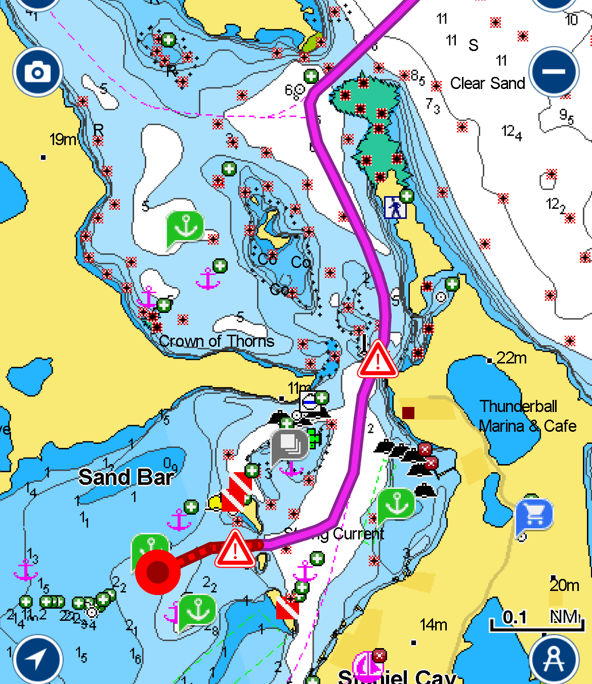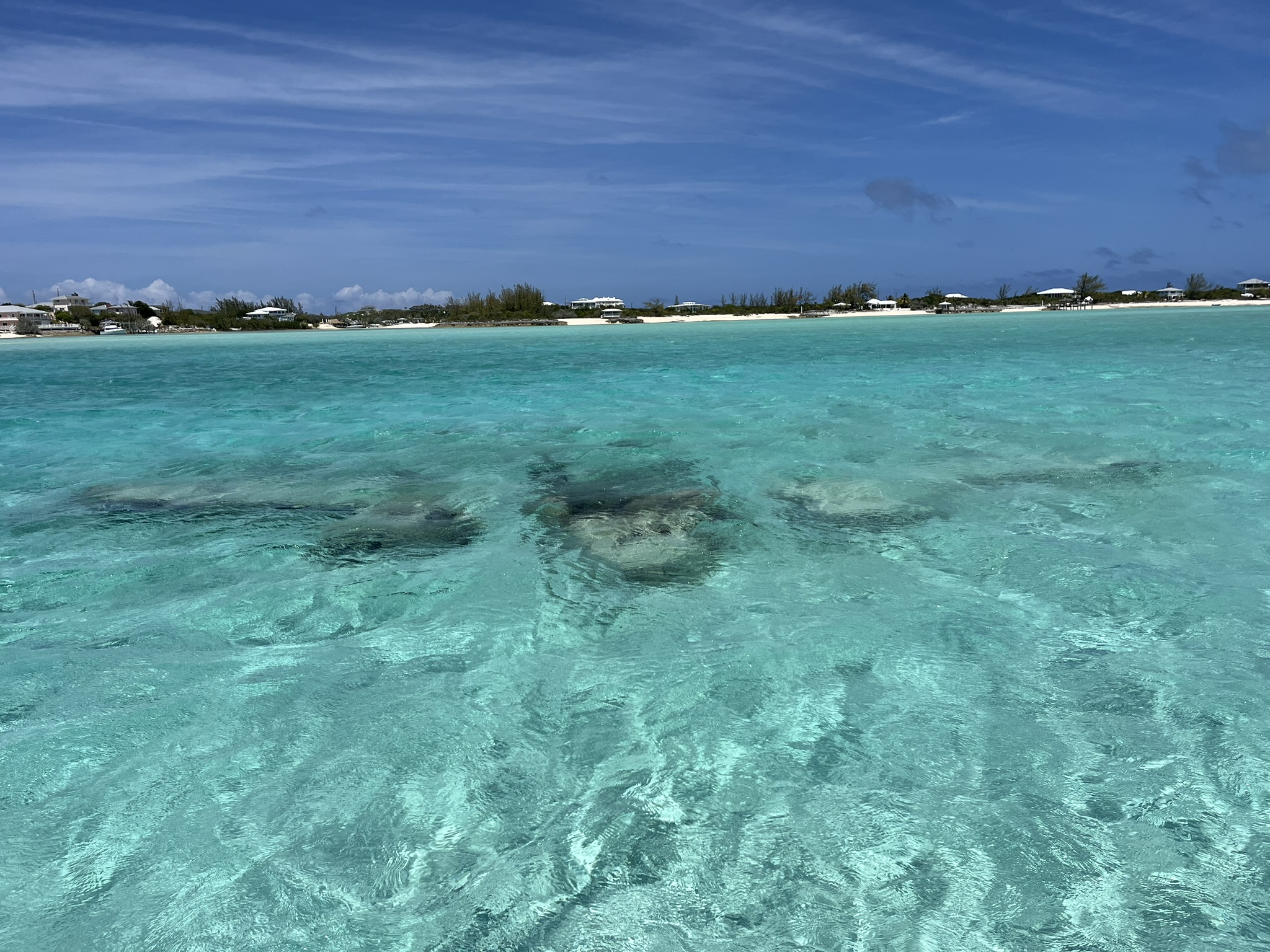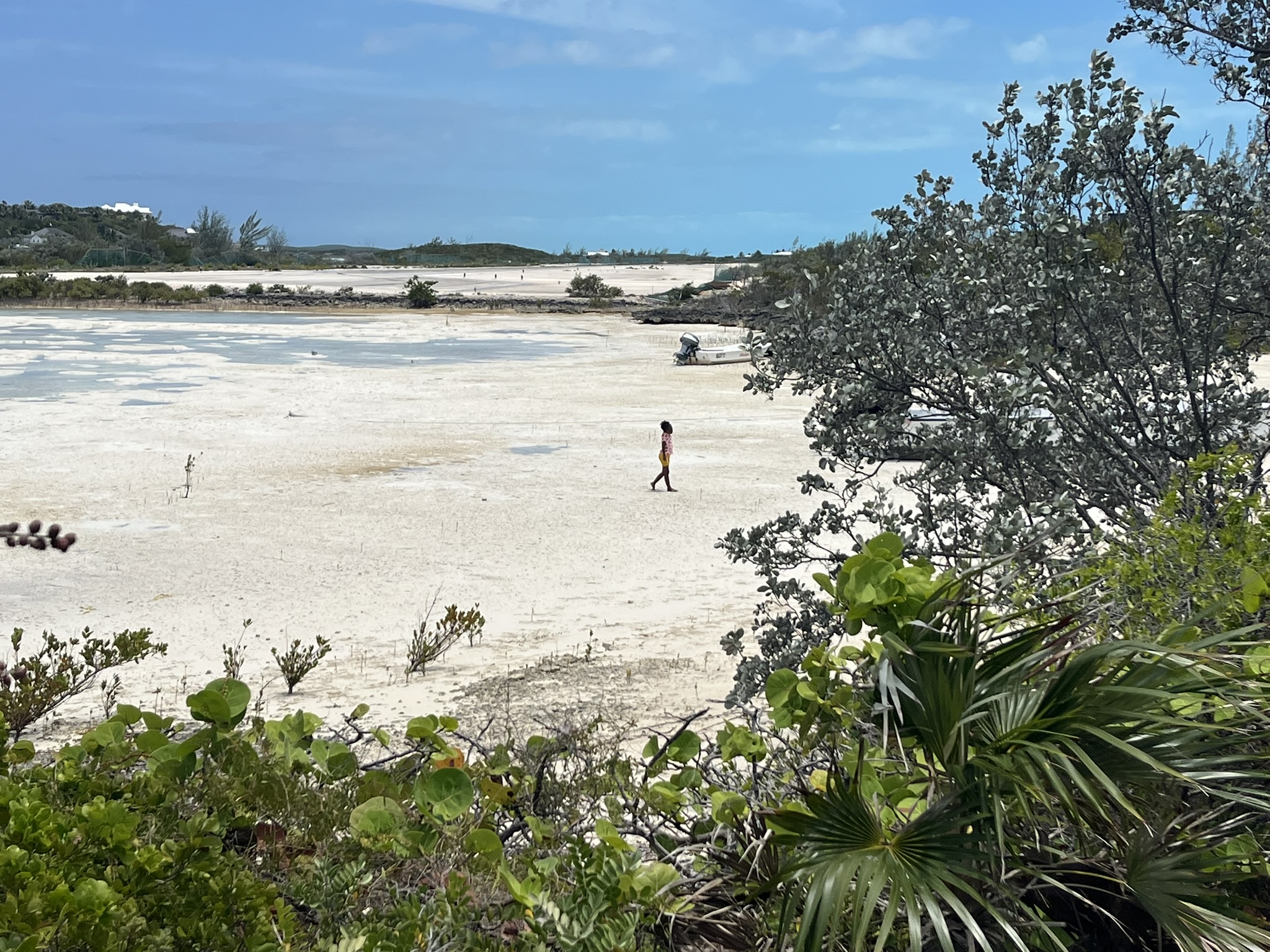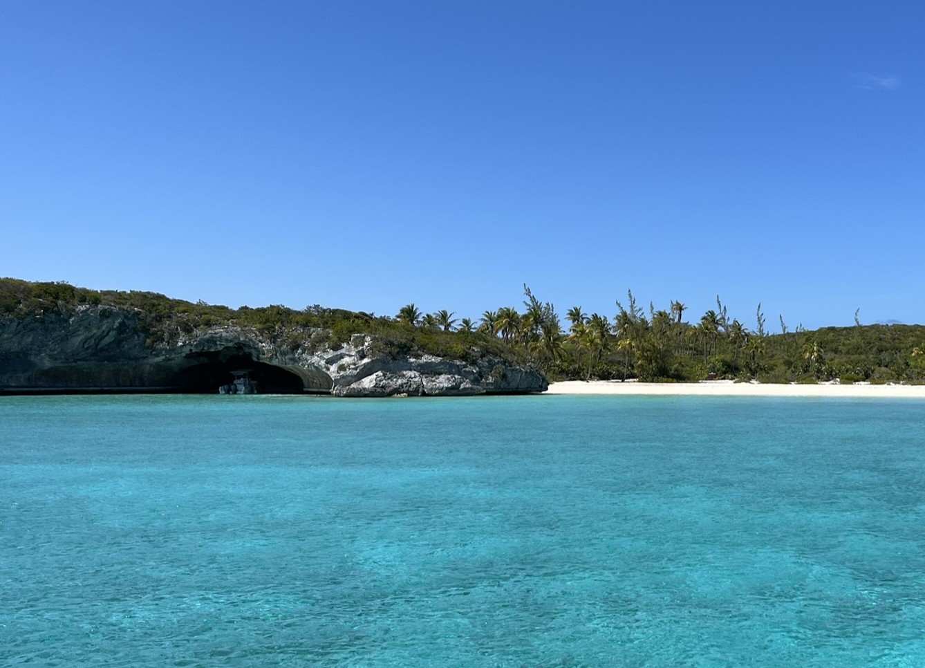 Die nächste Insel, die wir uns ausgesucht haben, ist Staniel Cay. Hier ist die Einfahrt für Segelboote mit Tiefgang wirklich tricky. Generell muss man an den meisten Durchfahrten, um hinter die geschützte Insel von der Seeseite aus zu kommen, auf die Gezeiten achten. Es kann passieren, dass sich meterhohe Wellen aufbauen, wenn der Wind gegen das auslaufende Wasser steht. In Staniel Cay muss man zusätzlich zur Strömung noch einige Felsen und Untiefen umkurven, und wir hatten dann einen Ankerplatz mit einem Meter Wasser unter dem Kiel. Staniel Cay ist im Prinzip für zwei Dinge berühmt: Zum einen ist auf der Nachbarinsel wieder eine Schweinekolonie, und zum anderen gibt es die Thunderball Grotte. Hier hat schon 1965 James Bond im Film Thunderball gegen die bösen Buben gekämpft. Wir vertreten uns erstmal die Beine und machen einen ausgedehnten Spaziergang über die Insel, bis zum Pirates Beach, wo wir ganz alleine sind. Es gibt auch einen wunderschönen großen Salzsee, der aber im Moment ziemlich ausgetrocknet ist. Im Hafenbecken der Marina schwimmen übrigens beeindruckende Ammenhaie, die hier von den Fischern immer mit Resten gefüttert werden.