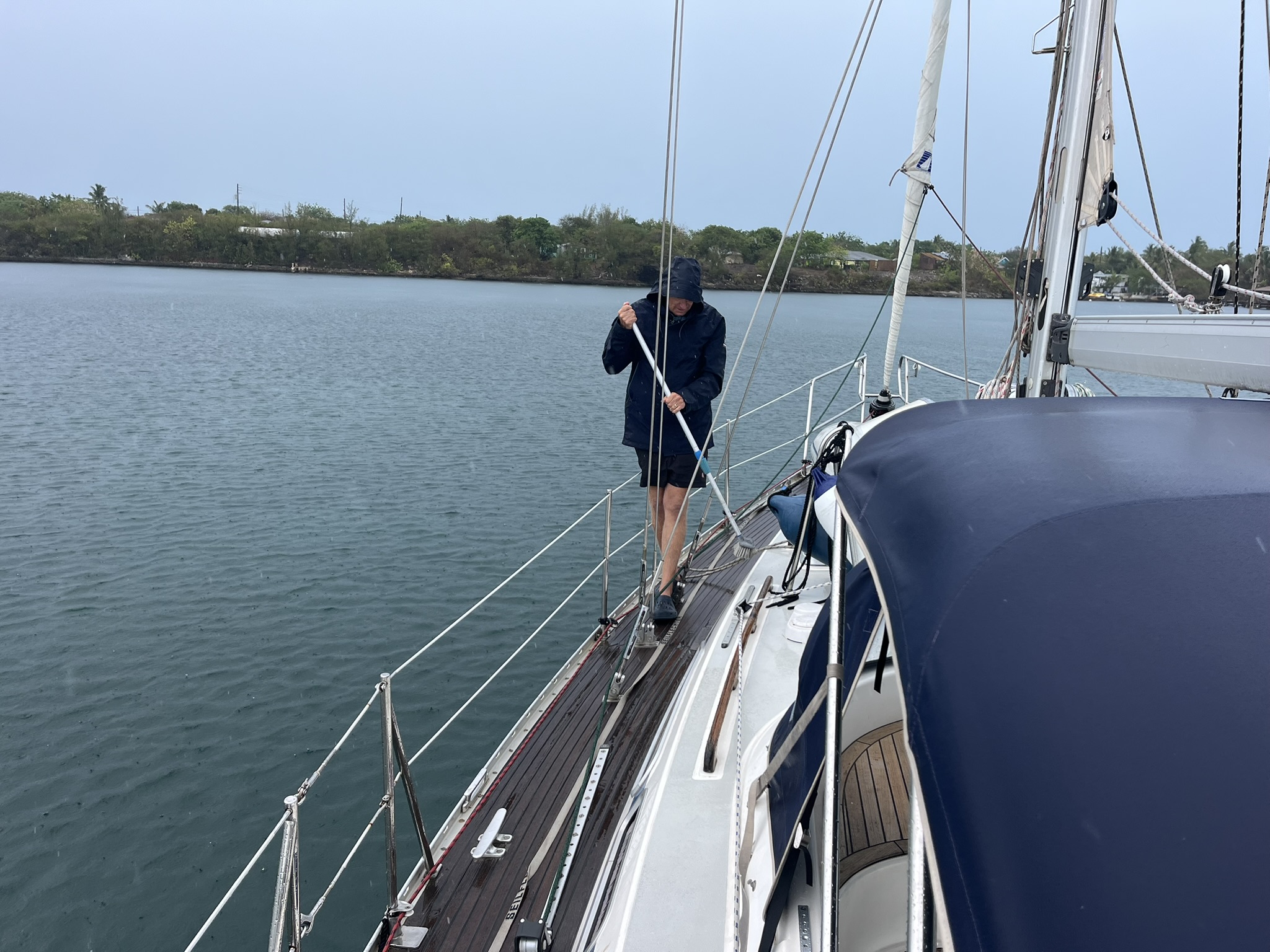 Nachdem wir vom wackeligen Paw Paw Strand geflüchtet sind, steuern wir eine Ankerbucht an, die vollkommen geschützt liegt und nur durch einen schmalen Kanal erreicht wird. Wir sind weniger als eine Stunde vor unserem Ziel, als ziemlich dunkle Wolken hinter uns auftauchen. Gewitter war eigentlich erst für den Abend vorhergesagt, aber anscheinend wurde es vorgezogen. Wird Zeit die Segel runterzunehmen und Vollgas zu geben. Die Blitze sind inzwischen fast bei uns, und der Donner wird immer lauter. So nah hatten wir ein Gewitter noch nicht auf unserer Reise, und es ist ein verdammt unangenehmes Gefühl, mit dem Mast eine Zielscheibe zu bieten. Aber alles ist gut gegangen. Der erste Regen seit drei Wochen wird direkt ausgenutzt, und das gesamte Boot wird geschrubbt. Der Ort, wo wir landen, heißt Alice Town, und man kann sagen, der schöne Name ist nicht Programm. Der Ort ist eine einzige Müllkippe, und überall stehen kaputte Autos rum, für die sich niemand mehr zuständig fühlt. Dazu kommen die abbruchreifen Häuser. Es ist nicht zu verstehen, wieso die Leute sich so dermaßen zumüllen. Ansonsten gibt es hier nämlich wirklich Potential. Die Bucht ist sehr schön und ruhig, alles ist grün, und zwischen dem ganzen Chaos gibt es einige nette Anwesen und auch ein paar hübsche Bars. Hervorheben muss man allerdings, dass auch hier alle Leute total nett sind und man ständig gegrüßt wird.