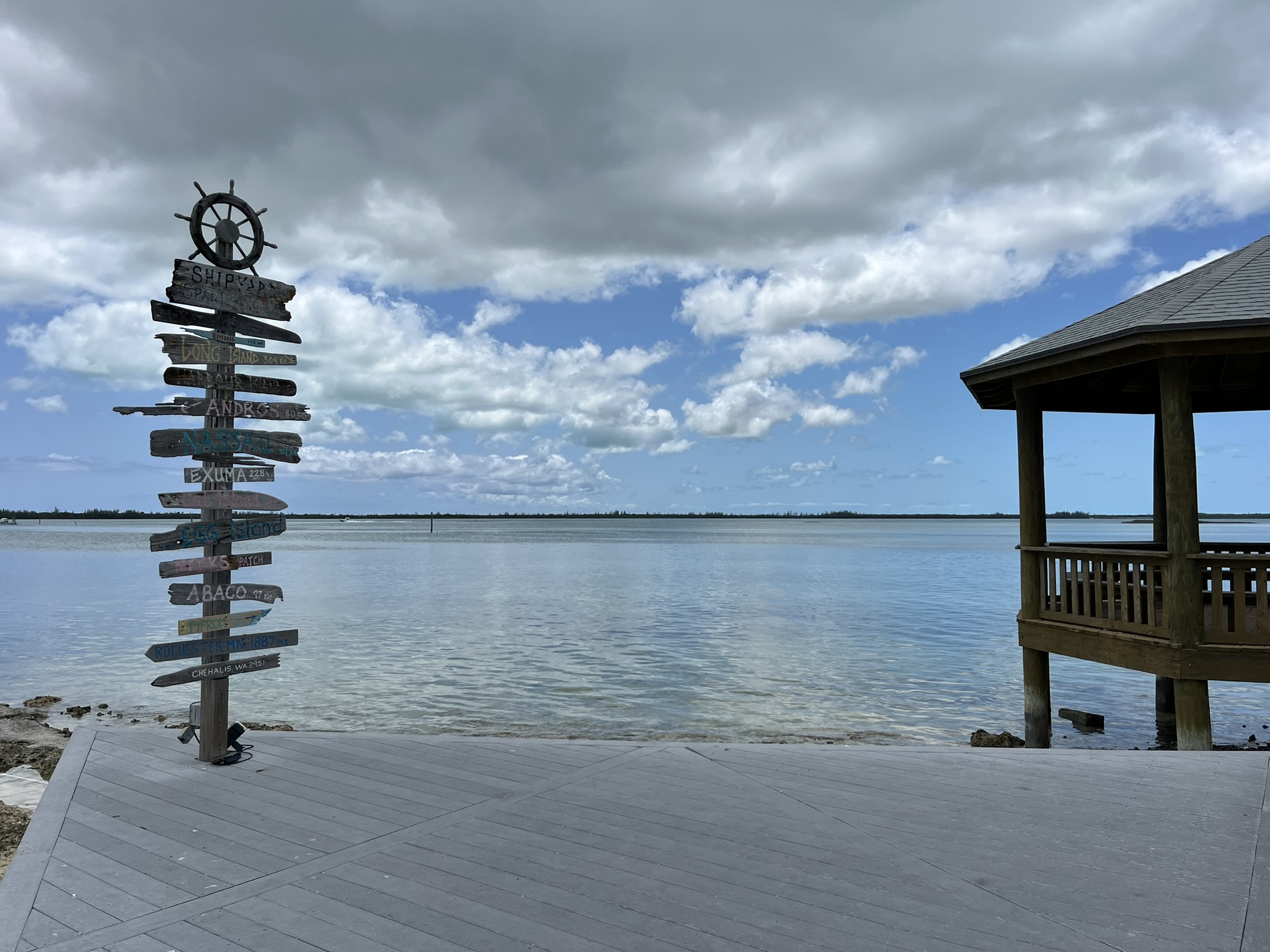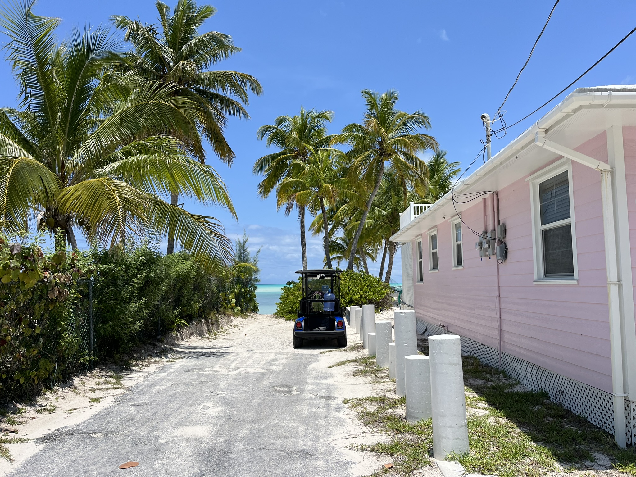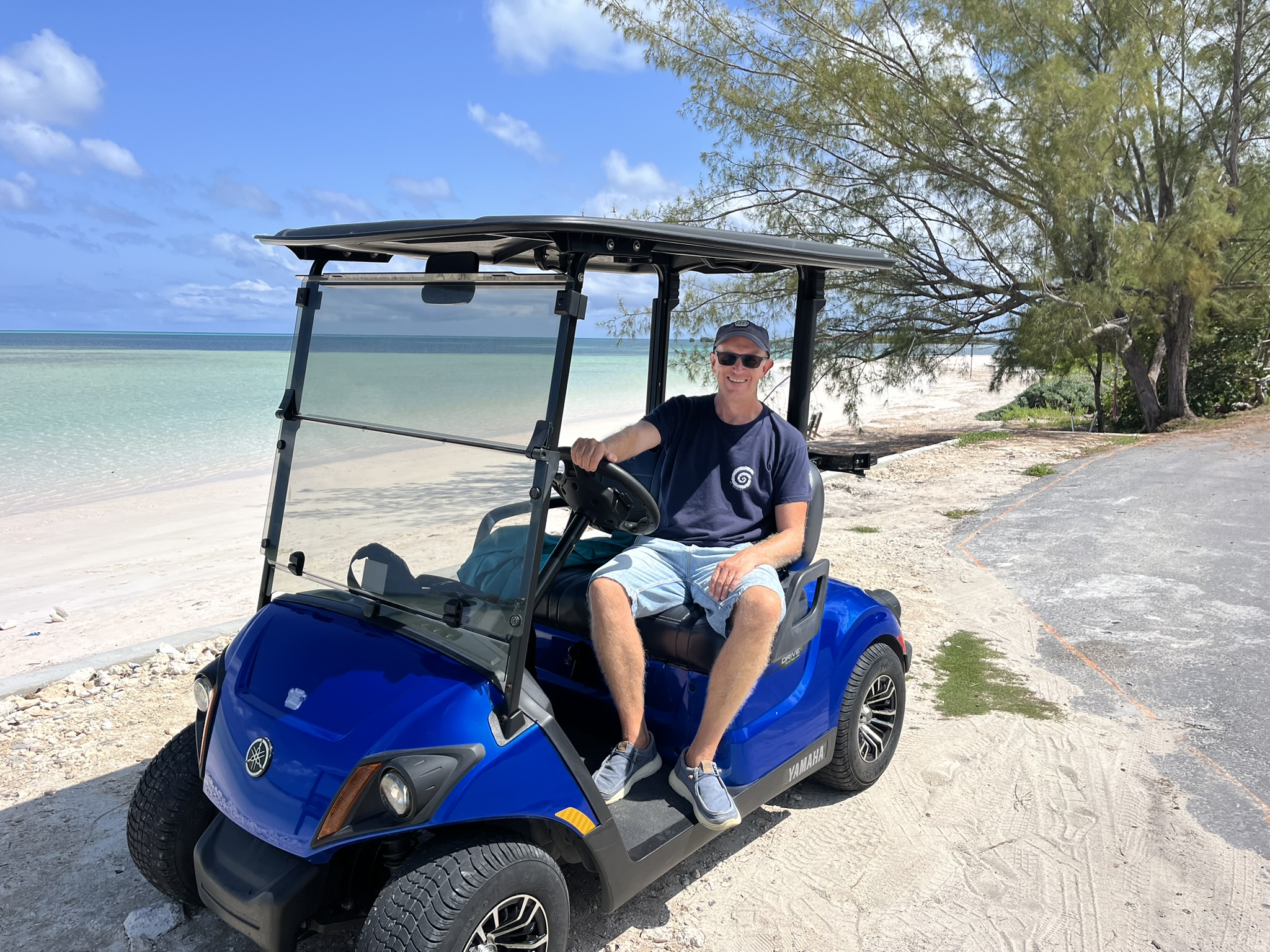 Der nächste Halt ist die Insel Spanish Wells. Wir müssen, um dorthin zu kommen, wieder durch einen sogenannten Cut, in dem 4-5 kn Strömung sein können. Und da wir bis dorthin schneller waren als geplant, müssen wir noch eine Stunde rumdümpeln und auf das Hochwasser warten. Dann kehrt der Strom um, und wir können leichter durchfahren. Der Bereich vor Spanish Wells ist ganz schön flach, und wir müssen mit ein paar anderen Segelbooten über einen Kilometer außerhalb der Stadt ankern, um nicht aufzulaufen. Der Ort ist das komplette Gegenteil von Alice Town. Das liegt vermutlich an den vielen Amerikanern, die hier leben und entsprechend Geld mitbringen. Es gibt einen langgezogenen Hafen und viele teure Yachten und Speedboote. Die Stadt ist geflutet von den kleinen Golfcarts, mit denen die meisten Leute hier unterwegs sind. Also machen wir das doch auch und mieten so ein Teil für einen Tag. Das macht echt Spaß, wir fahren die Insel rauf und runter und können über eine Brücke auch auf die Nachbarinsel Russell Island rüberfahren. Es gibt viele nette kleine Örtchen, wo es sich lohnt anzuhalten und etwas herumzuschlendern. Am Nachmittag besorgen wir noch 60 Liter Trinkwasser und machen einen Einkauf in dem bis dahin mit Abstand besten Supermarkt der Bahamas. Mit dem Golfcart können wir das alles wunderbar zu unserem Beiboot bringen.