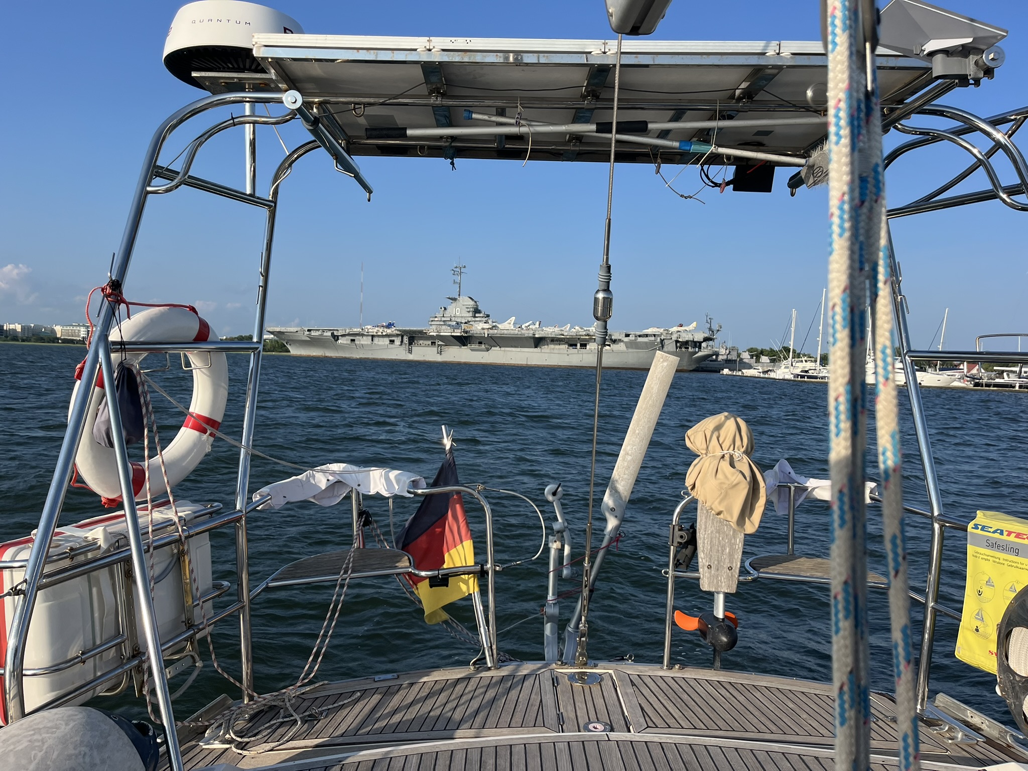 Der Wecker klingelt mal wieder um 06.00 Uhr, und wir fahren nach dem Frühstück rüber an den Außenpier der Marina. Dort dürfen wir tatsächlich umsonst Wasser in die Tanks füllen. Wir hatten noch einen Adapter besorgt, mit dem wir die Schläuche an unsere Filter anschließen können, um daraus Trinkwasser zu machen. Danach geht es zügig los, und wir motoren noch 2 Stunden, bis der versprochene Wind einsetzt. Gegen Nachmittag kommt dann erstmal ein Gewitter, welches auch angekündigt war. Dass es allerdings so heftig wird, war nicht angesagt. Obwohl wir es nur gestreift haben, machen wir wieder die übliche Prozedur. Segel runter, Motor an, Autopilot an, und unten in der Heckkabine ausharren. Der Wind geht zwischendurch kurz mal bis auf 62 Knoten hoch, was Windstärke 11 entspricht. Da wir nah an Land sind, entstehen kaum Wellen, sodass es uns nicht so gefährlich vorkommt. Kurz danach ist es auch schon wieder vorbei, und eine Stunde später können wir weitersegeln. Das mit den Gewittern ist echt schwierig; normalerweise würde man es vermeiden, bei so einem Wetter rauszufahren. Da aber für die nächsten Wochen fast täglich Gewitter an der südlichen Ostküste angesagt sind, muss man versuchen, drum herum oder durchzufahren. Manchmal kommen sie, und manchmal auch nicht. Wir entscheiden uns bald nur noch nach Charleston zu fahren, weil es bis nach North Carolina zu viele Windlöcher gibt und wir bis hierher schon fast ein Drittel den Motor anhatten. Pünktlich zum Abend kommen wir nach 34 Stunden in Charleston an und ankern gute 1,5 km von der Stadt weg, direkt neben einem riesigen alten Kriegsschiff. Das liegt hier schon seit den 70er Jahren und ist ein Museum geworden.