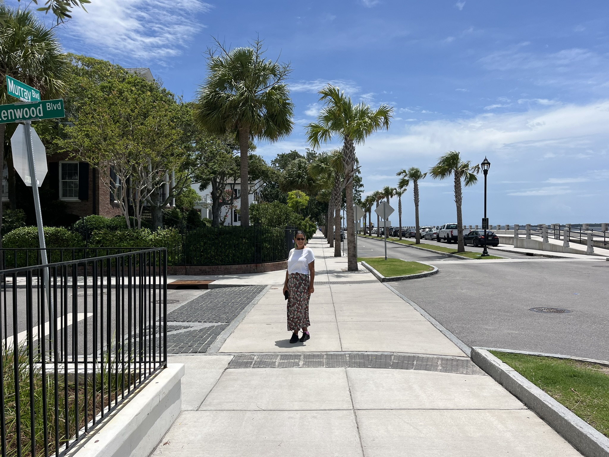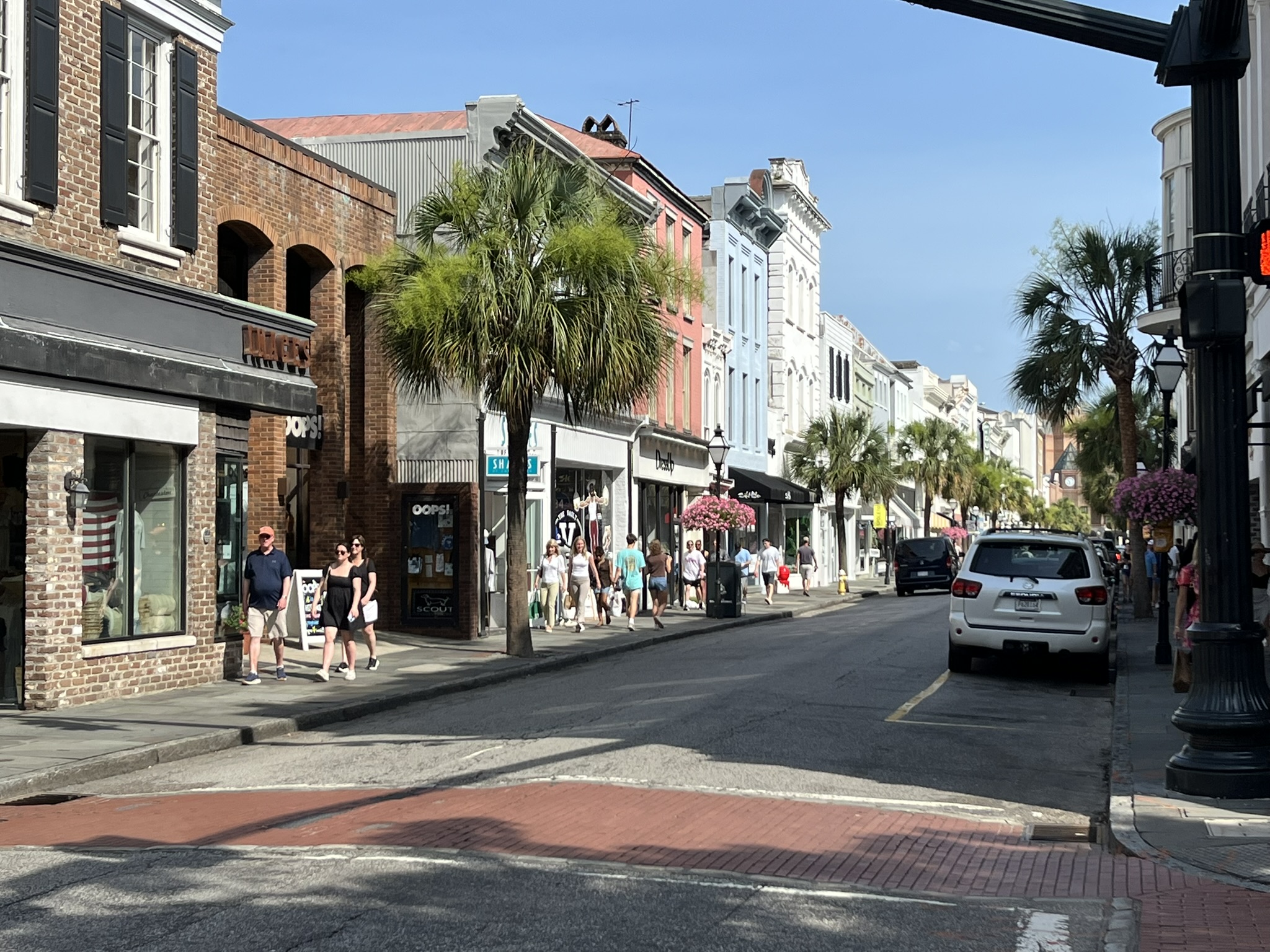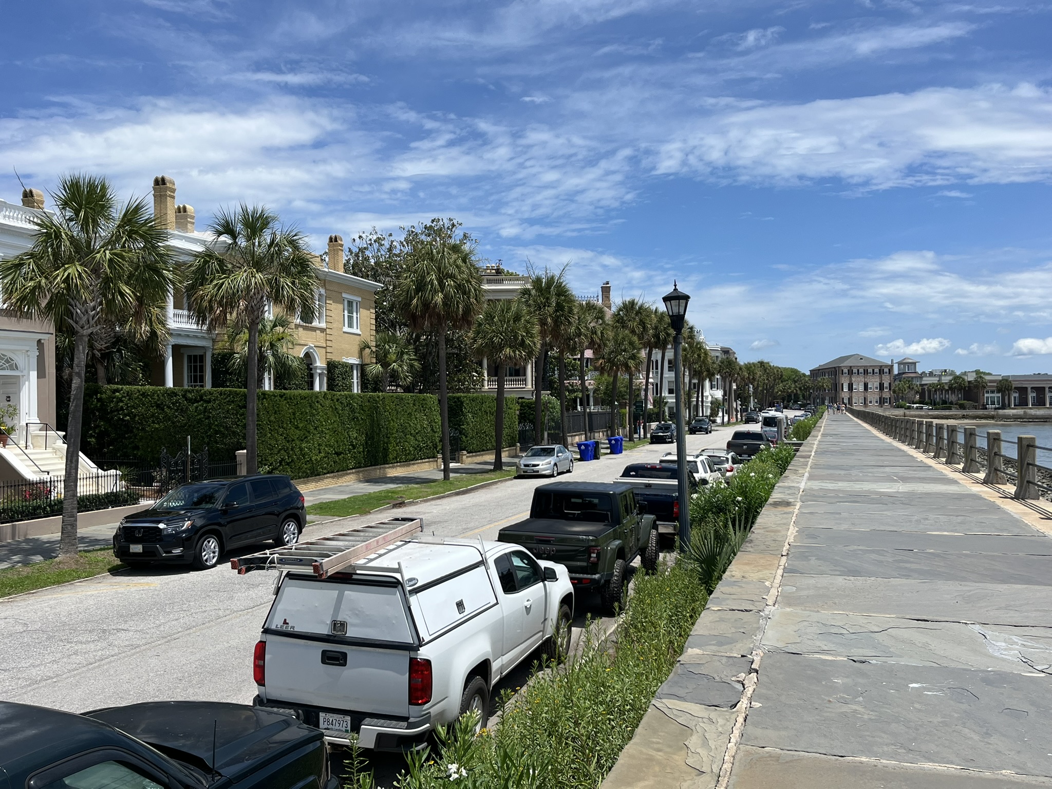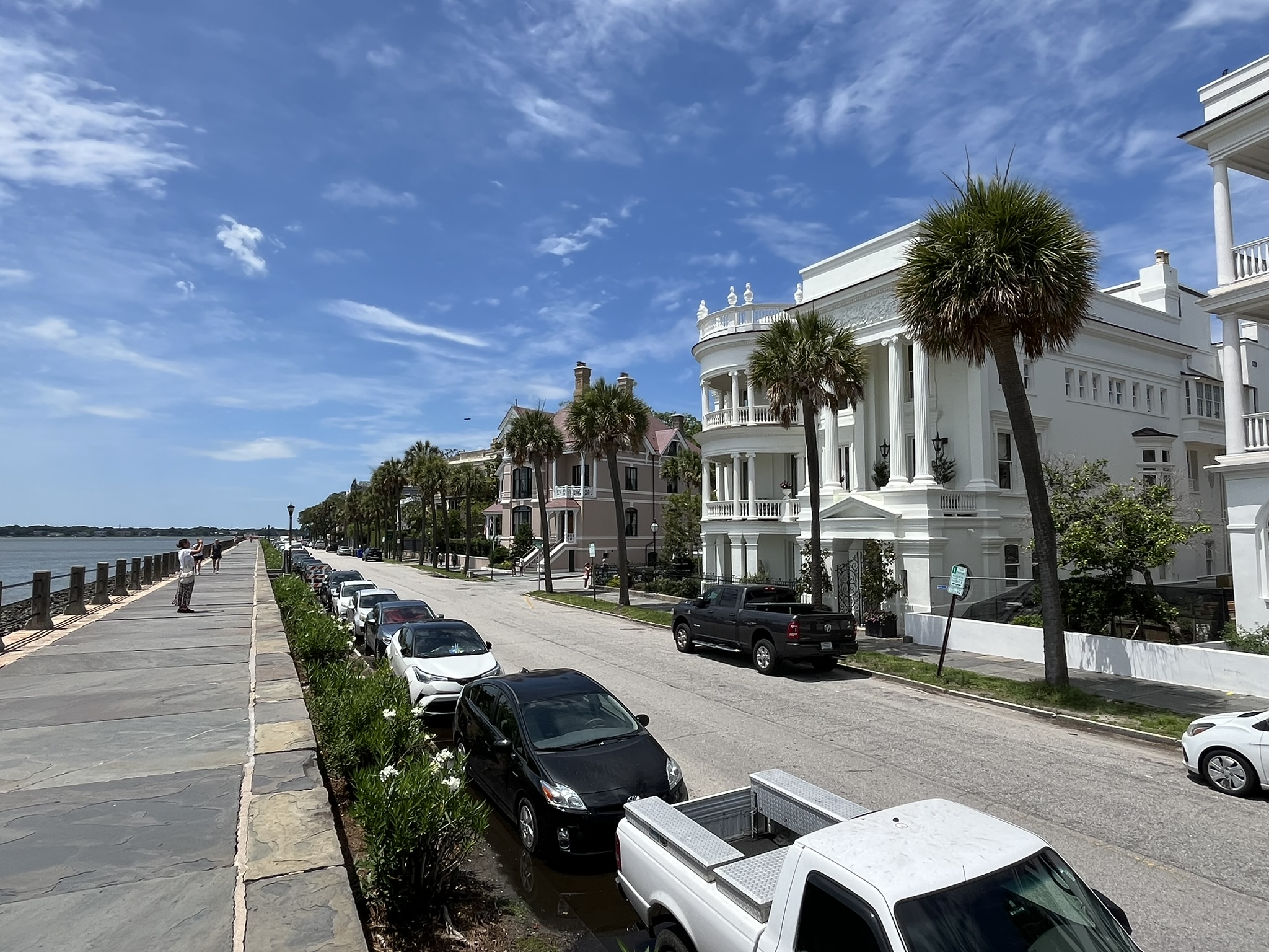 Die Dinghyfahrt heute, die 1,5 km rüber in den kleinen Hafen ist echt anstrengend. Wir haben die Strömung und den Wind gegen uns, und kommen mit unserem kleinen Elektro-Außenborder kaum voran. Das fällt soweit auf, dass uns unterwegs ein anderes Boot per Lautsprecher anspricht, ob alles ok mit uns ist. Kein Wunder, ansonsten sind hier nur PS-Protze unterwegs, die nur Vollgas kennen. Am Ende klappt es, und wir kommen wieder an unserem inzwischen gewohnten Anlegeplatz an. Wir marschieren heute die Stadt runter in den Süden, wo das nächste große Highlight wartet: der Stadtteil „The Battery“. Auf dem Weg kommen wir an einer Straße vorbei, wo viele Tafeln über die Sklaverei berichten. Genau dort fanden bis zum amerikanischen Bürgerkrieg in den 1860er Jahren noch Sklavenmärkte und Auktionen statt. Da hatte der Krieg tatsächlich was Gutes, weil er danach beendet wurde. Am Hafen erinnert auch ein großes Denkmal und ein Museum daran. Dahinter, im Viertel The Battery, findet man eine Luxusvilla neben der anderen (von wem wohl gebaut?). Die fettesten Dinger stehen an der südlichen Uferpromenade. Aber auch die Reihen dahinter können sich sehen lassen. Ein Blick beim Makler ins Schaufenster zeigt: Unter 2,5 Mio. geht hier gar nichts.