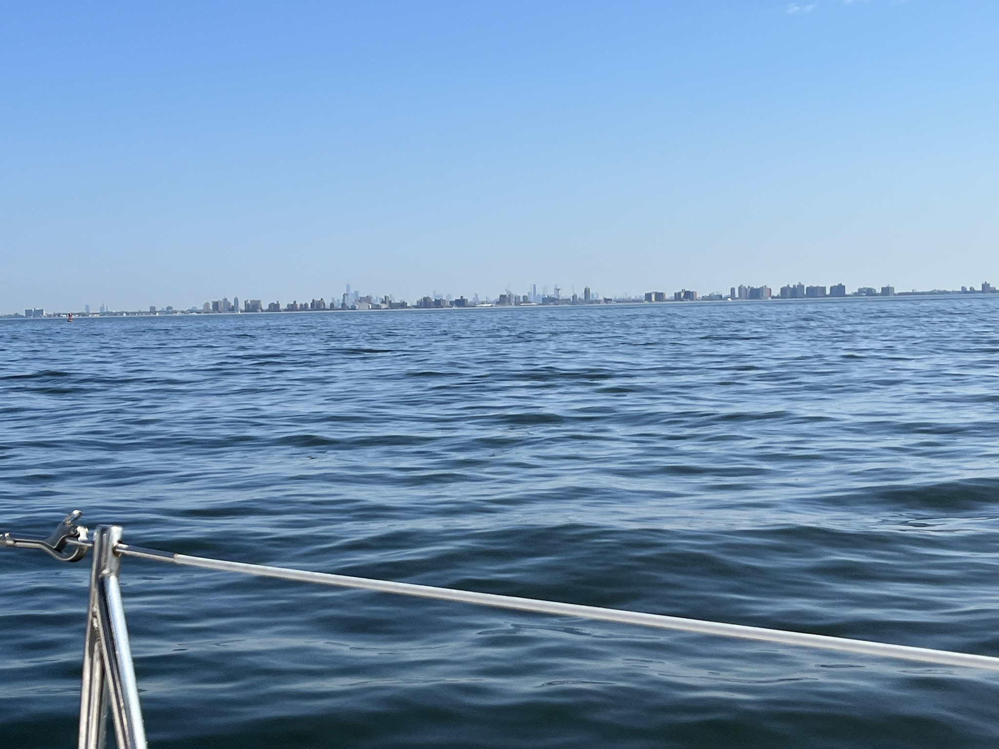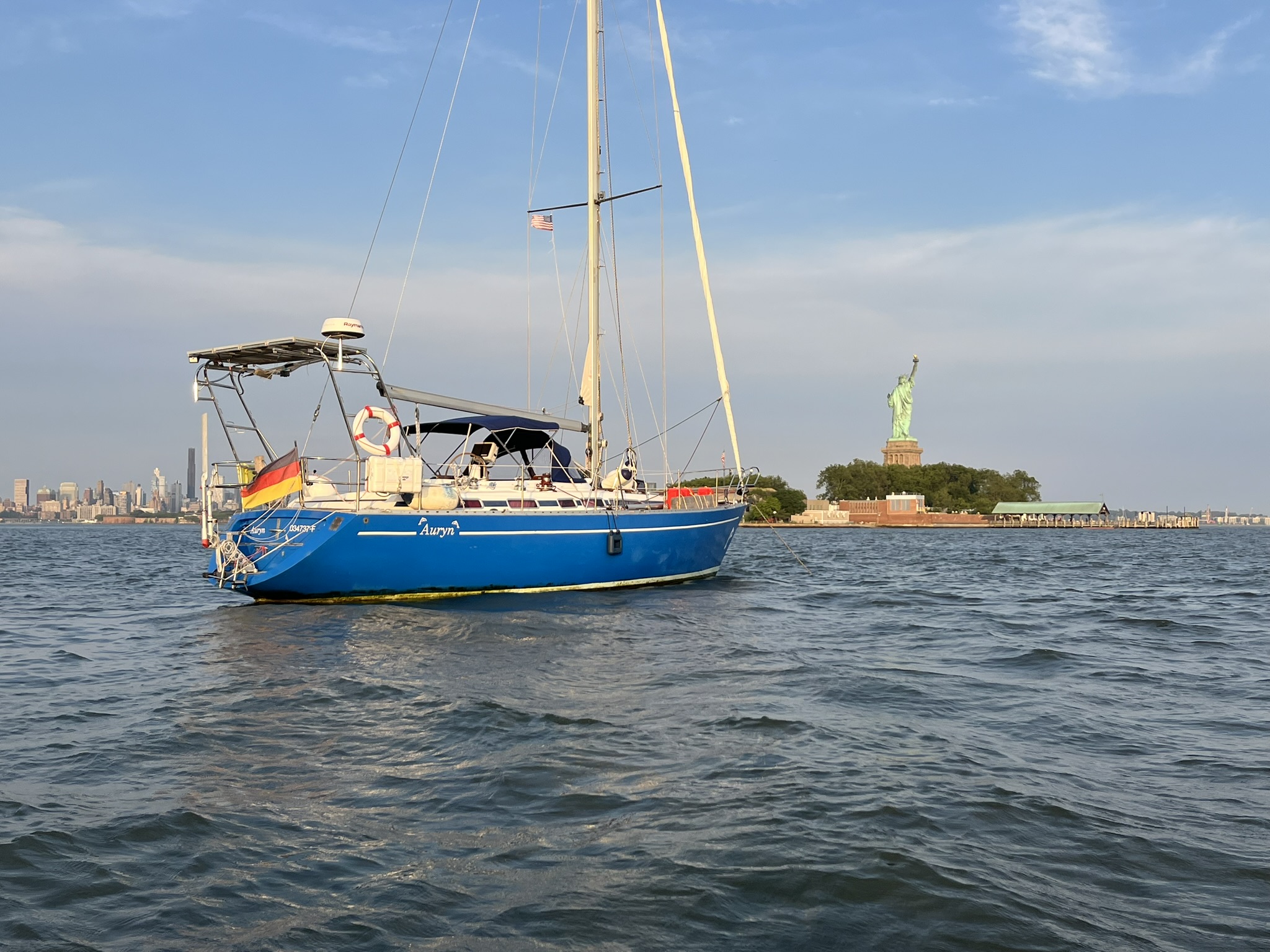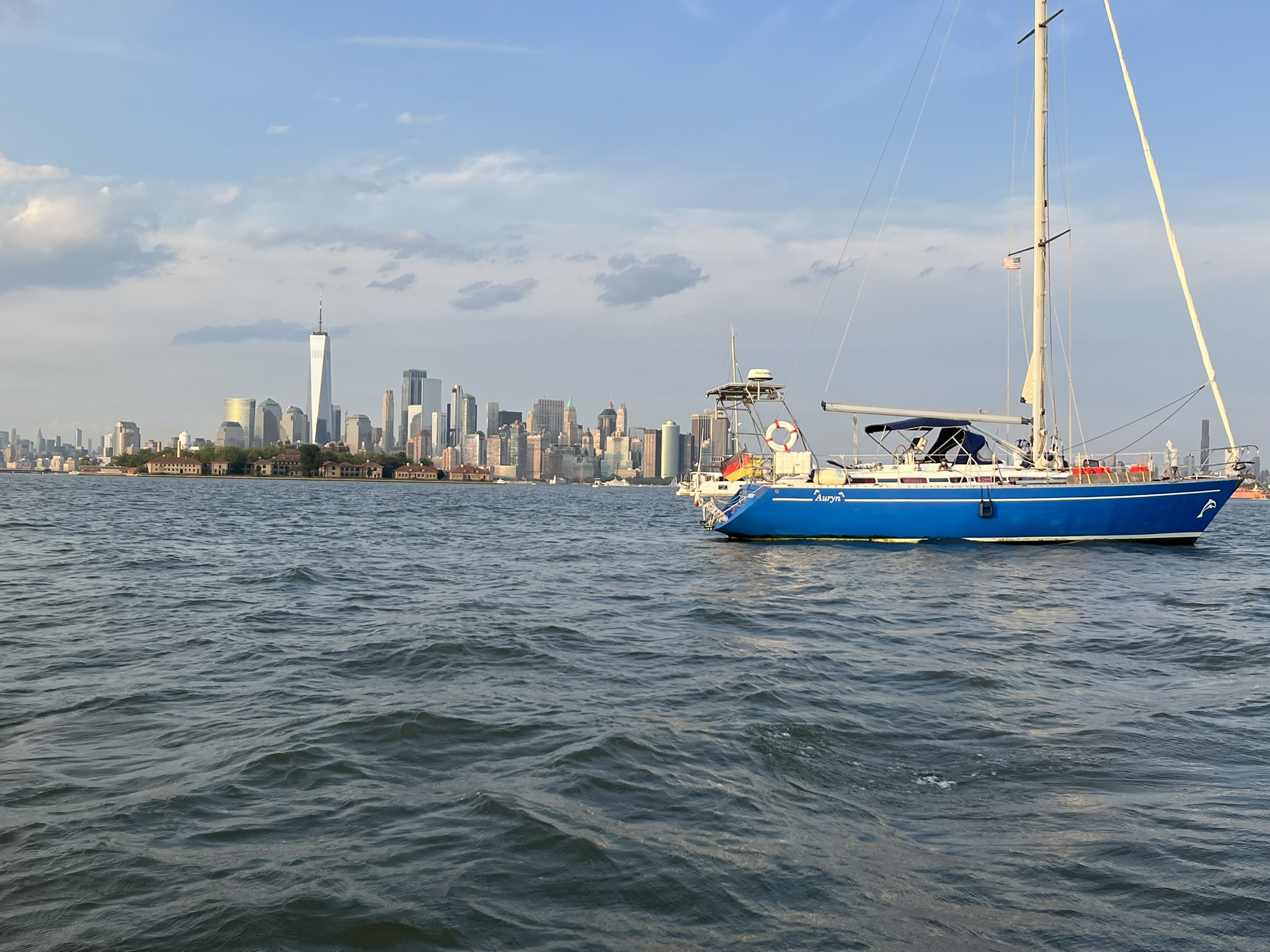 Am Anfang der 4-tägigen Tour Richtung NYC ging alles nach Plan, frische Ladung Diesel und Wasser für unsere Tanks an der Tanke bekommen und gemütlich die lange Bucht von Beaufort rausgeschippert. Zum ersten Mal verließ uns der Plan, als das Großsegel sich nicht aus dem Mast ausrollen ließ. Bestimmt eine Stunde lang haben wir es ein- und ausgerollt, bis es endlich stand. Ab dann hatten wir die ersten 2 Tage lang guten Wind. Wir mussten erstmal um das Kap Hatteras herum, welches nur bei südlichen Winden umfahren werden sollte. Das liegt daran, dass es vom Golfstrom gestreift wird und ansonsten unberechenbare Wellen entstehen können. Hat gut geklappt, und wir genossen einige Stunden lang die 3 kn zusätzliche Geschwindigkeit mitten in der Nacht. Anschließend geht es nach Norden an den Outer Banks hoch. Dort kommt der Wind von hinten, und die schrägen Wellen werfen uns ordentlich hin und her. Wir versuchen diverse Segelstellungen, bis wir ein Setup gefunden haben, bei dem die Segel aufhören zu schlagen. Am 3. Tag kommt dann der angekündigte Winddreher auf Nordwest, und wir bekommen einen halben Tag lang Wind und Welle mit 6 Bft von der Seite, was uns strapaziert, aber auch gut fortkommen lässt. Eine Welle nach der anderen überspült das Deck. Die folgende Nacht bietet dann wieder ein ganz neues Bild, nur noch schwache Winde, und wir dümpeln mit 3–4 kn weiter die Küste hoch. Am Morgen des letzten Tages, 30 sm vor dem Ziel, muss dann erwartungsgemäß der Dieselwind ran. Danach schält sich im Morgengrauen am entfernten Horizont die Skyline von New York durch den Nebel. Sehr, sehr, sehr aufregend – ein riesiger Meilenstein auf unserer Reise kommt näher. Da wir spät dran sind, verpassen wir leider den mitlaufenden Strom nach New York rein und müssen die letzten 6 Stunden gegen den Strom motoren und haben nur halbe Geschwindigkeit. Kurz vor unserem Ankerplatz an der Freiheitsstatue noch ein Aufreger. Wir bekommen Besuch von der US-Coast Guard, die sich mit einem Schnellboot nähern und ungefragt mit 4 schweruniformierten Beamten an Bord kommen. Einer checkt mit Natascha unten das Boot und will Sicherheitsausrüstung sehen. Die anderen checken Papiere und unseren Aufenthaltsstatus. Alles in Ordnung, insgesamt sehr freundlich, und nach einer halben Stunde sind sie wieder verschwunden. Sie meinten, sie würden nur ausländische Boote kontrollieren, es gäbe zur Zeit nicht so viele. Warum wohl? Und dann der große Moment, wir ankern neben der Freiheitsstatue, mit dem One-Million-Dollar-View auf Statue und die Skyline von Manhattan. Wir sind sehr glücklich und genehmigen uns das Anlegerbierchen bzw. Weinchen.