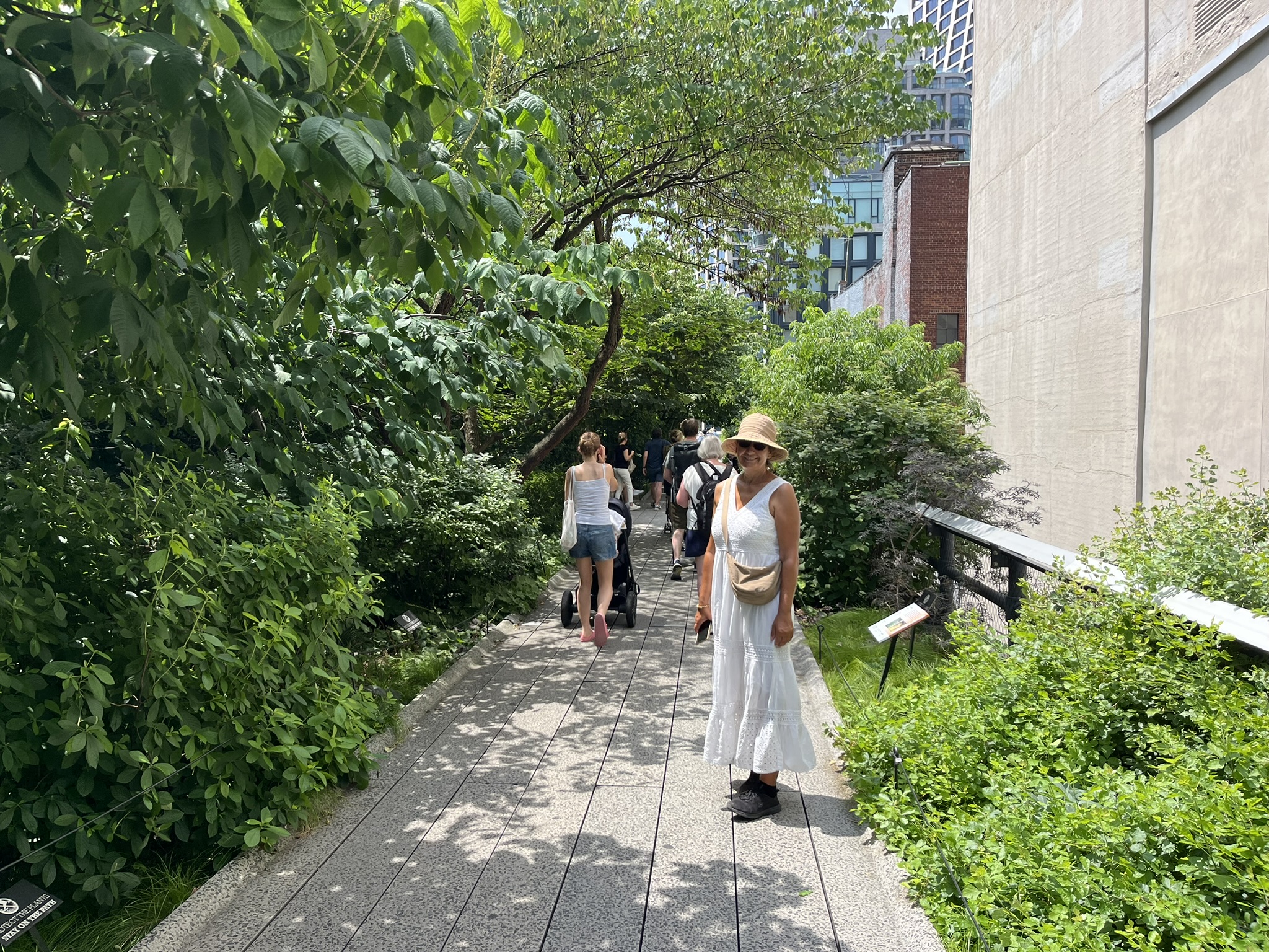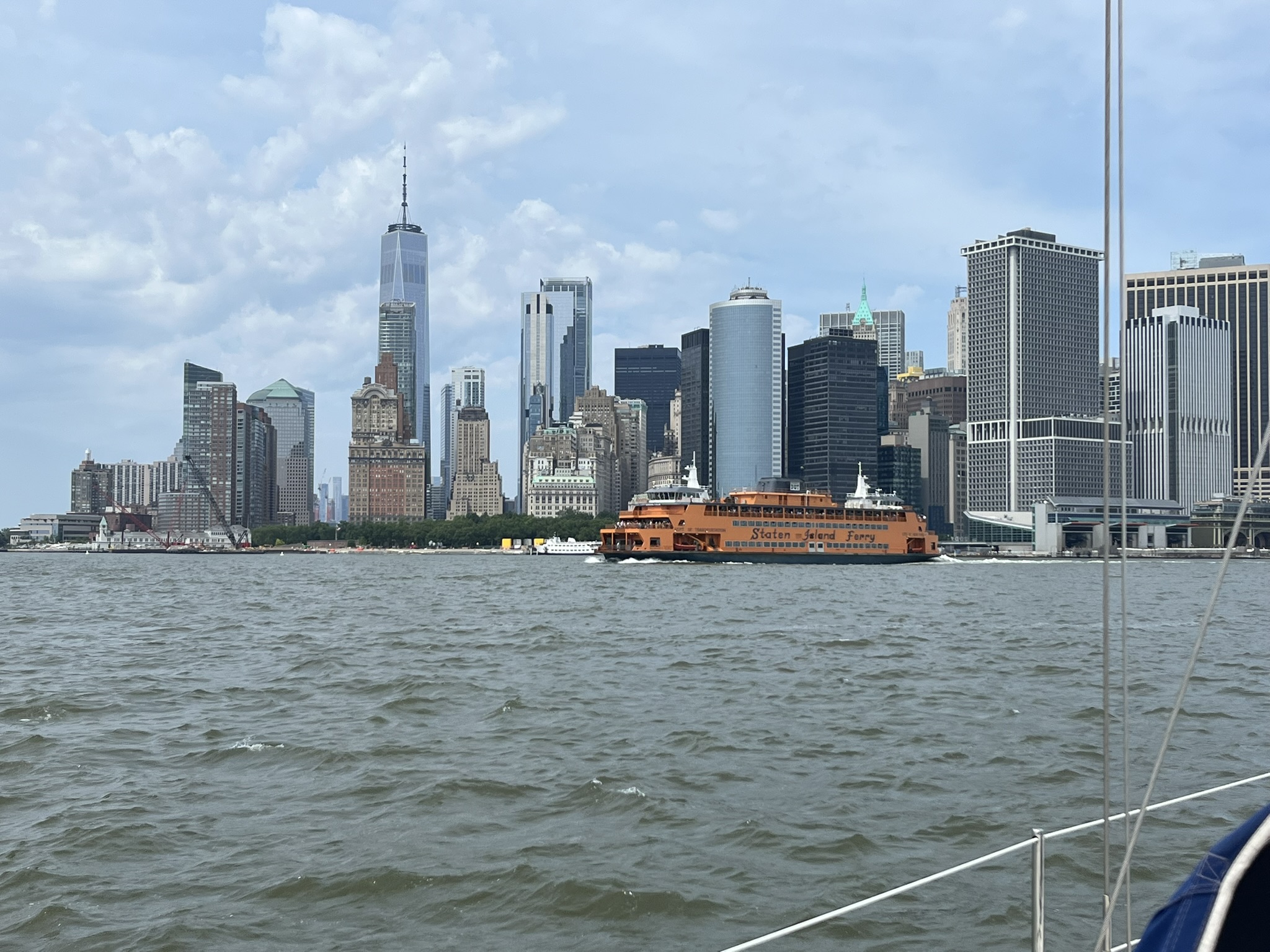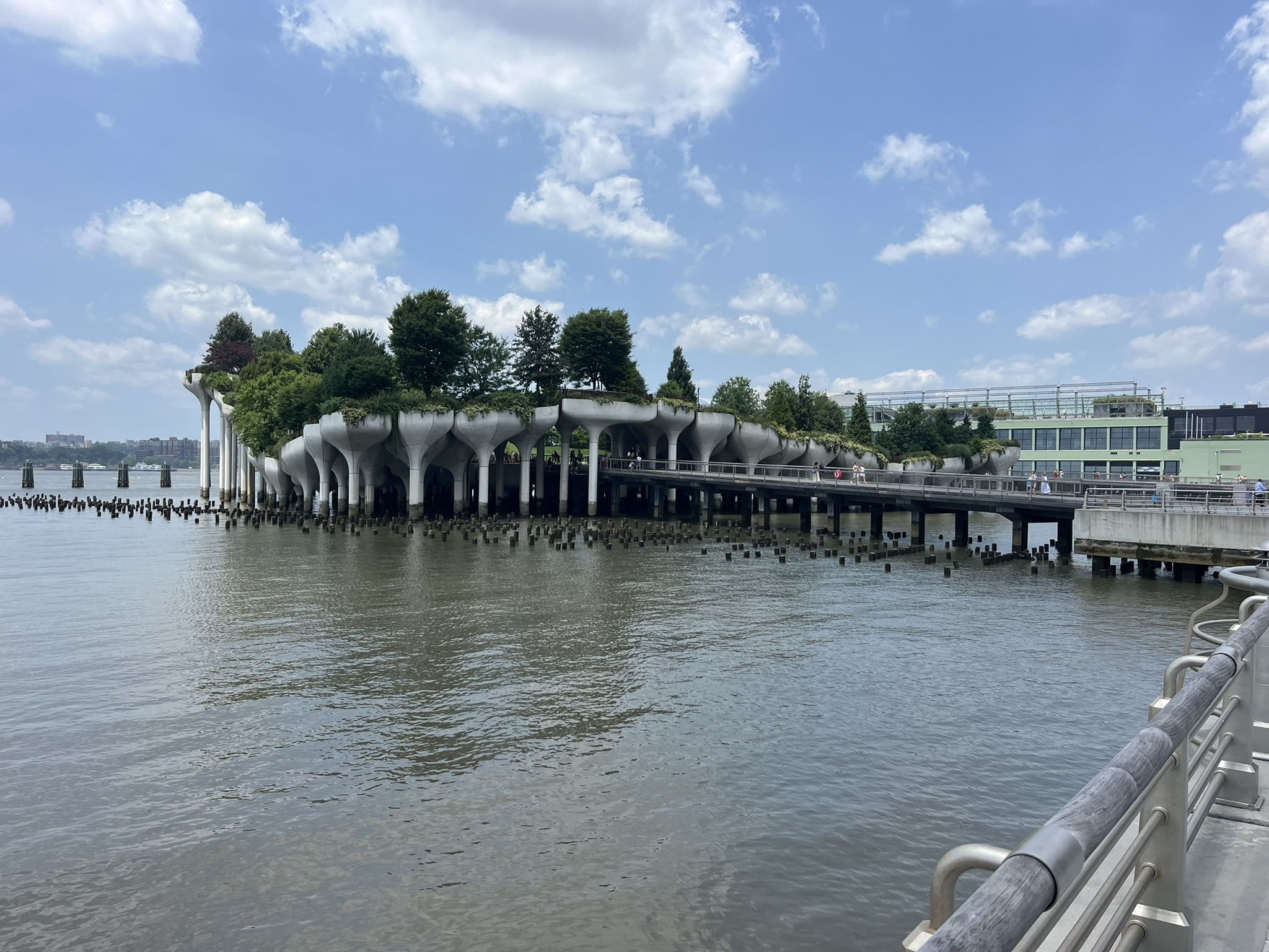 Obwohl es heute bis 38 °C werden soll, entscheiden wir uns, nach New York zu fahren. Lustigerweise gab es nicht nur bei der Freiheitsstatue die Huihui aus Remscheid, sondern neben uns liegt auch der Kat Momo, der ebenfalls aus Remscheid kommt. Unser Nachbarstädtchen scheint der Nabel der Welt zu werden. Wir hatten in der Vergangenheit schon Kontakt per WhatsApp mit Carla und Volker, aber persönlich kannten wir uns noch nicht. Also holen wir die beiden mit unserem Beiboot ab und fahren gemeinsam nach New York. Der Zug braucht 50 Minuten, und schon ist man mitten im Getümmel an der Penn Station. Wir waren vor acht Jahren schon einmal hier und möchten nun in den nächsten Tagen möglichst Orte entdecken, die wir damals noch nicht gesehen haben. Einer davon ist die High Line. Das ist eine ehemalige Hochbahn, die durch den Stadtteil Chelsea führt. Sie ist nur 2,5 km lang und wunderschön angelegt. Überall ist grün, und man ist immer etwas oberhalb der Straßen und hat einen guten Überblick. Danach biegen wir zum Hudson River ab und landen am Pier 57. Das ist eine kleine Halbinsel, die sehr nett gestaltet ist, und man kann dort mit Blick auf den Fluss verweilen. Anschließend schlendern wir die verschiedenen Avenues wieder hoch, bis es uns eindeutig zu heiß wird. Wir verziehen uns ins größte Kaufhaus Amerikas, in das Macy’s. Dort gibt es 12 Ebenen, und oben sind sogar noch historische Rolltreppen aus Holz. Ansonsten ist es ein Kaufhaus wie alle anderen auch, nur halt größer.