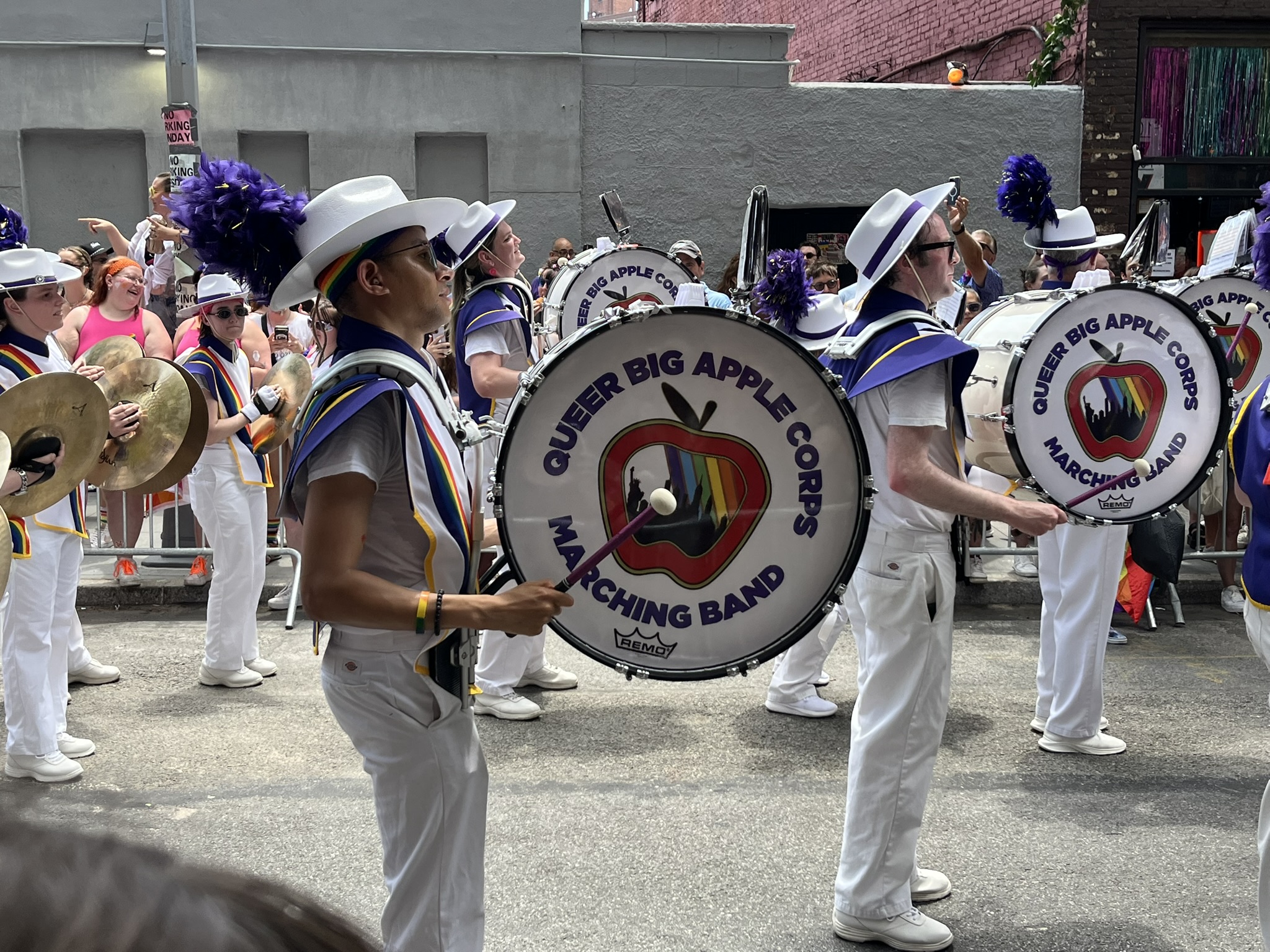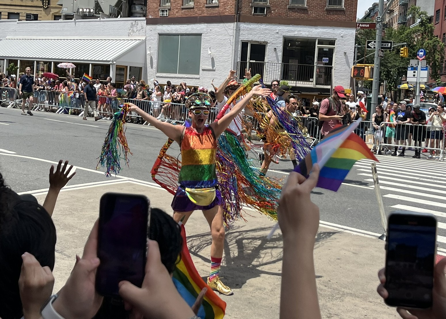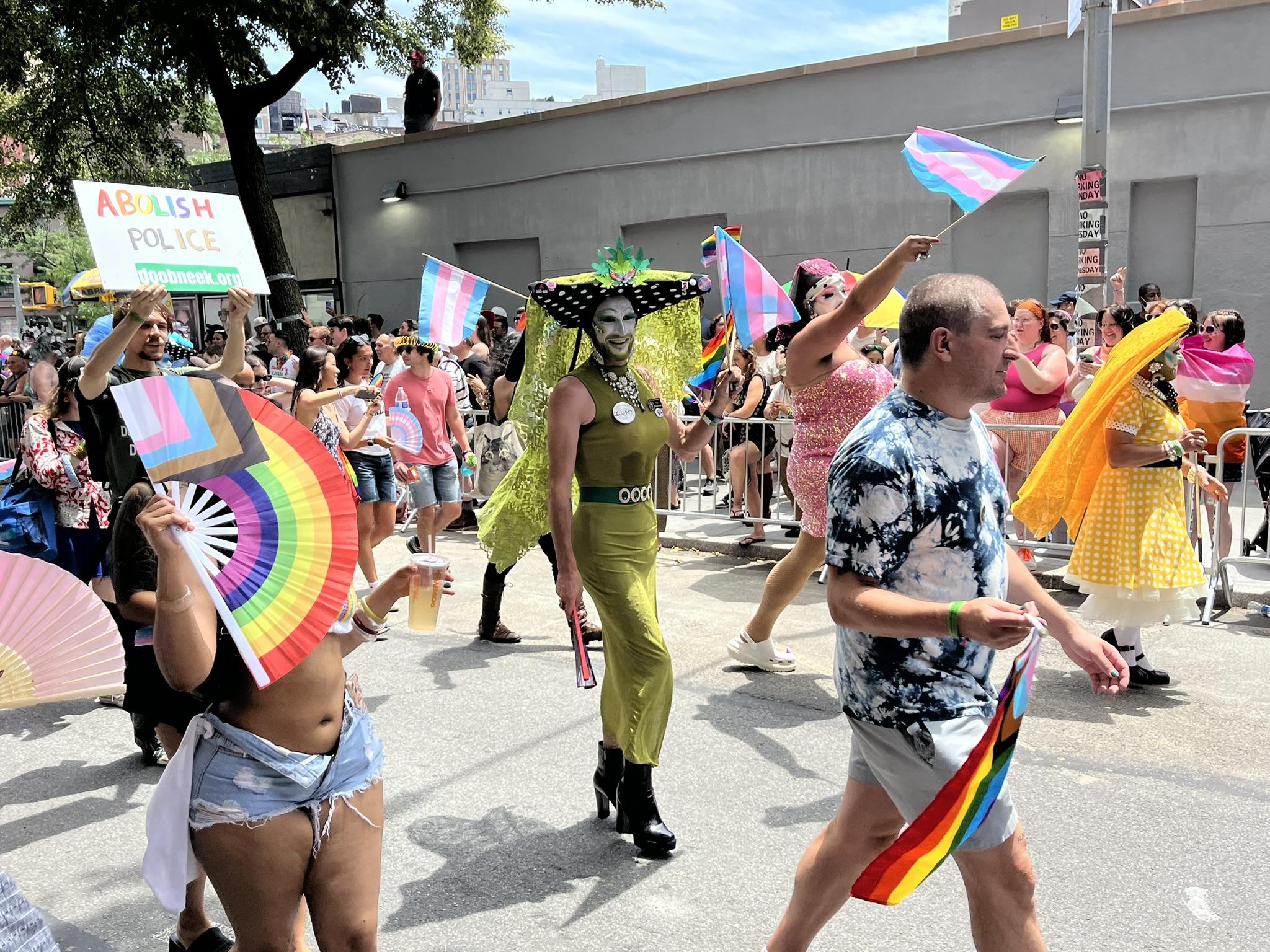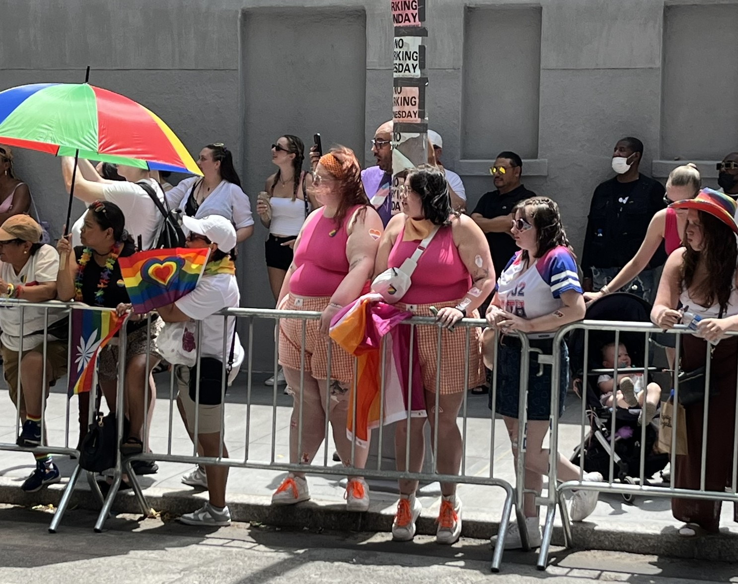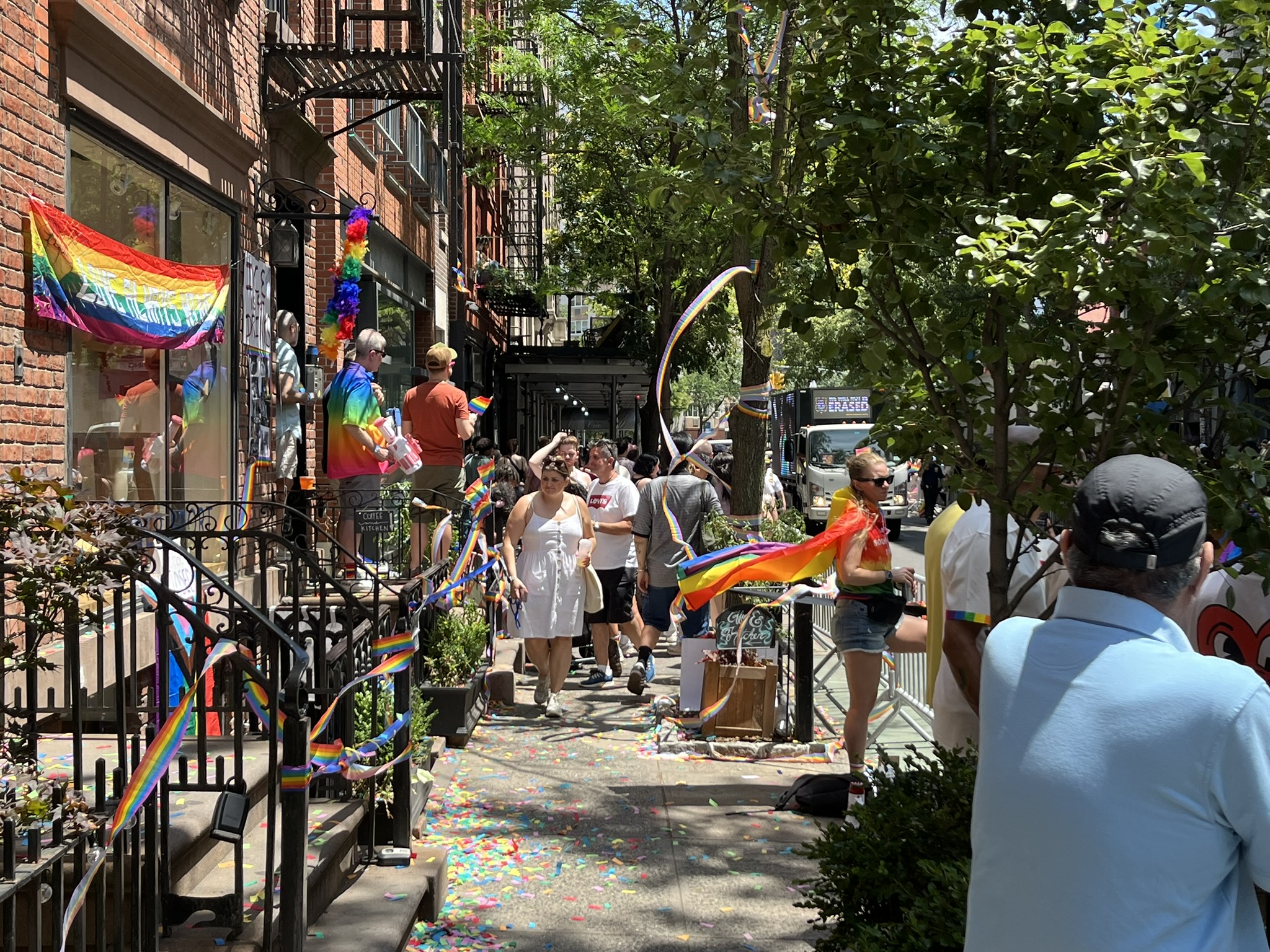 Am vorerst letzten Tag in New York gibt es noch mal ein ganz besonderes Highlight, der Christopher Street Day. Und zwar das Original, findet heute statt. Wir machen uns früh auf und stürzen uns in das sehr schräge Getümmel. Am Bahnhof und auch danach überall in der Stadt sind die Leute verkleidet, und kaum einer hat nicht eine Regenbogenfahne dabei und entsprechende Klamotten an. Sogar die Spitze des One World Trade Centers war am Abend davor in Regenbogenfarben beleuchtet. Die Strecke ist, wie bei uns beim Karneval, von viel Polizei gesichert, und überall sind Absperrungen. Die Wagen mit Fußvolk kommen nicht alle hintereinander, sondern es gibt manchmal auch 10 Minuten Pause, bis der Nächste kommt. In der Regel wird auf den Wagen und dahinter zu lauter Musik getanzt, und das Publikum jubelt und kreischt. Natürlich gibt es jede Menge Botschaften gegen die aktuelle Politik, die oft sehr lustig zum Besten gegeben werden. Etwas irritierend ist, dass die ersten paar Wagen von Politikern (alles Demokraten, natürlich) mit Wahlplakaten sind. Alles in allem hätten wir es uns fast noch etwas größer vorgestellt, aber es war ein echt großer Spaß.