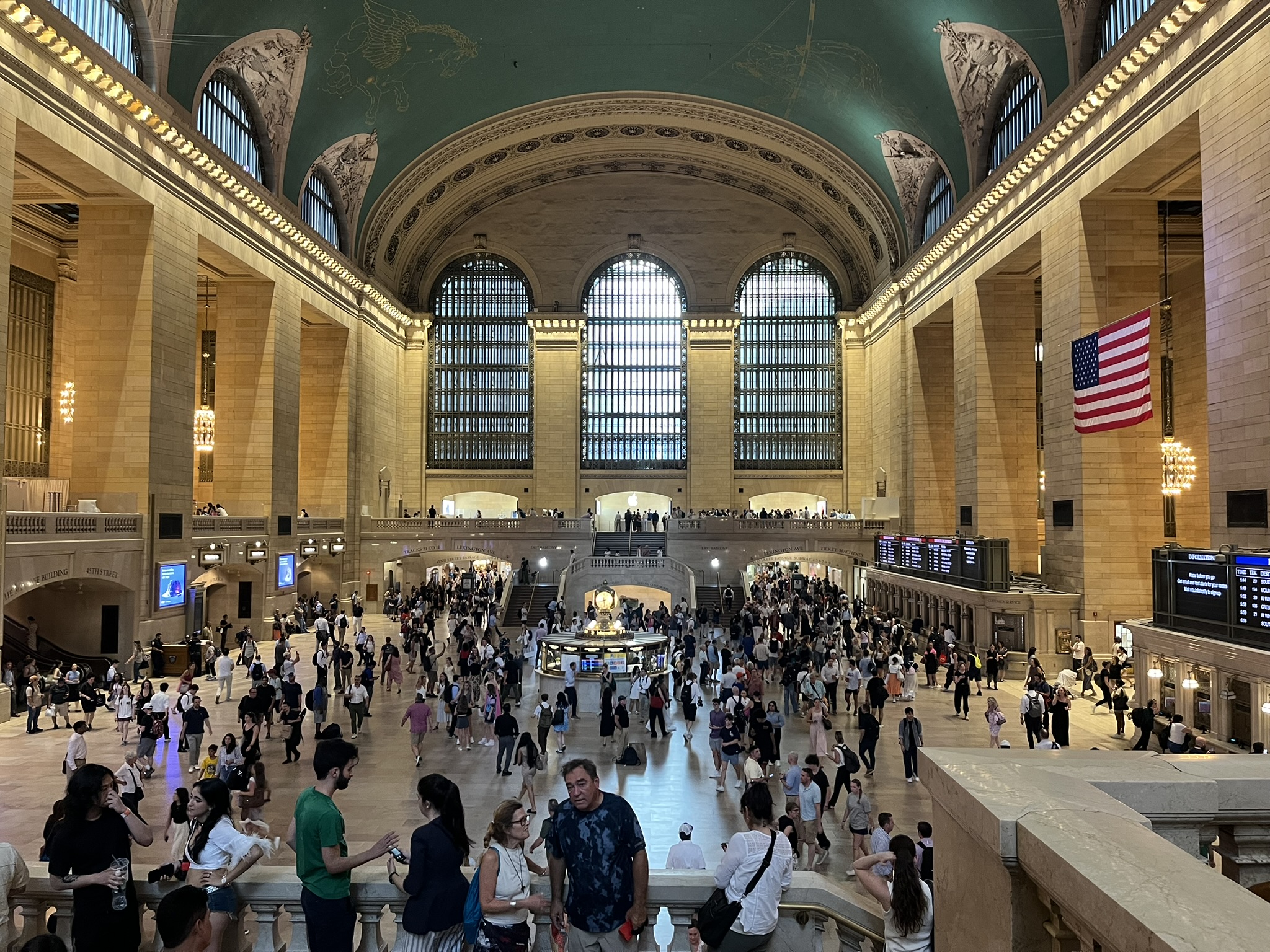 Am nächsten Tag kommt mal etwas Kunst und Kultur dran. Wir fahren wieder mit dem Zug zur Penn Station (diesmal zusammen mit Harald und Jeanette von der Huihui). Unser Ziel ist das Guggenheim Museum, was wir schon immer mal anschauen wollten. Wir laufen erst den Broadway hoch, kommen am wild leuchtendem Times Square vorbei und laufen durch den Central Park bis zur 88. Straße. Im Guggenheim sind wir beeindruckt von der Architektur. Man fährt mit dem Fahrstuhl nach oben und kann dann die Schnecke wieder herunterlaufen und die Werke anschauen. Zwischendurch kommt man an verschiedenen Räumen vorbei, wo themenmäßig Extraausstellungen sind. Man findet sehr schöne, bunte Bilder einer brasilianischen Künstlerin. Ansonsten sind dort die üblichen Verdächtigen: Picasso, Monet, van Gogh und Kandinsky. Es ist schon ein tolles Museum, wir finden aber, dass insgesamt nicht sehr viele Bilder zu sehen sind. Da bietet es sich doch an, anschließend im Central Park auf eine Wiese zu legen und ein kleines Schläfchen einzulegen. Gegen 17.00 Uhr erleben wir die 5th Avenue im Feierabendmodus. Unglaublich, was für ein Gedränge, schnell weg hier. Von der unglaublichen Grand Central Station fahren wir wieder zurück.