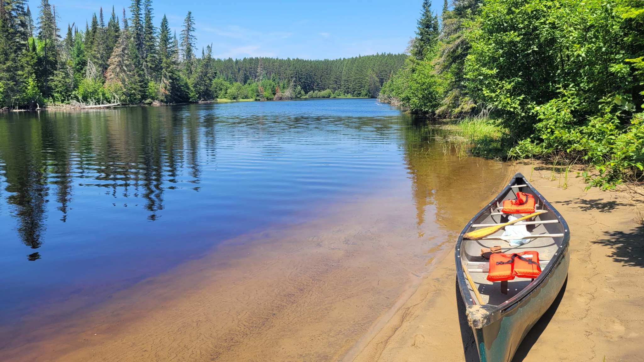 Wir verbringen die Tage nicht nur wandernd, sondern können uns dort sogar Kanus ausleihen und den Madawaska River ein paar Kilometer hinauffahren. Ein Traum, nur Tiere (wie zum Beispiel mal einen Elch oder einen kleinen Schwarzbären) sehen wir leider nicht. Der Skipper versucht sich mal im Stand-up-Paddling, ist gar nicht so schwer. Es gibt auch Regentage, an denen man nur durch die Matsche waten kann, aber das gehört hier dazu.