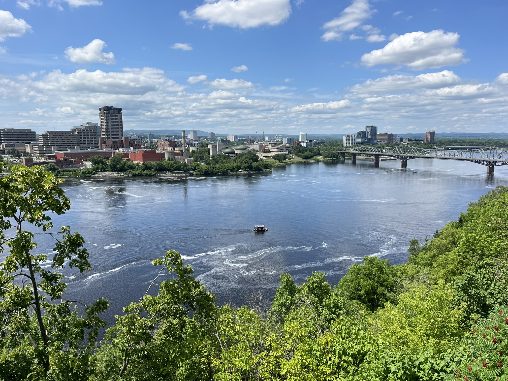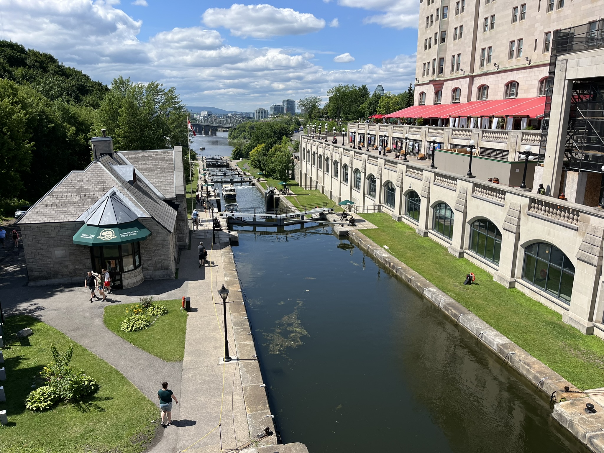 Weiter geht es dann zum nächsten Nationalpark, dem Mont-Tremblant. Auf dem Weg dahin machen wir einen Stopp in der ehrwürdigen Hauptstadt Kanadas, in Ottawa. Wir haben nur ein paar Stunden Zeit und laufen eine Runde durch die Stadt, zum Parlamentshügel und dann runter zum Fluss. Die Stadt liegt am südlichen Ufer des Ontario Rivers und damit noch im englischsprachigen Ontario. Auf der Nordseite beginnt schon das französischsprachige Quebec. Das Parlamentsgebäude und die Gegend drumherum sind gerade Großbaustelle, aber trotzdem ist ein schönes Flair vorhanden. Wir gehen vom Fluss wieder hoch zu den Markthallen, wo man wie in jeder Stadt Schmuck und Souvenirs kaufen kann. Vom Fluss aus gibt es, wie in Schottland, eine sechsstufige Schleusenanlage für Sportboote, die noch von Hand betrieben wird. Ganz nett hier, aber eigentlich reicht ein kurzer Abstecher aus. Zurück am Auto stellen wir fest, dass wir 5 Minuten über der Zeit unseres Parkscheins sind. Und zack steht dort bereits ein junger Polizist und will uns eine Knolle verpassen. Unser Hinweis, dass wir aus Deutschland kommen und nicht wie das Kennzeichen aussagt aus den USA, lässt ihn milde stimmen, und wir kommen noch mal davon.