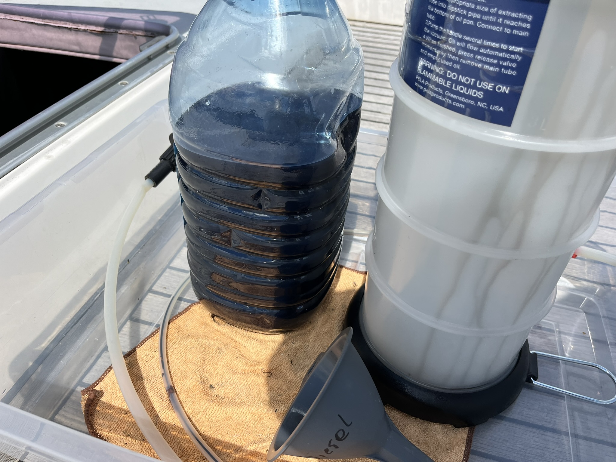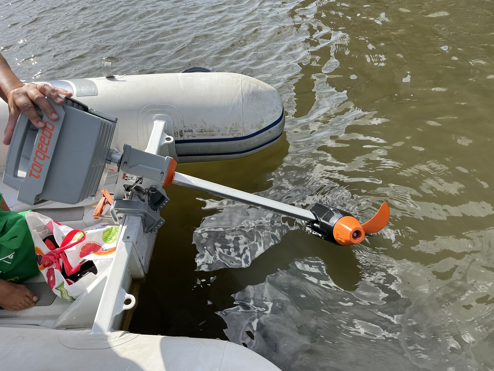 Zwischendurch legen wir auch mal wieder einen Wäschetag ein und kümmern uns um das ein oder andere technische Bordproblem. So zeigte sich bei der letzten Inspektion des Vorfilters für den Diesel, dass dort relativ viel Wasser abgeschieden wurde, was auf Wasser im Tank hinweist (wo auch immer das herkommt). Da Wasser schwerer als Diesel ist, kann man es im großen Tank relativ leicht absaugen. Es zeigt sich aber, dass beim Abpumpen vom Boden kein sichtbares Wasser mit raufkommt, scheint also doch nicht zu viel zu sein. Und dann entsteht beim Ablegen mit dem Beiboot vom Steg ein anderes Problem. Es ist Niedrigwasser, und der Propeller des Beibootes schlägt gegen einen Stein, und ein Flügel bricht ab. Das ist jetzt mal echt schlecht, mit nur einem Flügel gibt es kaum Vortrieb, und der ganze Motor schlägt und vibriert. Nach einigem Rumtelefonieren haben wir Glück, in Annapolis, wo wir in einer Woche sein wollen, gibt es einen Laden, der den Propeller tatsächlich vorrätig hat. Sie versprechen den für uns zurückzulegen, und bis dahin müssen wir halt rudern.