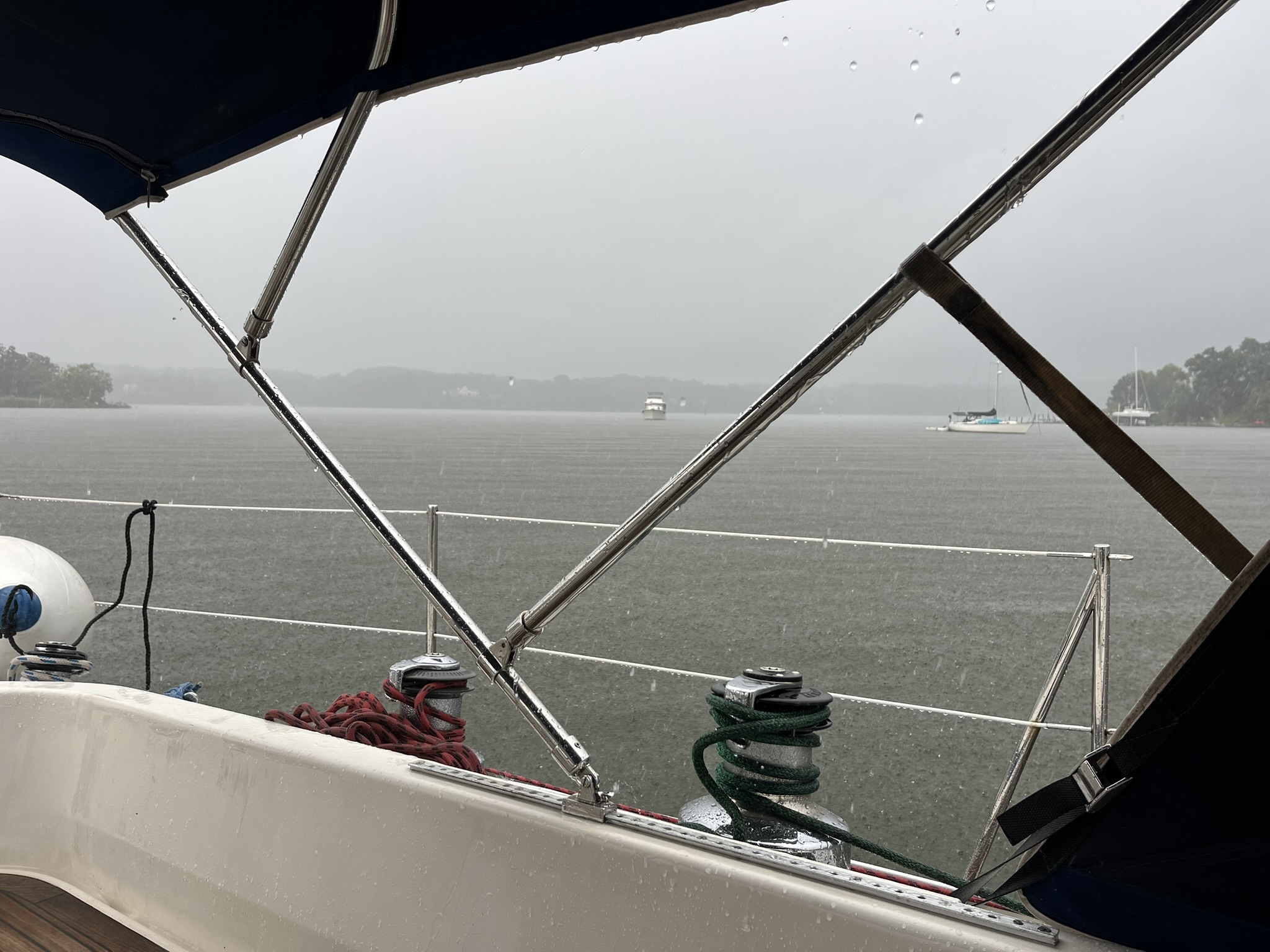Am nächsten Morgen, als es hell ist, wird uns klar, der Blitz ging einwandfrei in unsere Funkantenne auf dem Mast hinein. Die ist nämlich nicht mehr da, und auf Deck finden wir verbrannte kleine Teile, die wahrscheinlich von der Halterung sind. Wir machen uns mit dem Beiboot auf nach Annapolis und gehen zu einer der Werften, die einen guten Ruf haben. Wir treffen den Manager John, der zwar über zu viele Aufträge klagt, aber sofort bereit ist, uns zu helfen. Er meldet sich am Nachmittag zurück und sagt uns, wir sollen Montagmorgen (es ist Freitag) in die Werft an den Steg kommen. Sie würden sich den Schaden anschauen und sagen, was zu tun ist. Inzwischen ist auch die Schadensmeldung an die Versicherung raus, die die üblichen Nachweise wie Fotos, Kostenaufstellungen und Rechnungen der alten Geräte haben möchten. Wir entspannen uns über das Wochenende mit einer netten Dinghyfahrt den Creek hinauf, bis es so flach wird, dass wir nicht mehr weiterkommen.