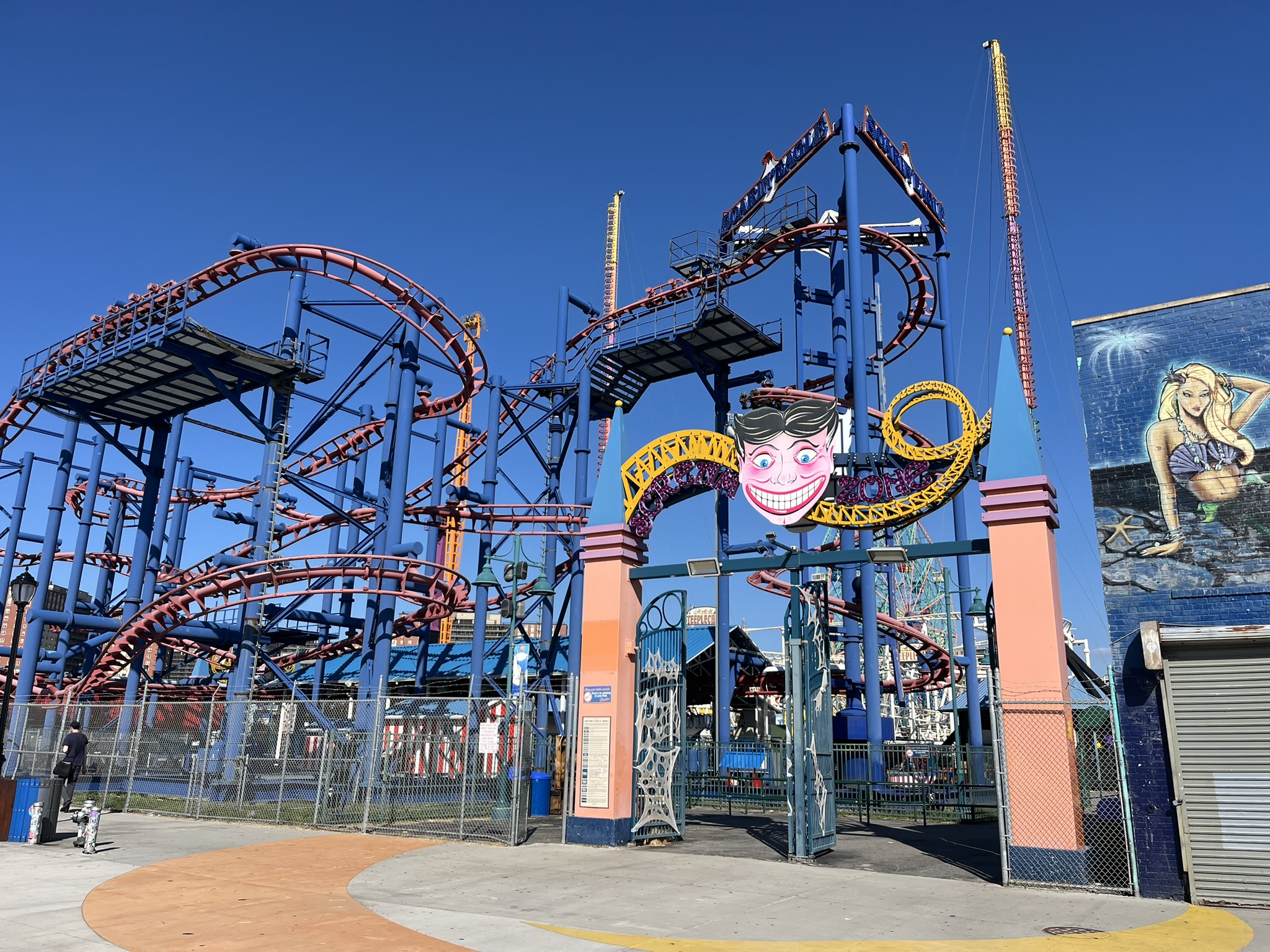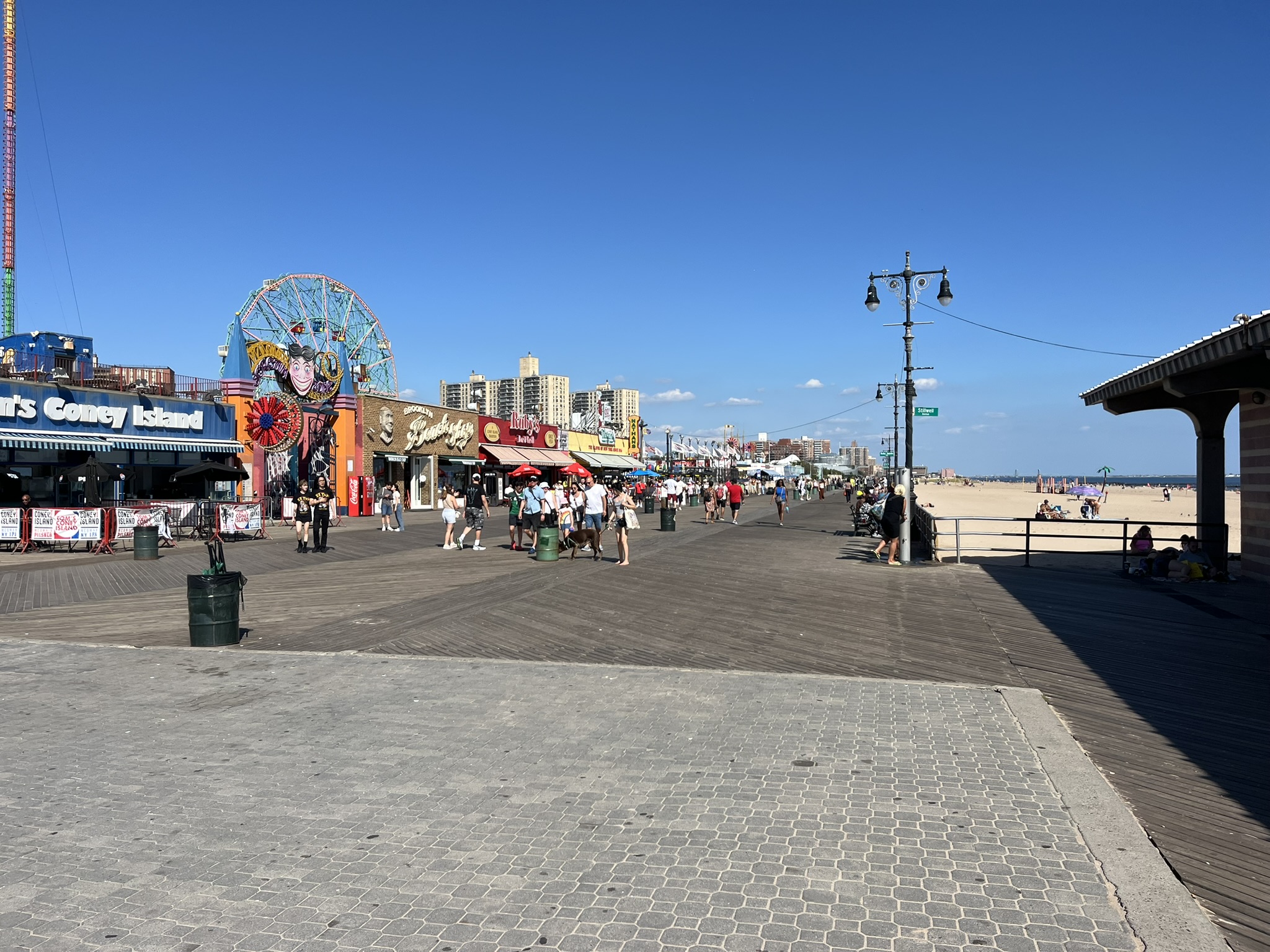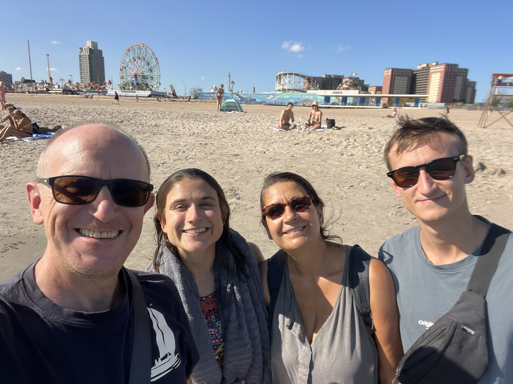 Den Abschluss der Woche bildet ein Tag in Brooklyn und auf Coney Island. Dies ist der südliche Bereich von Brooklyn und wird durch einen historischen Vergnügungspark und einen riesigen langen Strand geprägt. Dazwischen gibt es eine sehr nette, lange Holzpromenade mit diversen Fressbuden. Marlene geht direkt im warmen Atlantik schwimmen. Zu einer Karussellfahrt lassen wir uns nicht hinreißen, aber man kann wunderbar die Promenade auf und ab spazieren gehen. Auf der Rückfahrt steigen wir vor der Brooklyn Bridge aus. Da die Sonne bereits untergeht, laufen wir (und hunderte andere) über die Brücke nach Manhattan in die Dunkelheit hinein und sehen das Lichtermeer angehen. Als wir drüben ankommen, ist es dunkel. Wir fahren mit der Fähre wieder zurück nach Jersey und haben die beleuchtete Skyline in ihrer ganzen Pracht vor uns, New York ist echt aufregend.