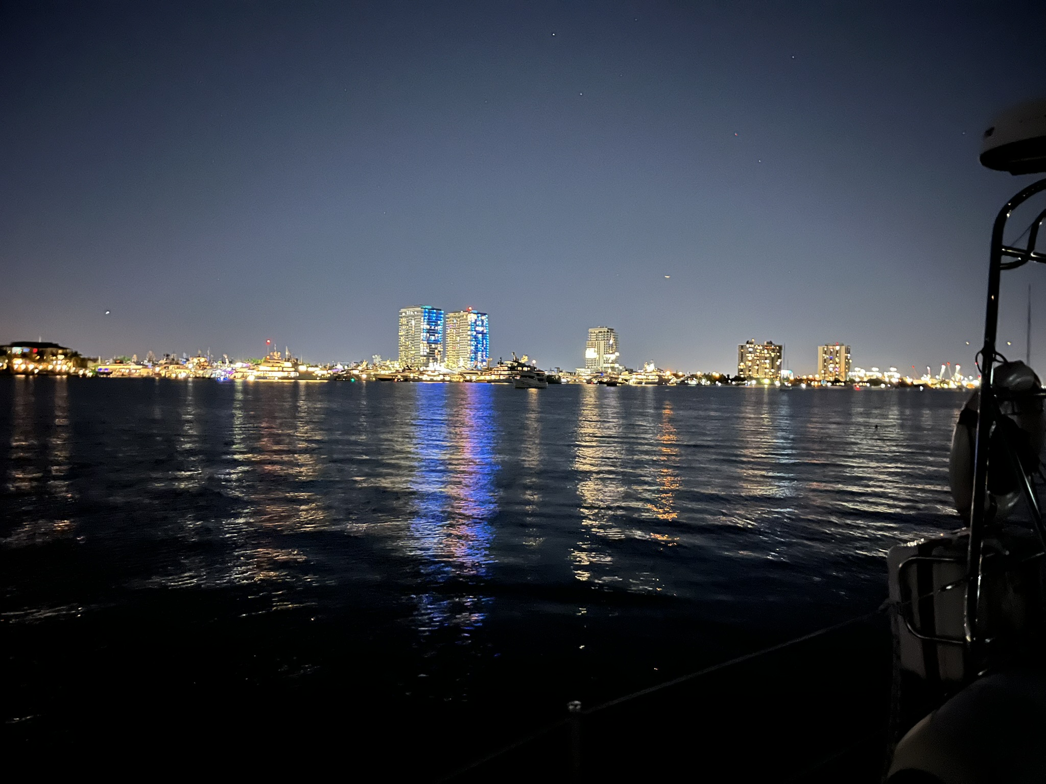 Wieder müssen wir die Abfahrtszeit mit der ablaufenden Strömung, aber auch der Ankunft am Ziel bei Tag anpassen. Das nächste Ziel ist Palm Beach, was über 200sm entfernt ist und mindestens 40h Fahrzeit bedeutet. Wir machen uns mittags auf und haben die ersten 30h perfekten Wind und rasen nur so die Küste runter. Am Morgen kommen wir an Cape Canaveral vorbei, und man kann gut die vielen Abschussrampen der unterschiedlichen Unternehmen und der NASA erkennen. Am Nachmittag soll eine Rakete von Space X mit Starlink Satelliten hochgehen, und wir überlegen kurz, ob wir nicht stoppen sollen. Die Einfahrt nach Cape Canaveral ist allerdings mit Schleuse, und weil wir heute etwas träge sind, lassen wir es sein. Am Nachmittag sehen wir dann die Rakete aus der Entfernung in den Himmel steigen. Selbst aus der Entfernung immer noch beeindruckend.