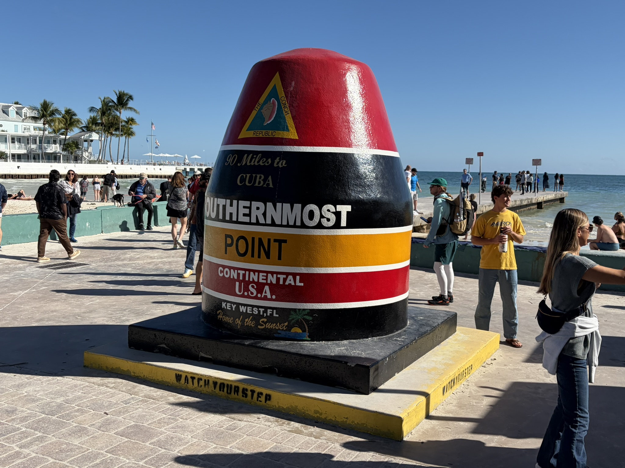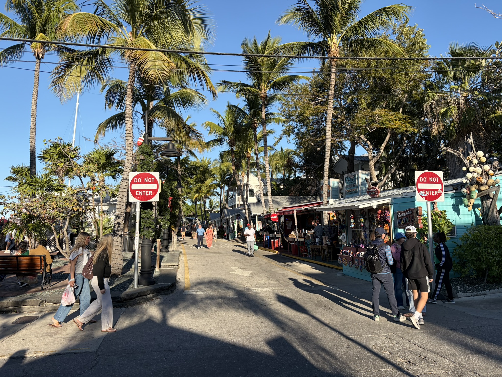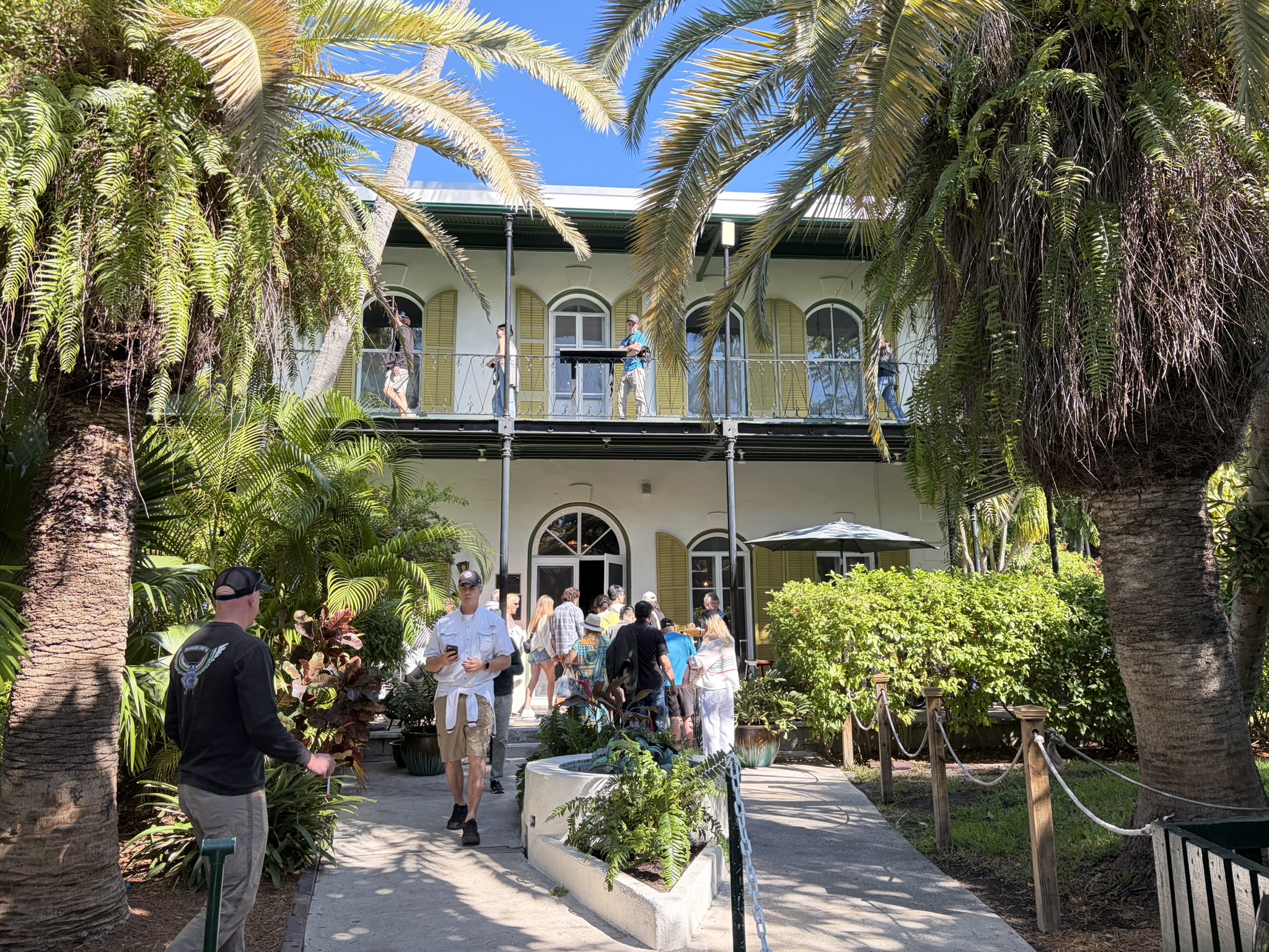 Am nächsten Morgen hat sich der Wind glücklicherweise etwas beruhigt, und wir wagen es an Land. Die einzige Möglichkeit, dorthin zu kommen, ist in der Marina an einem extra dafür eingerichtetem Steg. Dafür muss man auch pro Tag 15 Dollar abdrücken, ist aber dafür auch mitten in der Stadt. Das Wetter ist wunderbar, und wir haben einen herrlichen Tag, bei dem wir die Stadt erkunden. Wir beginnen am historischen Hafen, wo man an alten Gebäuden aus Holz vorbeikommt, in denen schöne Kneipen und die üblichen Souvenirläden sind. Insgesamt ist es schon sehr touristisch und am Neujahrstag auch voller Leute. Aber angenehm dabei, nicht so übertrieben amerikanisch pompös. Wir schlendern weiter bis ins Zentrum zur Duvall Str. Auch dort ist in den Kneipen richtig was los, und an allen Ecken und Enden gibt es Live Musik. Mal Countrymusik, mal Rock oder manchmal auch etwas Blues. Nicht weit vom Zentrum steht das Haus, in dem Ernest Hemingway in den 30er Jahren gelebt hat und was inzwischen ein Museum ist. Ziemlich schicke Villa mit großem Garten. Den Eintritt schenken wir uns und wandern stattdessen weiter zum Southernmost Point of America. Das ist eine große Boje, vor der eine 100m lange Schlange mit Leuten ist, die sich davor fotografieren lassen wollen. Jede Bar und jeder Laden hier unten im Süden der Stadt nennt seinen Laden übrigens so. Zum Beispiel die Southernmost Icecream, Beerbar und weiß der Geier was sonst noch alles. Wir gehen in den Southernmost Fish and Chips Biergarten und genießen bei angenehmer Live Musik eines jungen Musikers eben jenes Essen und ein Bier. Wir sind wirklich angetan von Key West und finden, dass unsere Amerikatour so ein würdiges Ende findet.