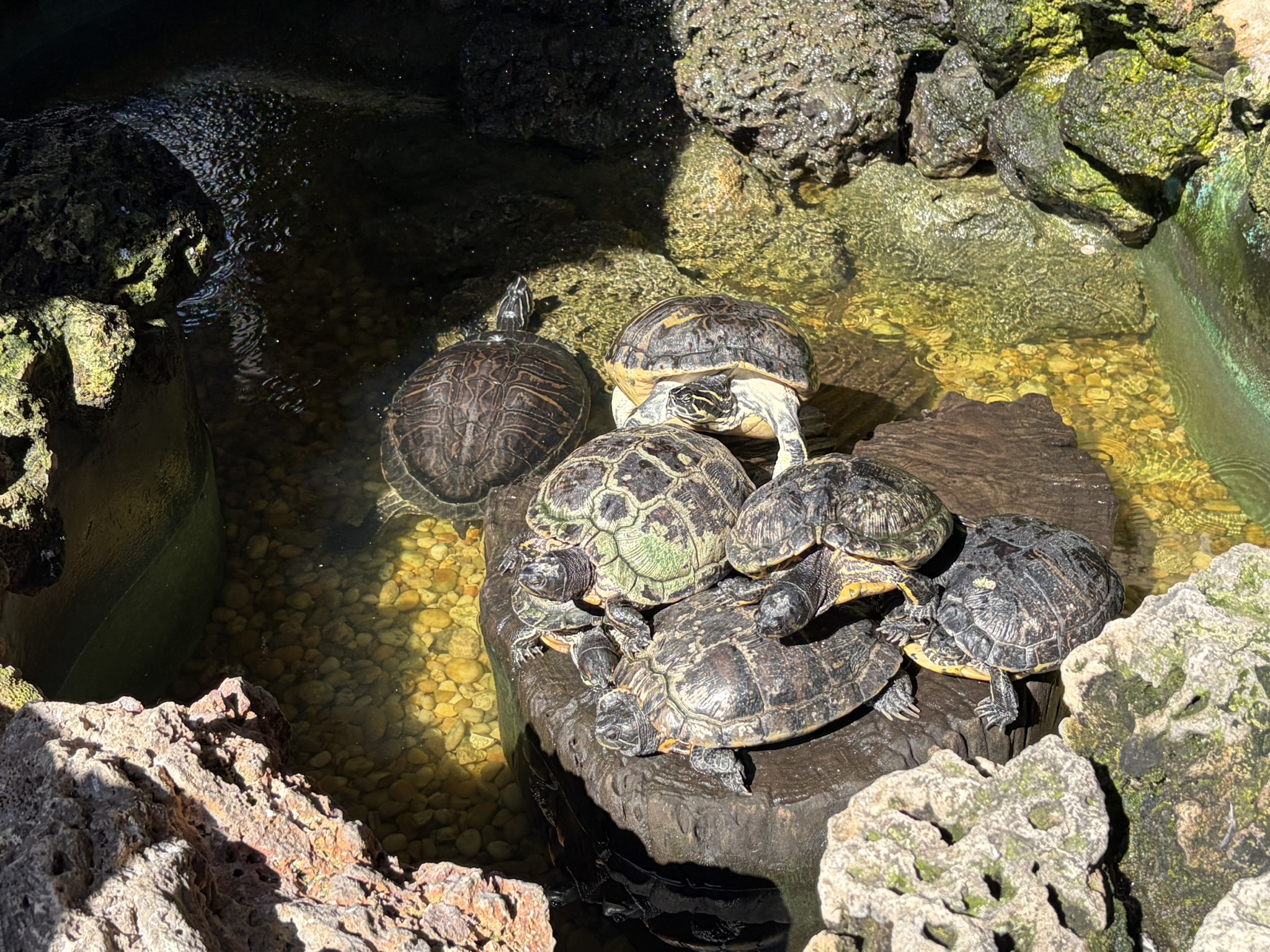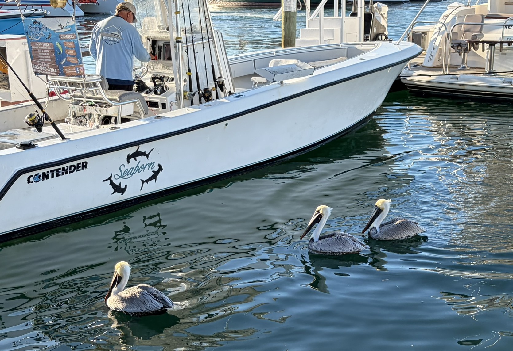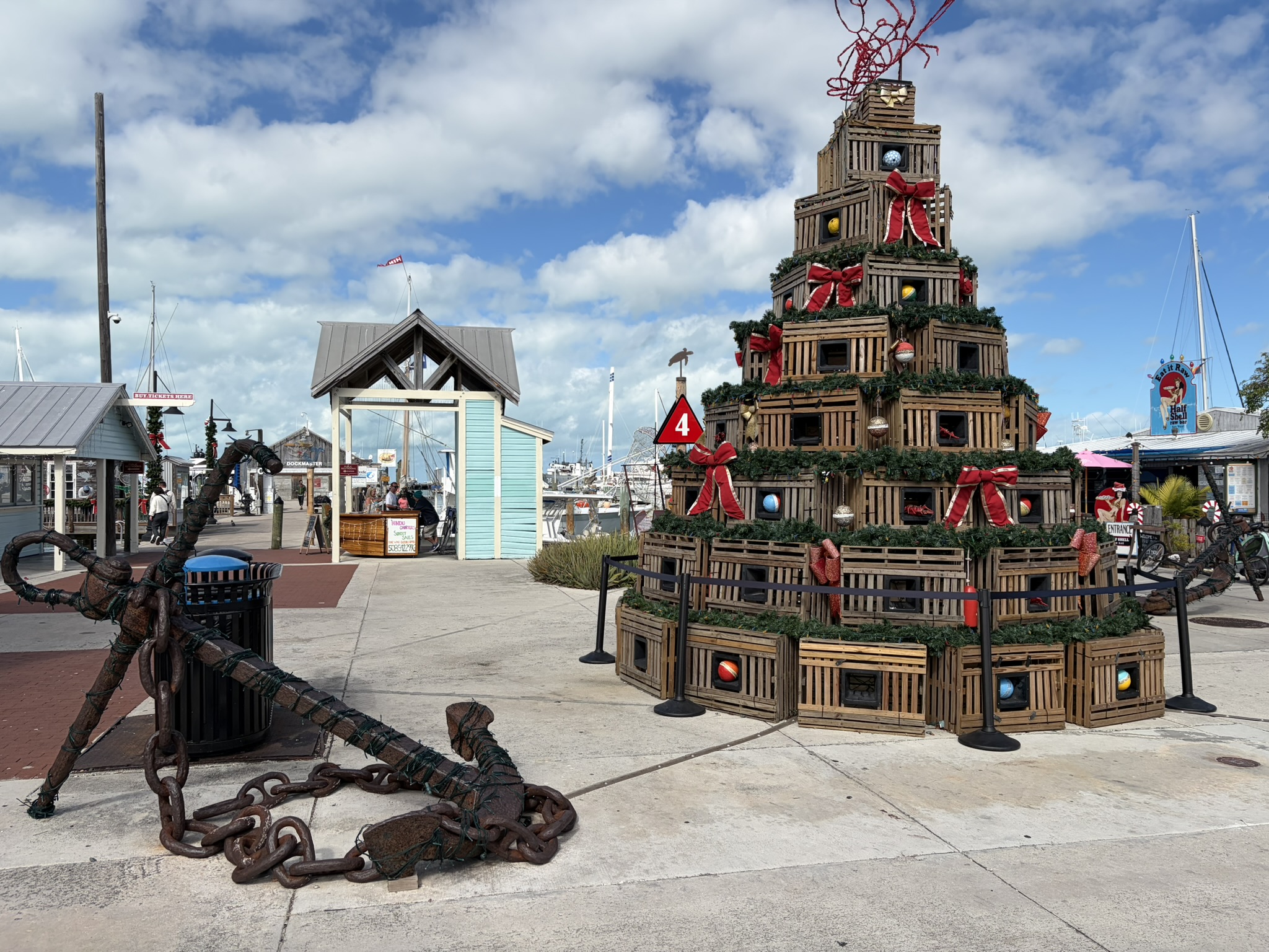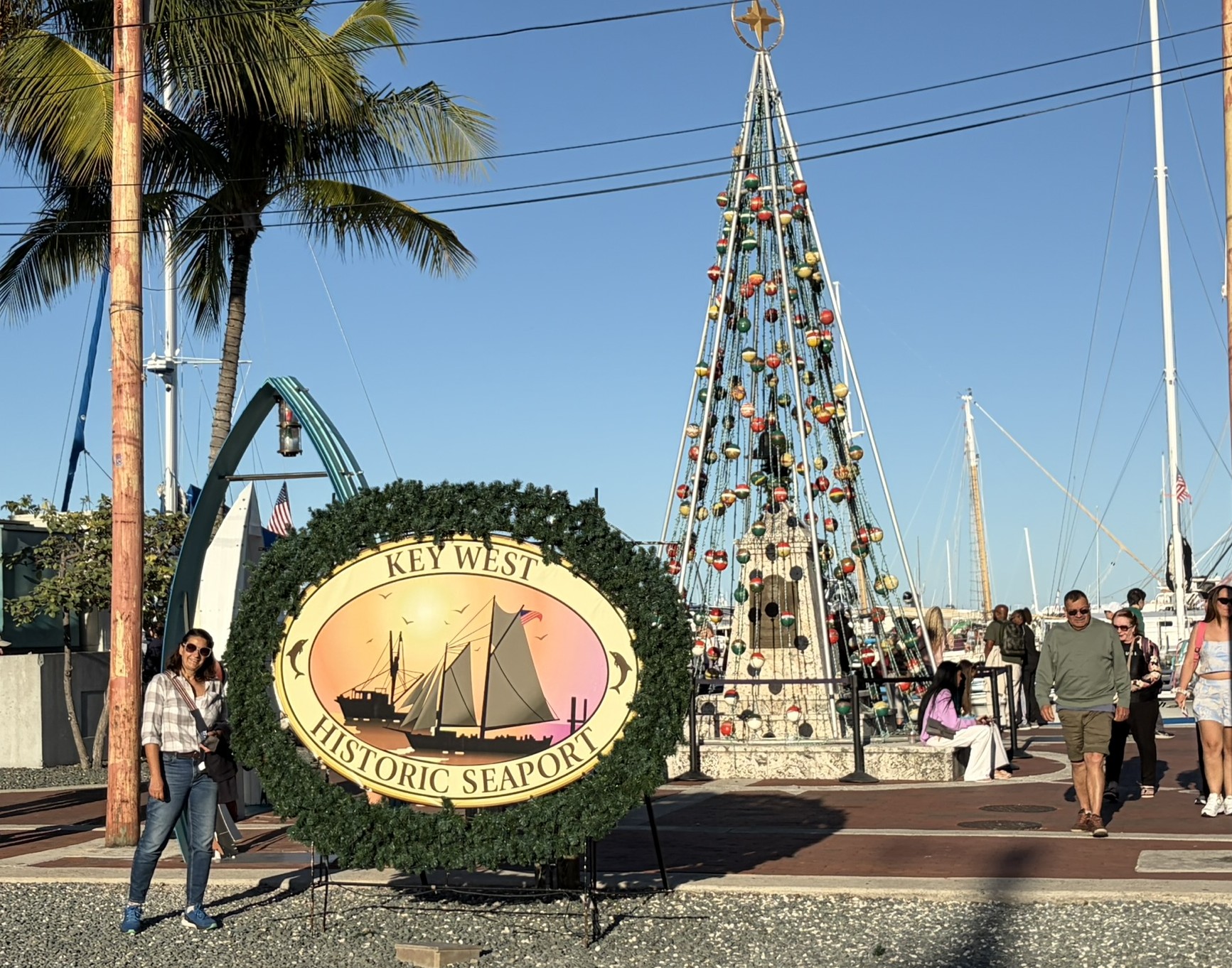 Am nächsten Morgen hat sich der Wind glücklicherweise etwas beruhigt, und wir wagen es an Land. Die einzige Möglichkeit, dorthin zu kommen, ist in der Marina an einem extra dafür eingerichtetem Steg. Dafür muss man auch pro Tag 15 Dollar abdrücken, ist aber dafür auch mitten in der Stadt. Das Wetter ist wunderbar, und wir haben einen herrlichen Tag, bei dem wir die Stadt erkunden. Wir beginnen am historischen Hafen, wo man an alten Gebäuden aus Holz vorbeikommt, in denen schöne Kneipen und die üblichen Souvenirläden sind. Insgesamt ist es schon sehr touristisch und am Neujahrstag auch voller Leute. Aber angenehm dabei, nicht so übertrieben amerikanisch pompös. Wir schlendern weiter bis ins Zentrum zur Duvall Str. Auch dort ist in den Kneipen richtig was los, und an allen Ecken und Enden gibt es Live Musik. Mal Countrymusik, mal Rock oder manchmal auch etwas Blues. Nicht weit vom Zentrum steht das Haus, in dem Ernest Hemingway in den 30er Jahren gelebt hat und was inzwischen ein Museum ist. Ziemlich schicke Villa mit großem Garten. Den Eintritt schenken wir uns und wandern stattdessen weiter zum Southernmost Point of America. Das ist eine große Boje, vor der eine 100m lange Schlange mit Leuten ist, die sich davor fotografieren lassen wollen. Jede Bar und jeder Laden hier unten im Süden der Stadt nennt seinen Laden übrigens so. Zum Beispiel die Southernmost Icecream, Beerbar und weiß der Geier was sonst noch alles. Wir gehen in den Southernmost Fish and Chips Biergarten und genießen bei angenehmer Live Musik eines jungen Musikers eben jenes Essen und ein Bier. Wir sind wirklich angetan von Key West und finden, dass unsere Amerikatour so ein würdiges Ende findet.