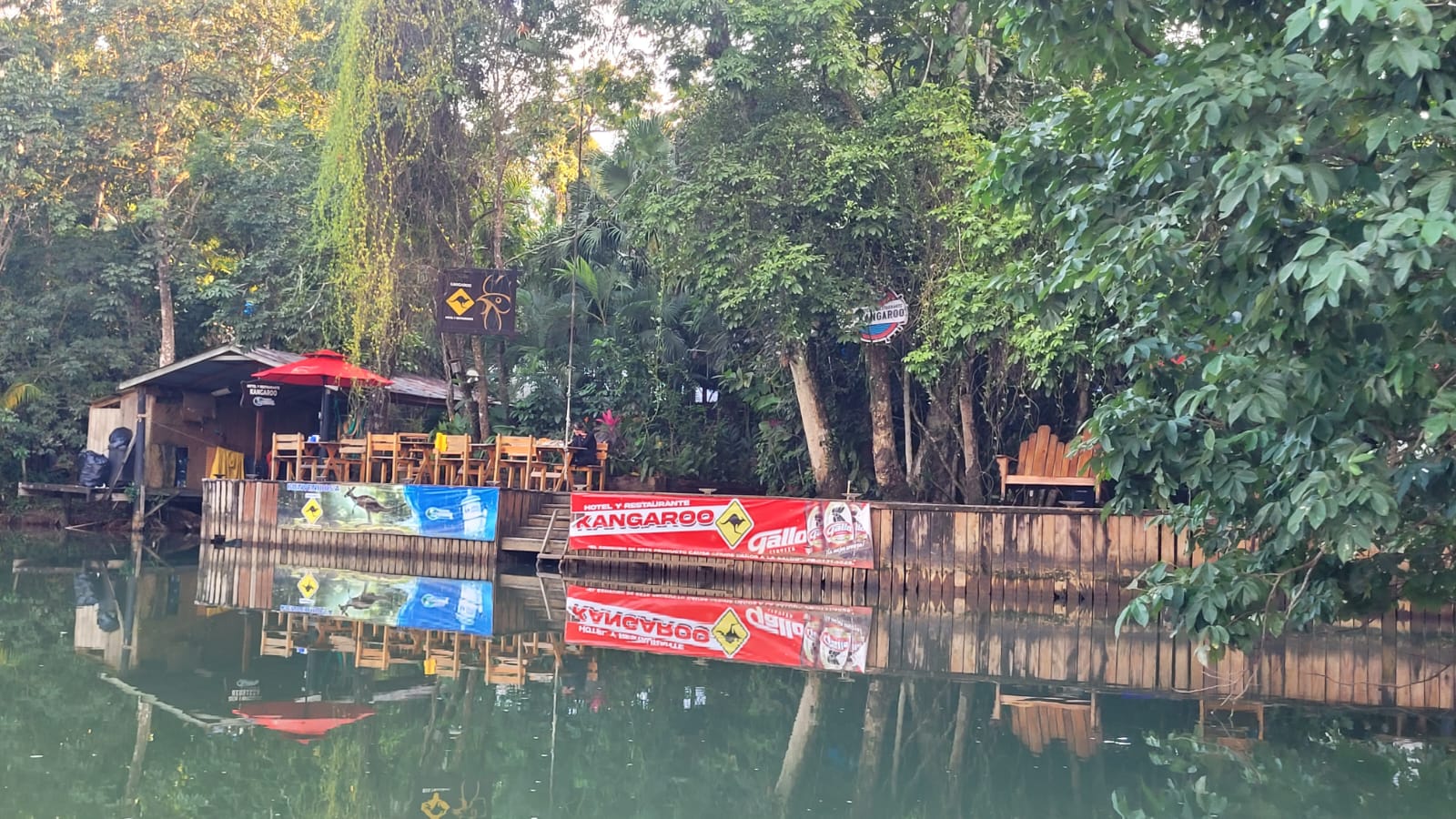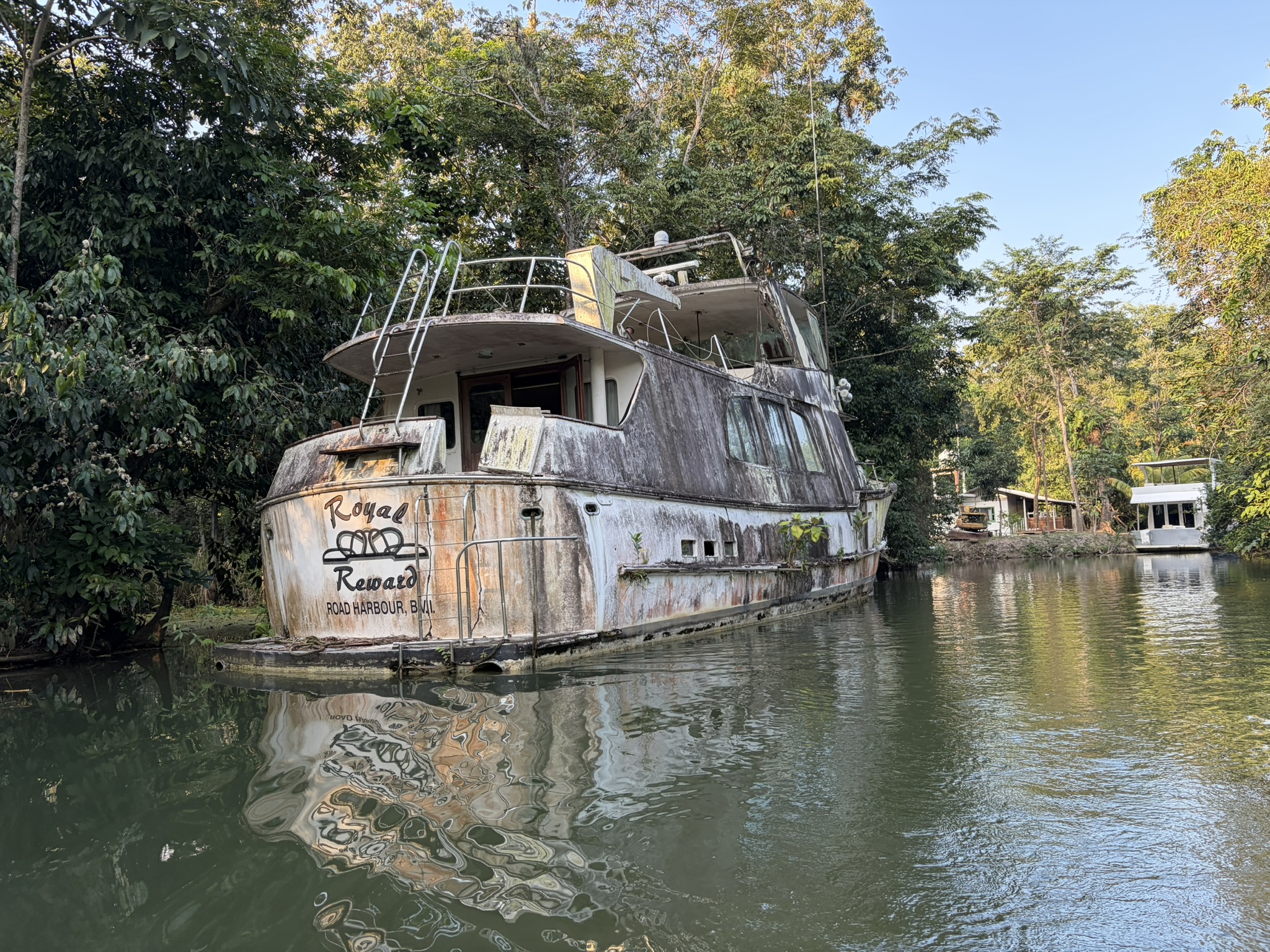 Da am Montag der Elektrikumbau beginnen soll, beschließen wir, für einige Tage von Bord zu flüchten. Auryn wird zur Baustelle und Strom ist in der Woche wahrscheinlich auch nicht an Bord. In der Nähe gibt es eine Herberge in einem Seitenarm, die auch nur per Boot erreichbar ist, das Hotel Kangaroo. Dort fahren wir vorab schon mal hin und finden einen wirklich netten Ort. Viel machen kann man hier nicht, aber wir sind ja motorisiert. Wir lernen zwei deutsche Backpackerinnen kennen und machen zusammen eine kleine Fahrt durch die Seitenarme hinter dem Hotel. Alles Dschungel hier, zwischen den Bäumen irritieren immer wieder Wracks von ehemals ziemlich schicken Booten, die am Rand stehen. Am Montag ziehen wir hier für ein paar Tage ein.