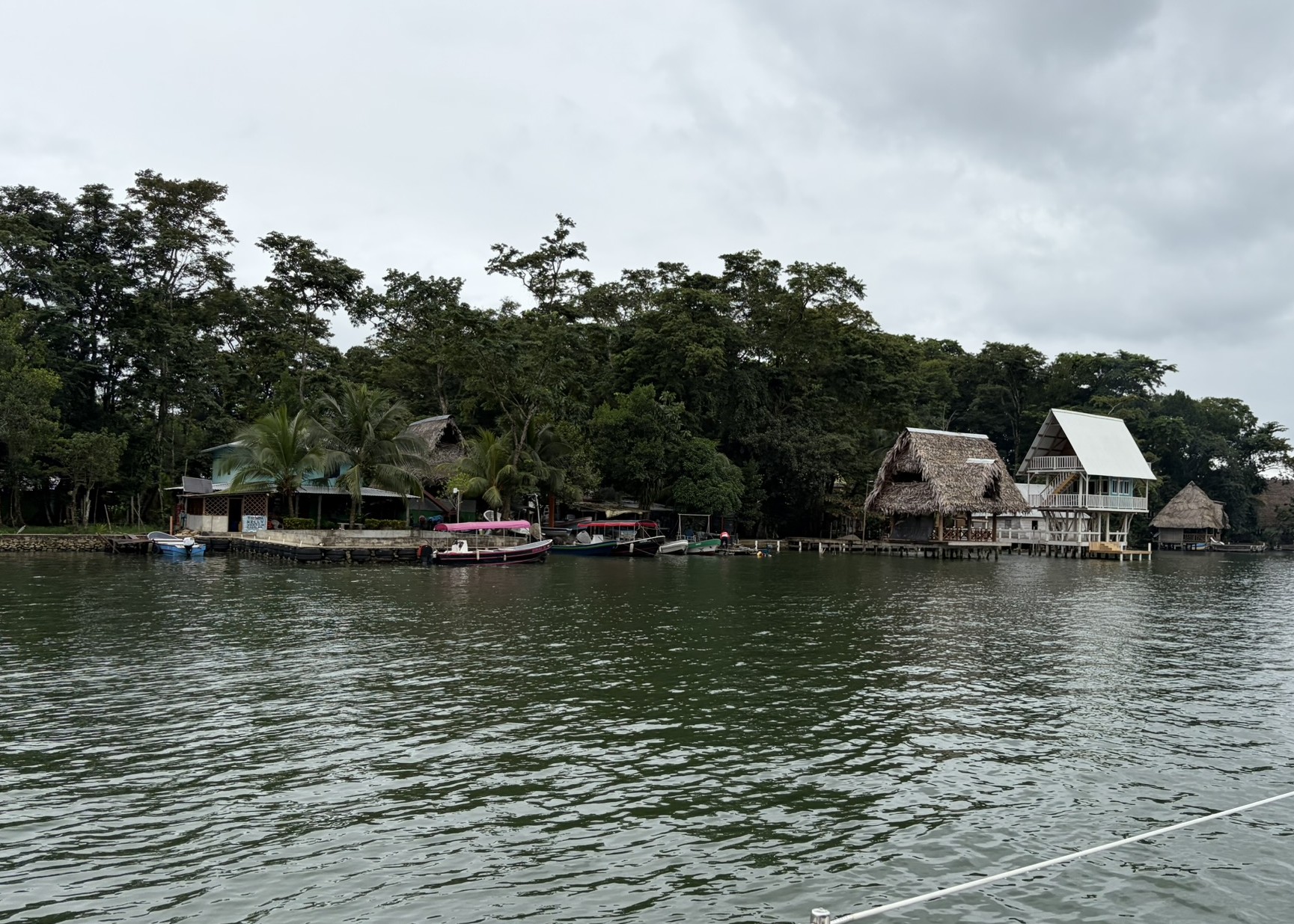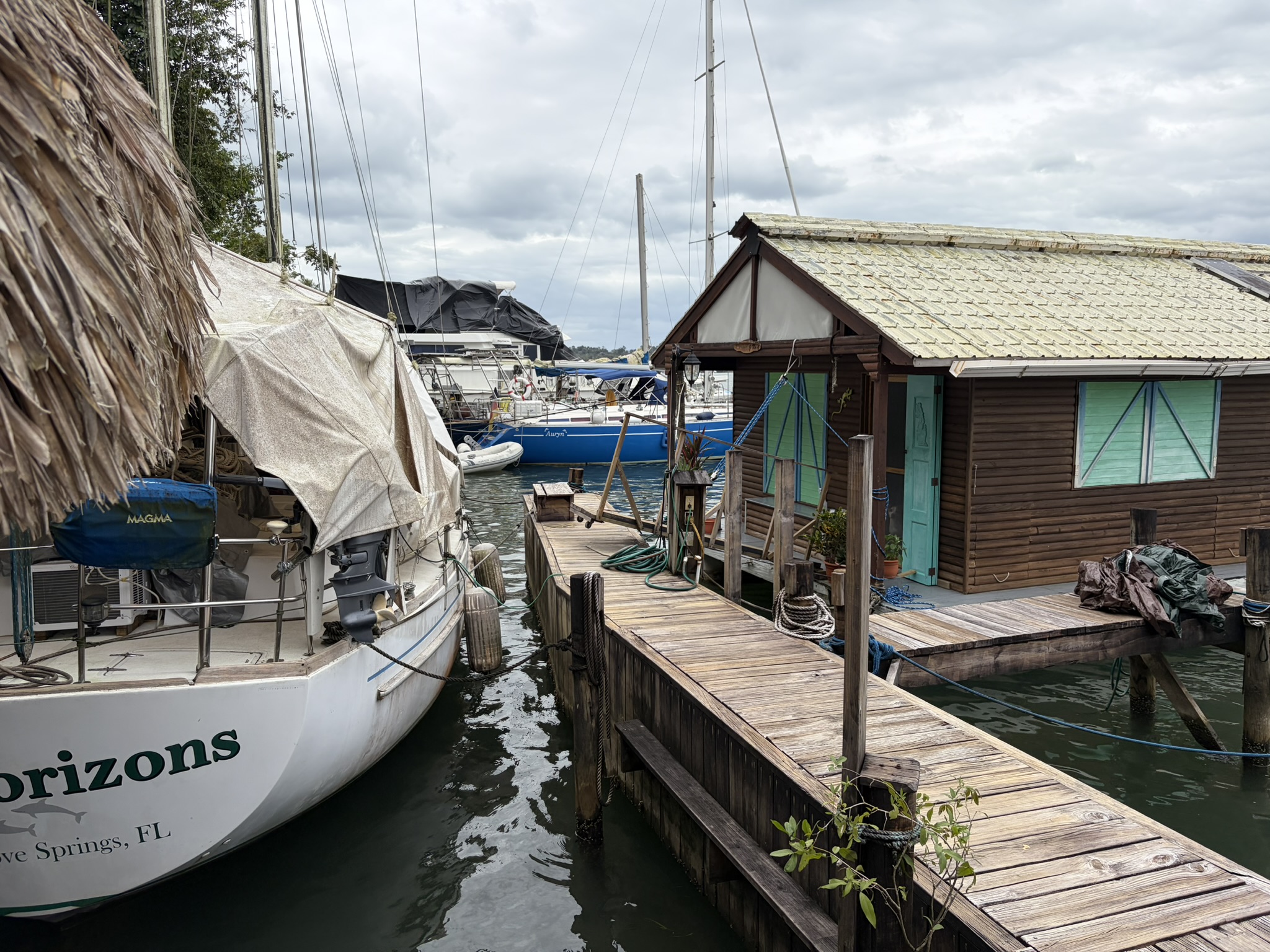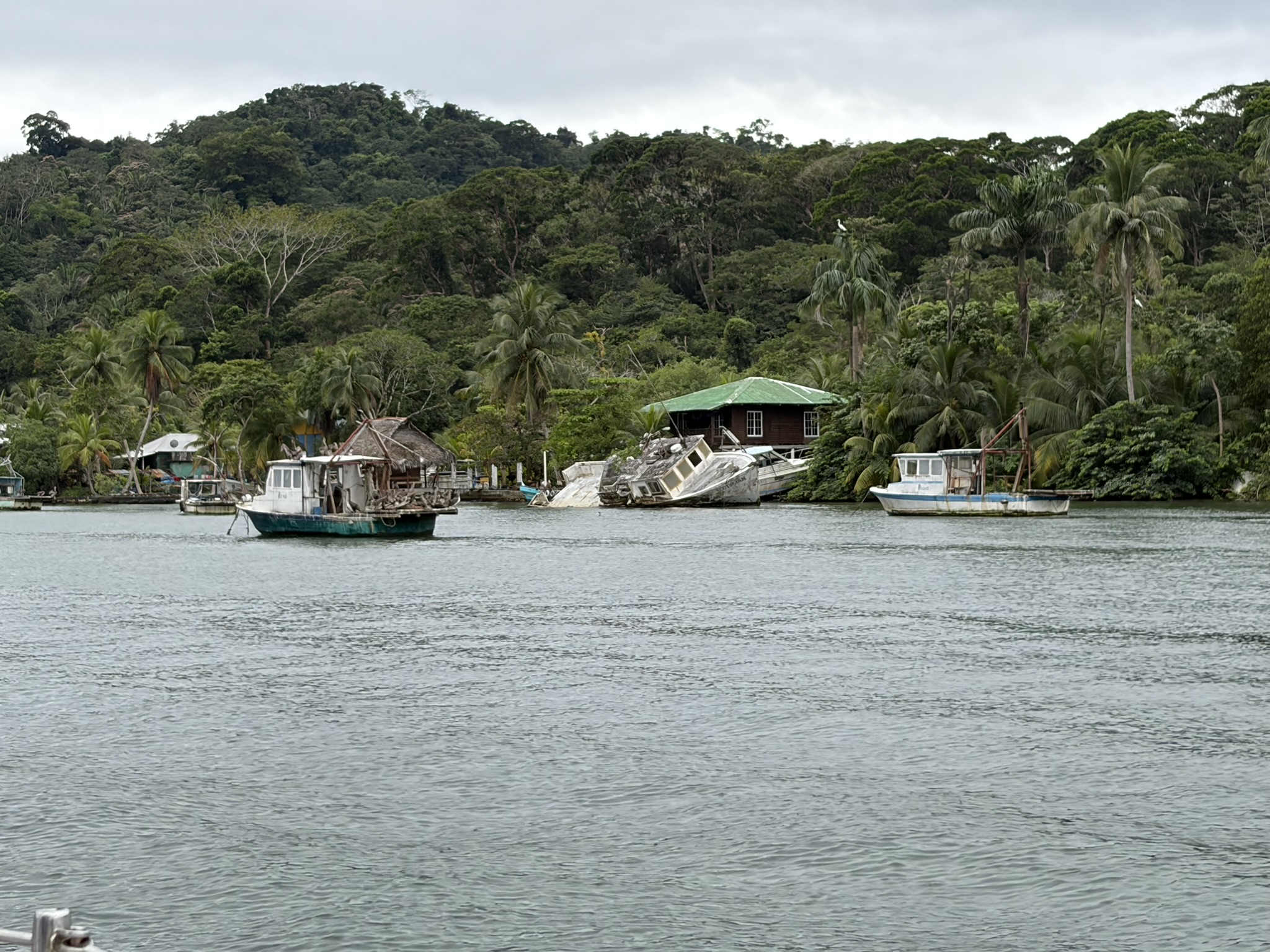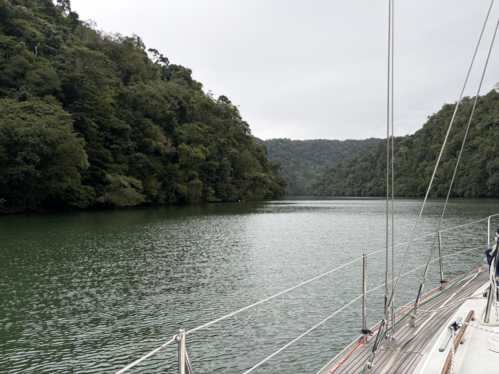 Aufi geht es zu unserem Ziel, den Rio Dulce hinauf, wir sind froh, den wackeligen Ankerplatz vor Livingston verlassen zu können. Der Rio Dulce ist ein ziemlich kurzer Fluss von etwa 40 km Länge und entspringt in Guatemala dem Lago Izabal. Und genau dort wollen wir auch hin, wir haben einen Termin in der Marina von Captain John gemacht, mit dem angegliederten Yachtservice seines Neffen Erwin. Wunderschön fahren wir den Fluss hinauf, der sich durch den Dschungel schlängelt. Im Vergleich zu den Flüssen in den USA sieht man hier ausgesprochen viele Vögel in den Bäumen. Zwischendrin wird der Fluss zu einem See, bis er wieder schmaler wird. Plötzlich sieht man an den Ufern diverse Marinas und kleine Werften, in denen hunderte von Booten stehen. Das ist hier ein wahres Mekka, in dem vor allem in der Hurrikan-Saison viele Segler ihr Boot stehen und reparieren lassen. Wir hatten uns für Captain John entschieden, weil er damit wirbt, alle Gewerke bedienen zu können. Da es heute ziemlich windig ist und man quasi frei rückwärts anlegen muss, ohne seitliche Unterstützung, werden wir gebeten, noch eine Nacht vor Anker gegenüber zu bleiben. Am nächsten Morgen klappt es, und wir werden von gefühlt 10 Leuten empfangen, die Auryn vertäuen. Hier werden wir die nächsten 6 Wochen bleiben. Captain John ist ein alter US-Amerikaner und hat sich hier vor über 20 Jahren niedergelassen und die Marina aufgemacht. Nach und nach kamen dann die Handwerker hinzu. Interessant ist, dass man den Ort nur per Boot erreicht, eine Straße oder einen Weg gibt es nicht. Die Anlage ist wirklich sehr schön und erstaunlich gut ausgestattet. Es gibt diverse Metall- und Holzverarbeitungsmaschinen, mehrere Werkstätten, die alle am Ufer in den Dschungel hineingebaut sind. Verbunden ist alles durch Holzstege.