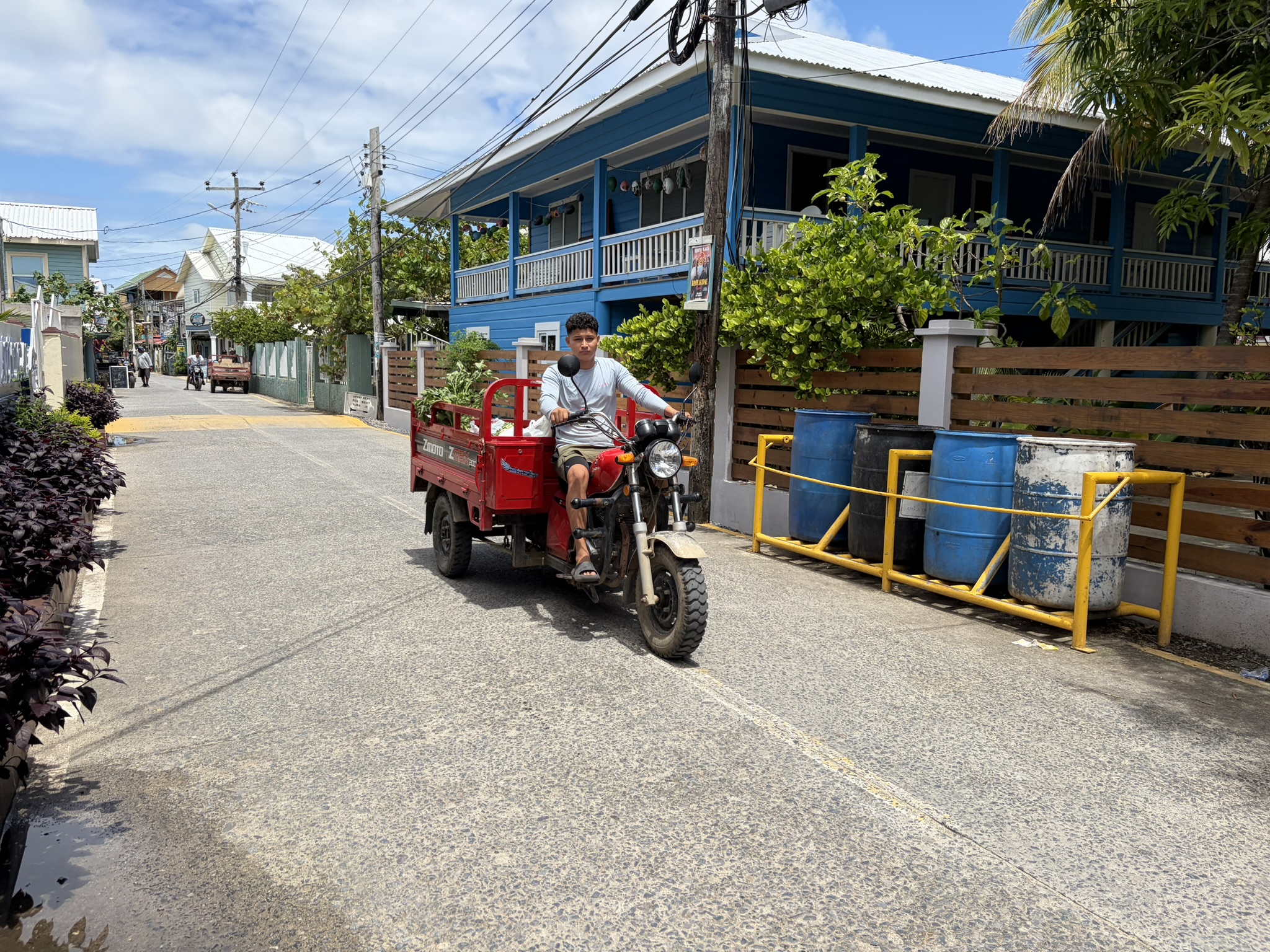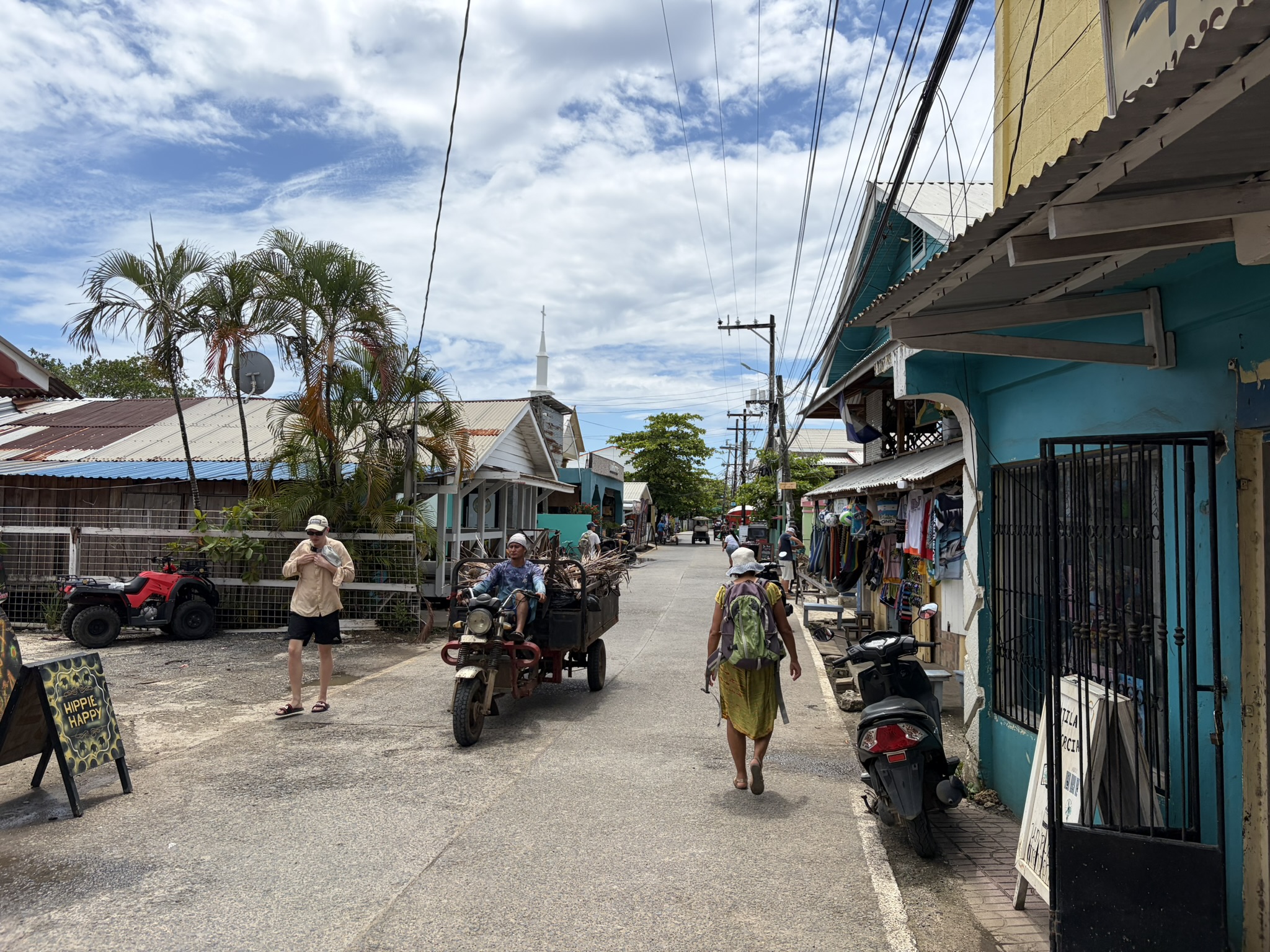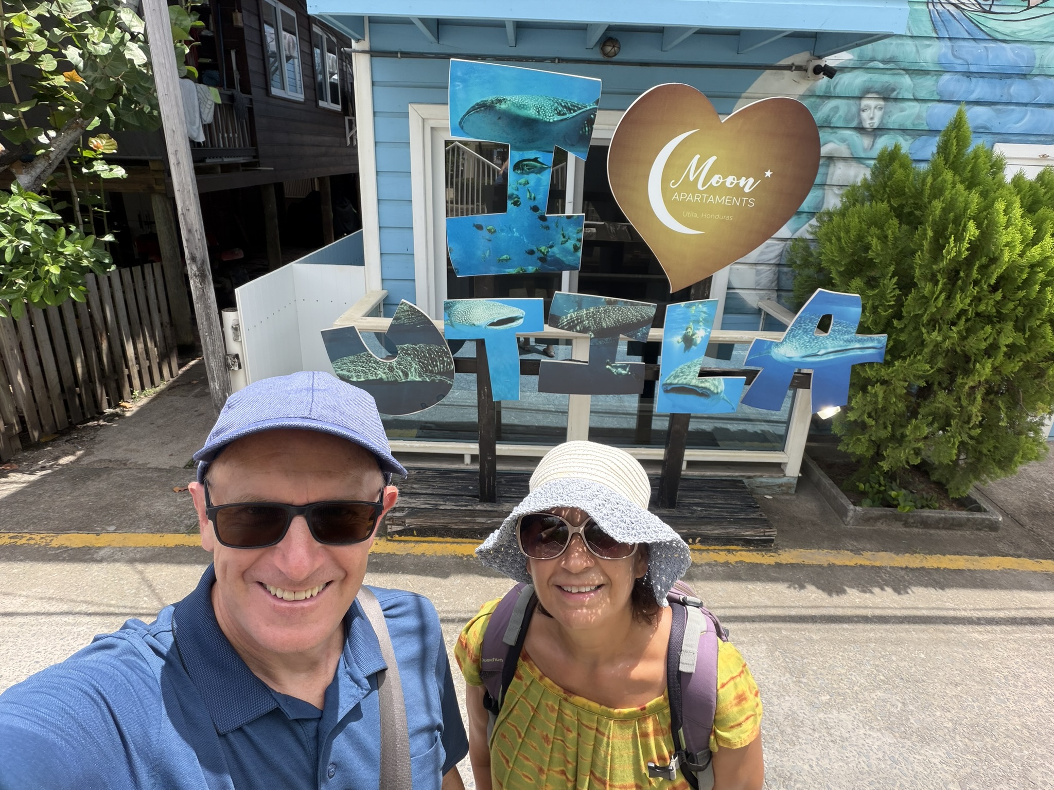 Am nächsten Morgen geht es rüber, den Hauptort von Utila anzuschauen, und natürlich einklarieren, wir sind schließlich in Honduras. Wir gehen zur Immigration, wo uns eine nette Dame ganz ordentlich die Stempel in den Pass drückt. Um auch unserem Boot einen legalen Status zu geben, müssen wir noch nach nebenan zum Capitano des Hafens. Auch er ist nett, und nach Abgabe einer kleinen Ankergebühr für die Woche bekommen wir eine Zarpe. Das ist eine Genehmigung, mit der wir in ganz Honduras rumfahren dürfen. Die Insel hat ca. 4000 Einwohner und ist zum großen Teil touristisch ausgerichtet. Die meisten kommen wegen des Tauchens hierhin. Das Korallenriff zieht sich hoch bis Belize und ist eines der größten der Welt. Der Ort hat eine schmale, aber vielbefahrene Hauptstraße, wo sich das Leben abspielt. Ein Laden neben dem anderen, Restaurants und ohne Ende Tauchshops. Es ist alles sehr laut und nicht wirklich gemütlich. Wir suchen einen Laden, unsere kleine Tauchflasche aufzufüllen, die es einfacher macht unseren Propeller freizuschneiden. Es klappt aber nicht, der Anschluss der Flasche ist nicht kompatibel. Da müssen wir weiter mit der Hand pumpen.