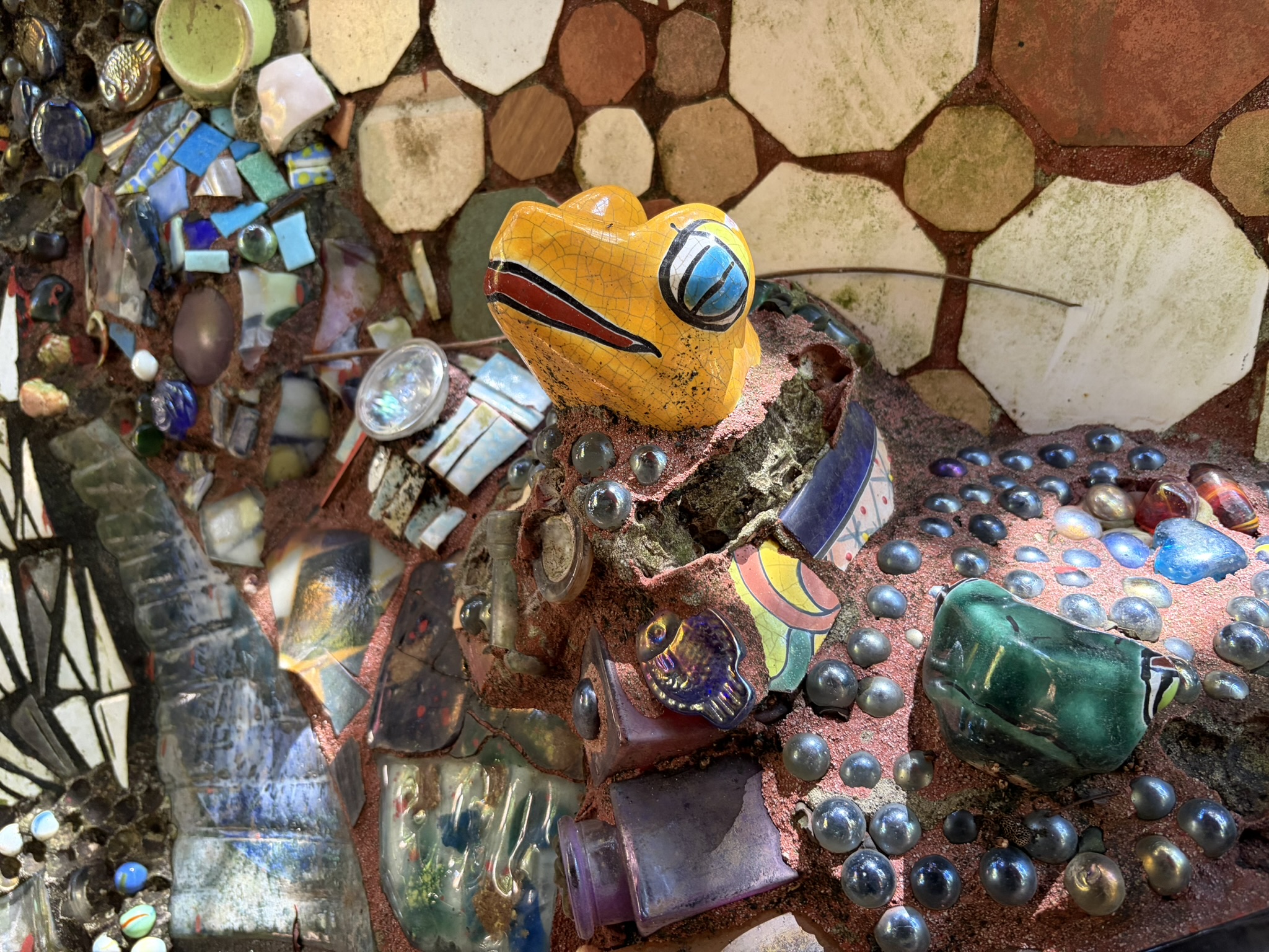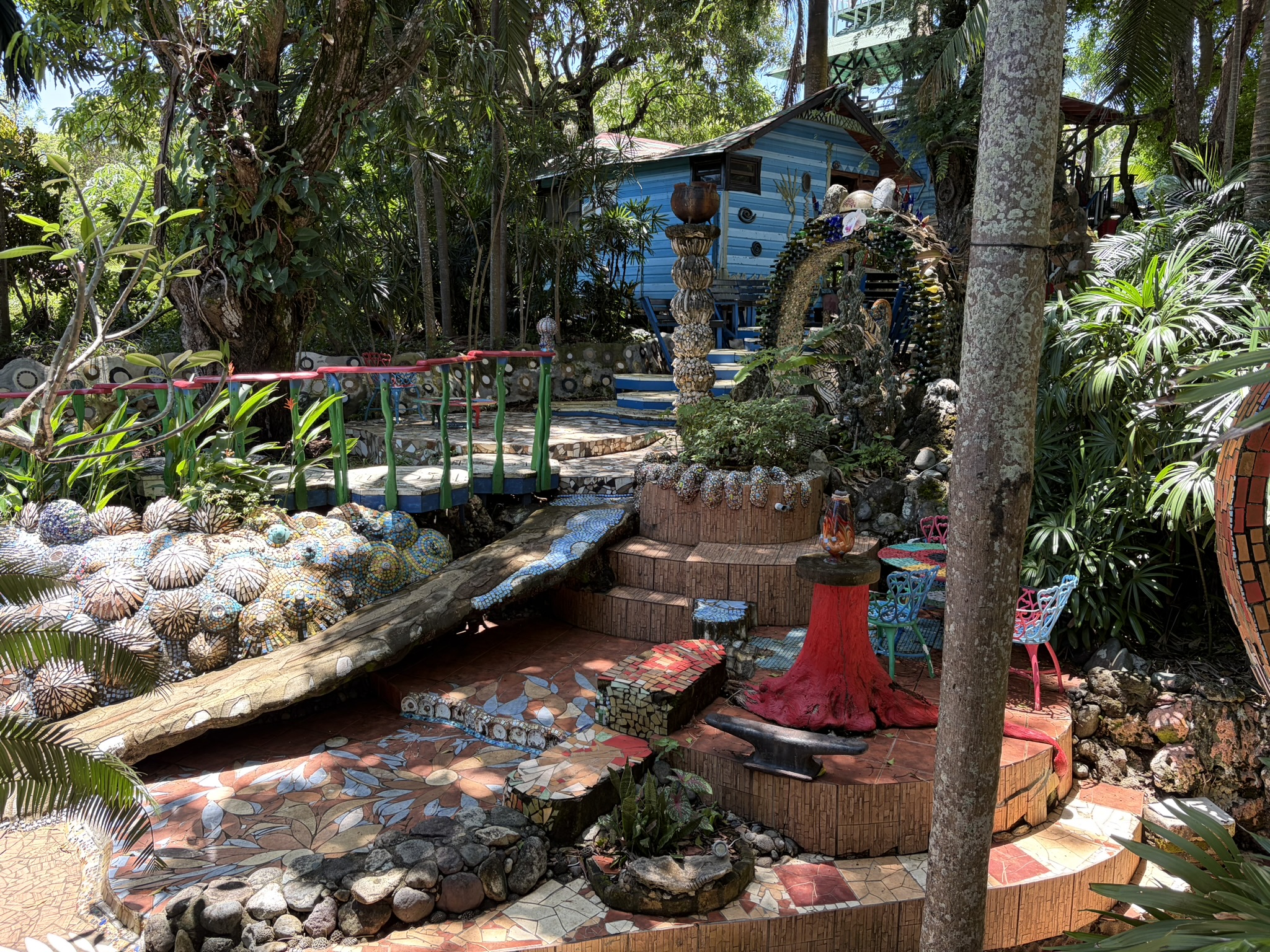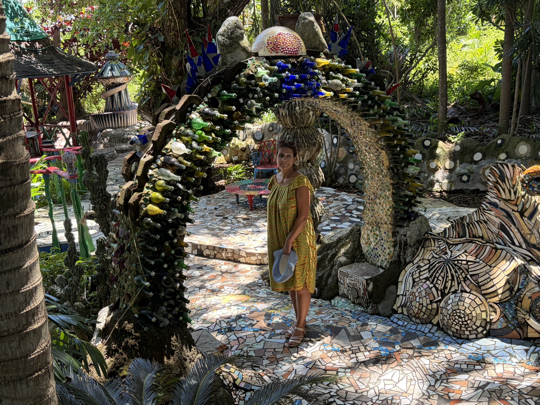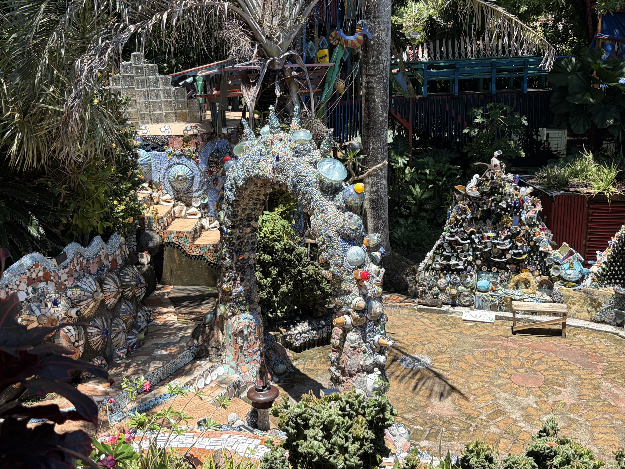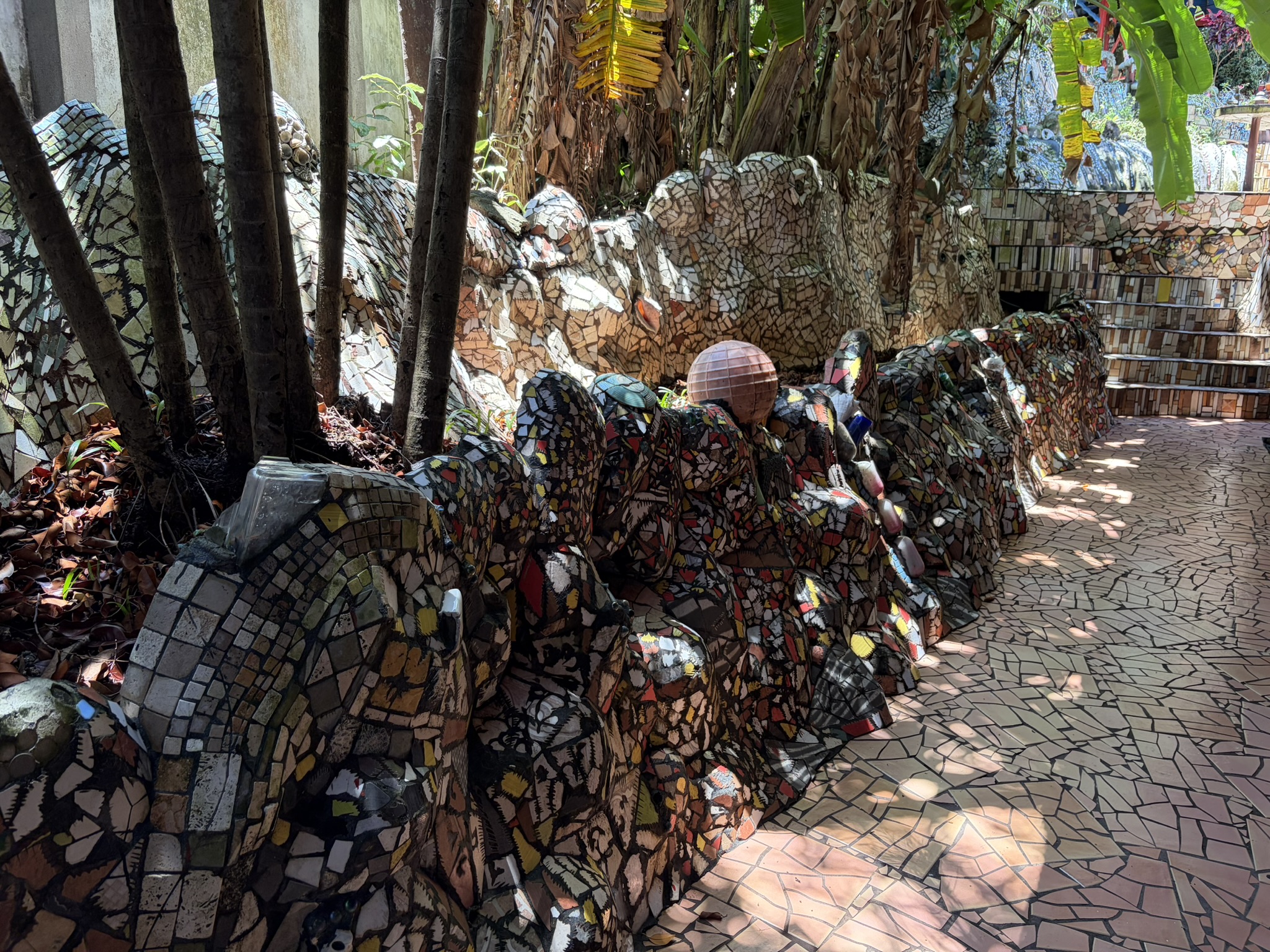 Wir entdecken weiter oben im Ort einen Garten, der komplett aus Mosaiksteinen besteht. Das hatten wir zuletzt in Kuba noch gesehen. Dieser ist erstaunlich groß, sehr abwechslungsreich und geschmackvoll gestaltet. Es gibt quasi keinen Flecken, der nicht irgendwie verziert ist.