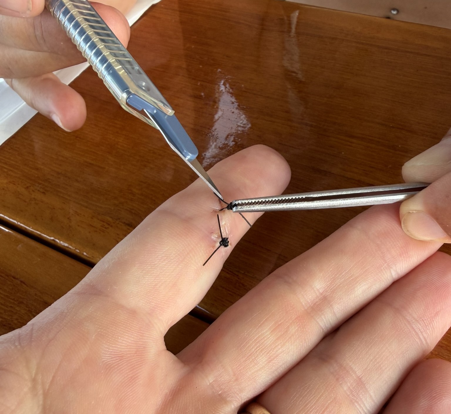 Zurück an Bord müssen wir die kleine Tauchflasche von Hand aufpumpen, was laut Hersteller 20–30 Minuten dauert. Haha, selten so gelacht. Wir brauchen mit Pausen locker eine Stunde und haben sie auch nur zu 75 % gefüllt. Eigentlich müsste das dann aber noch immer für 5 Minuten unter Wasser reichen. Der Skipper macht sich ans Werk und geht mit Flasche und Messer unter das Boot, die Schraube freischneiden. Es dauert aber keine 2 Minuten, da ist die Pulle bereits leer. Wahrscheinlich war ich zu aufgeregt und habe zu hektisch geatmet. Den Rest bekomme ich dann in ein paar Tauchgängen ohne die Flasche freigeschnitten. Erleichterung macht sich breit. Da die Finger schön durchgeweicht sind, bekomme ich nach 10 Tagen von Schwester Natascha die Fäden von der Quetschung am Finger gezogen. Fühlt sich wieder gut an.