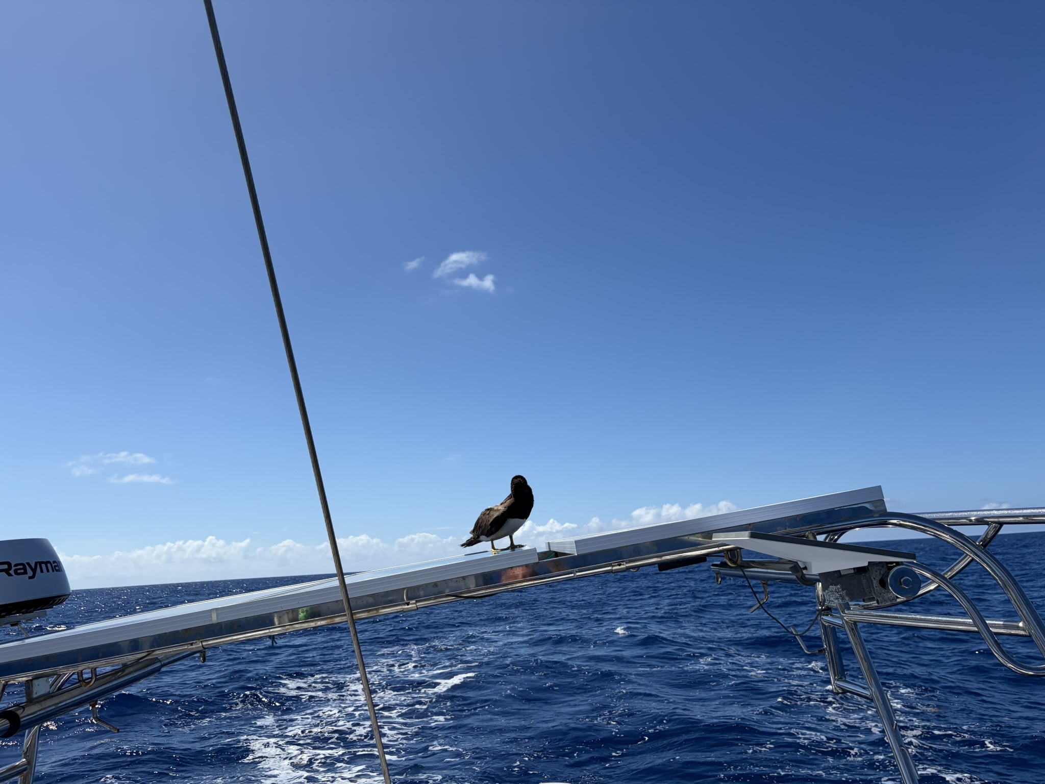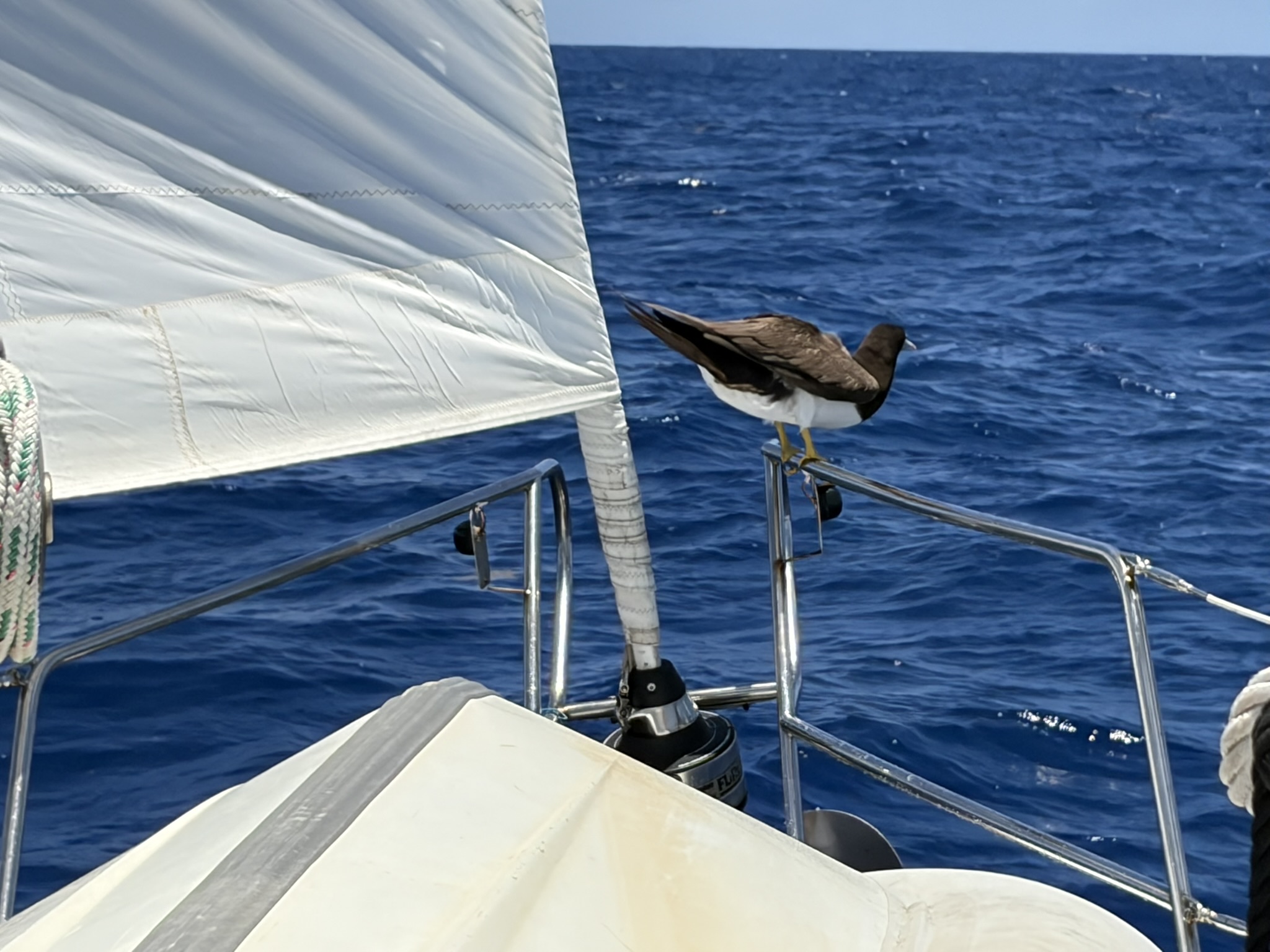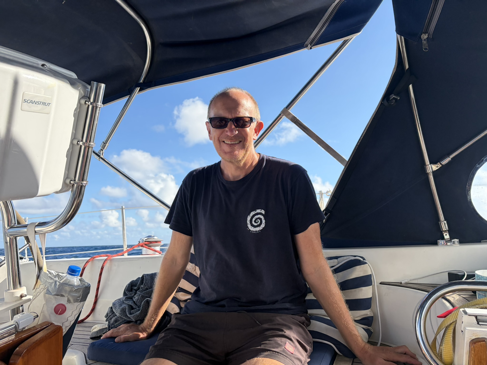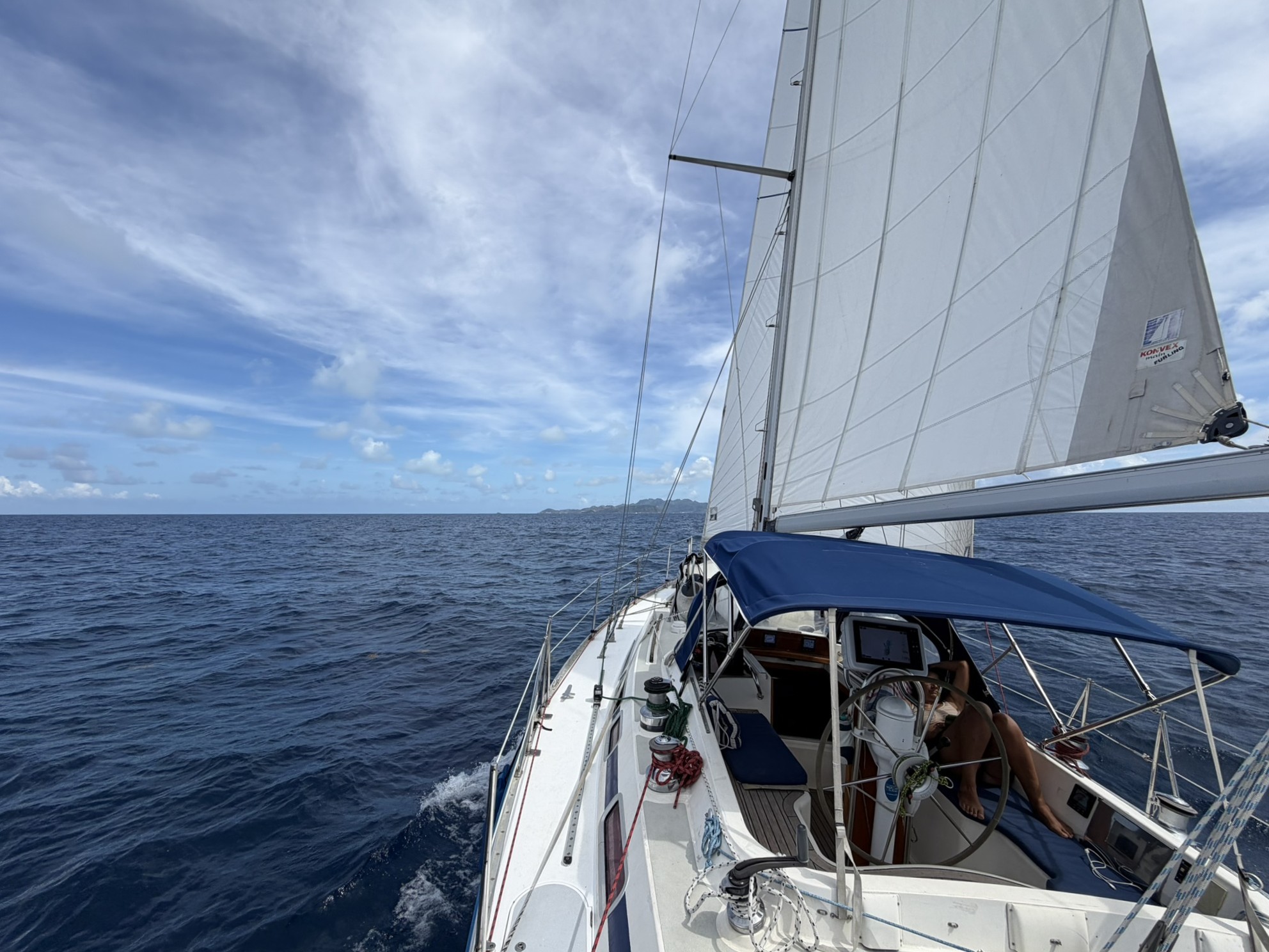 Tag 4. Wir können den Amwindkurs verlassen und schwenken nach Süden. Der Wind bleibt herrlich konstant und kommt nun von der Seite und später von schräg hinten. Das führt zu wunderbarem Kaffeesegeln der letzten 150 sm. Wenn ich mir die Windvorhersage des letzten Stücks hätte malen können, wäre sie genau so geworden wie jetzt vorhergesagt. Wegen der Piratengefahr in dieser Gegend sind wir etwas nervös, und sobald wir ein anderes Boot sehen, wird erstmal per Fernglas gecheckt, ob es irgendwelche Anstalten macht, in unsere Richtung zu kommen. Wir haben das Senden unseres AIS (zeigt anderen Schiffen an, wer wir sind und wo wir langfahren) ausgestellt und Nachts auch das Mastlicht, um schlechter gesehen zu werden.