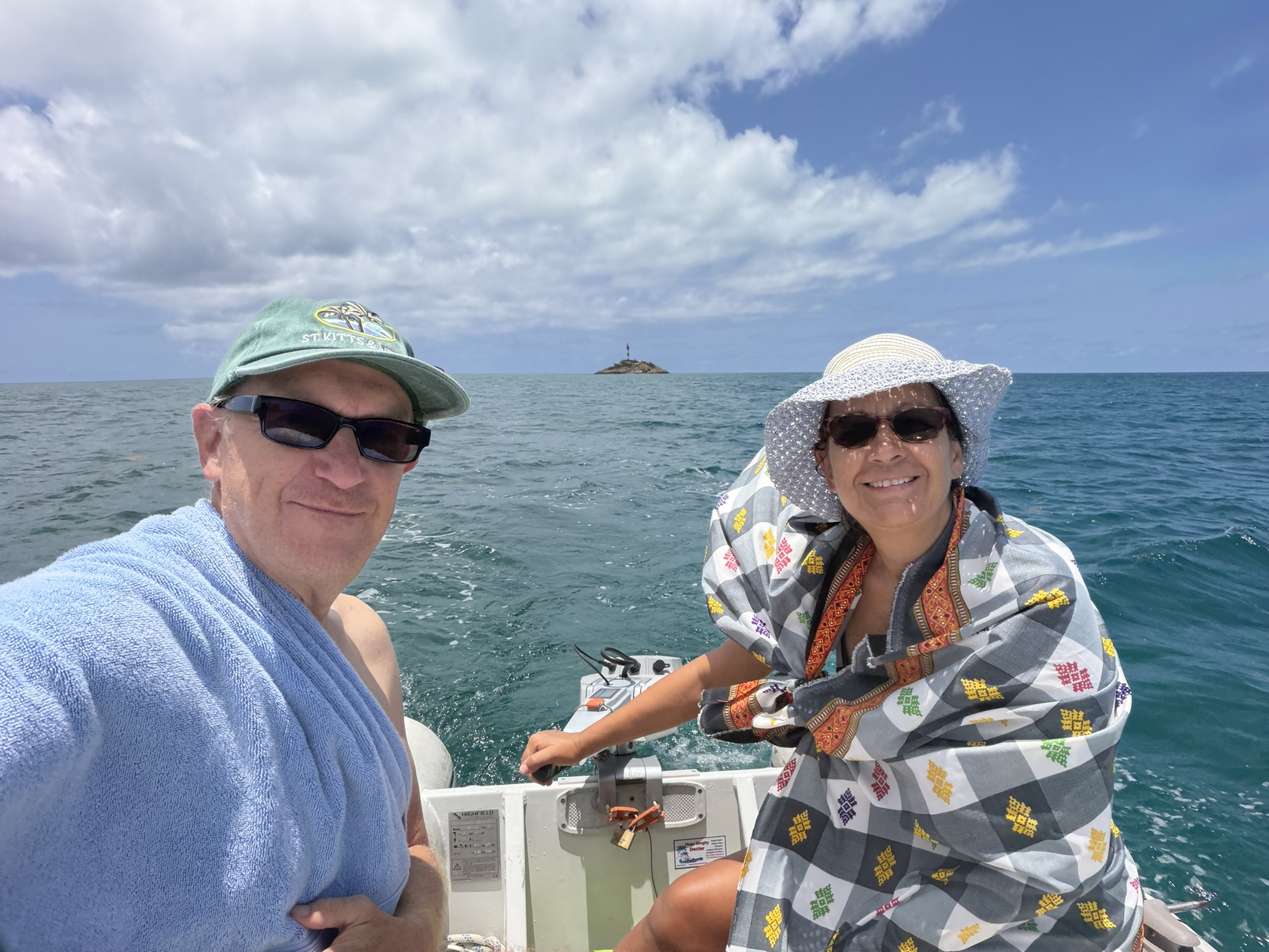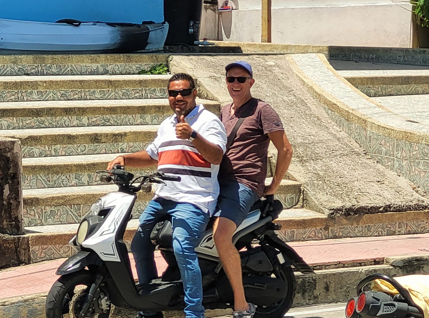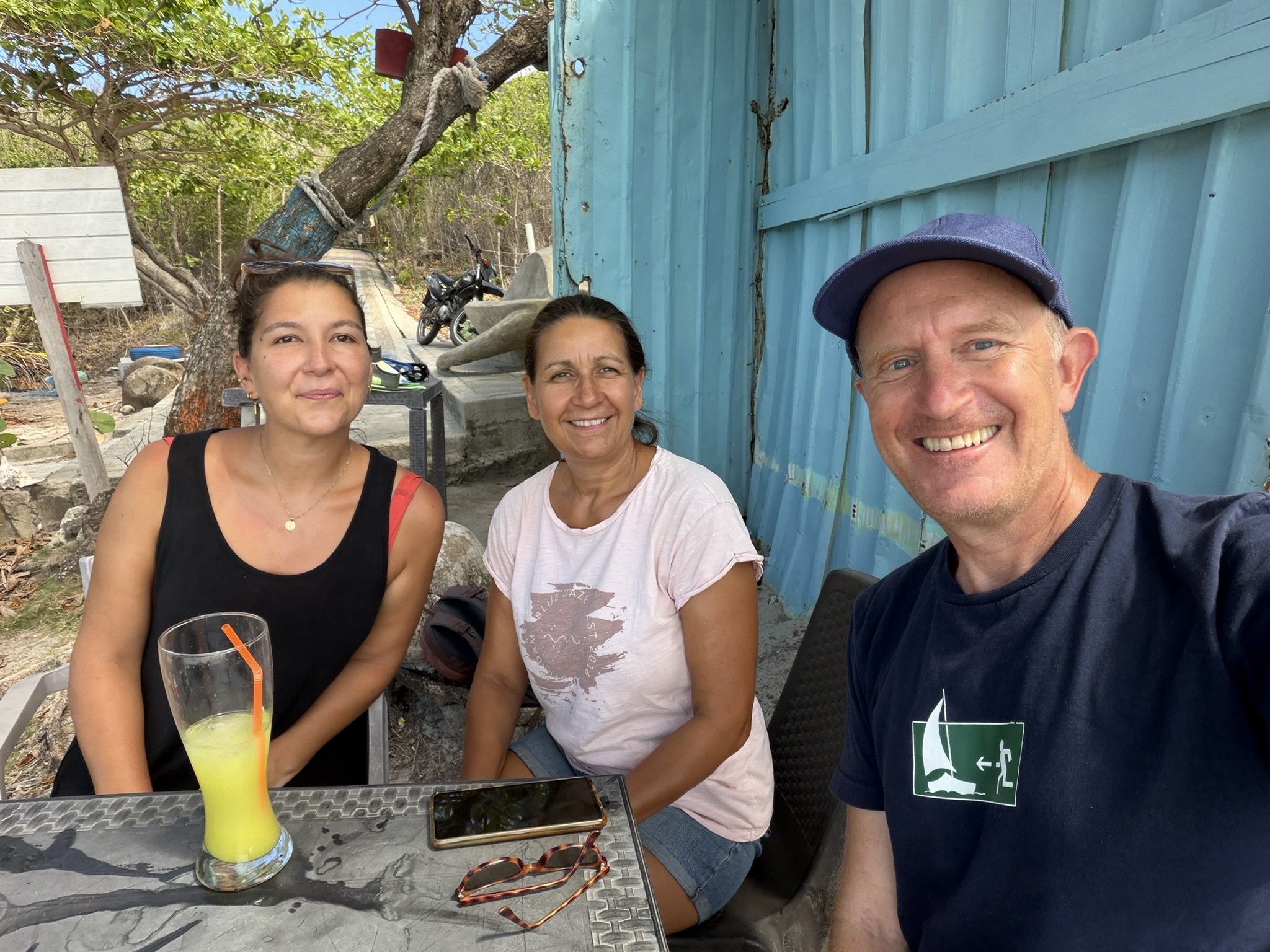 Am nächsten Tag ist der Skipperin etwas unwohl und deshalb mache ich mich alleine auf und brause diesmal im Uhrzeigersinn um die Insel. Die Strecke ist insgesamt nicht sehr lang und man ist bei gemächlicher Fahrweise in weniger als einer Stunde herum. Zum Spazierengehen geschweige denn Wandern ist es schon wieder viel zu heiß. Aber auf dem Moped ist es mit dem Fahrtwind total angenehm. Am Nachmittag bekommen wir Besuch an Bord von Sophia und Anthony. Er ist gebürtig von hier und hat im Tourismus viele unterschiedliche Jobs. Zum Beispiel Guide zum Wandern, Bootsausflüge managen und Begleitung von Kreuzfahrttouristen. Alle 4–6 Wochen hält hier ein Schiff mit über 1000 Passagieren an, und die Insel putzt sich dafür jedes Mal raus. Es werden Stände aufgebaut und viele Angebote für Ausflüge gemacht. Er ist einer von 25 Betreuern für die Leute. Das nächste Schiff kommt am Mittwoch, was wir wohl knapp verpassen werden. Ein sehr netter Nachmittag an Bord.