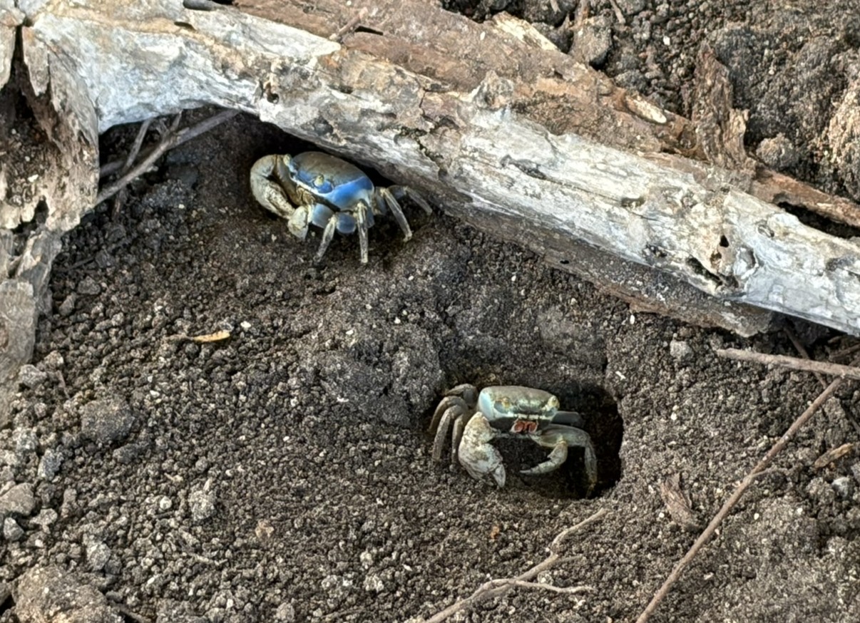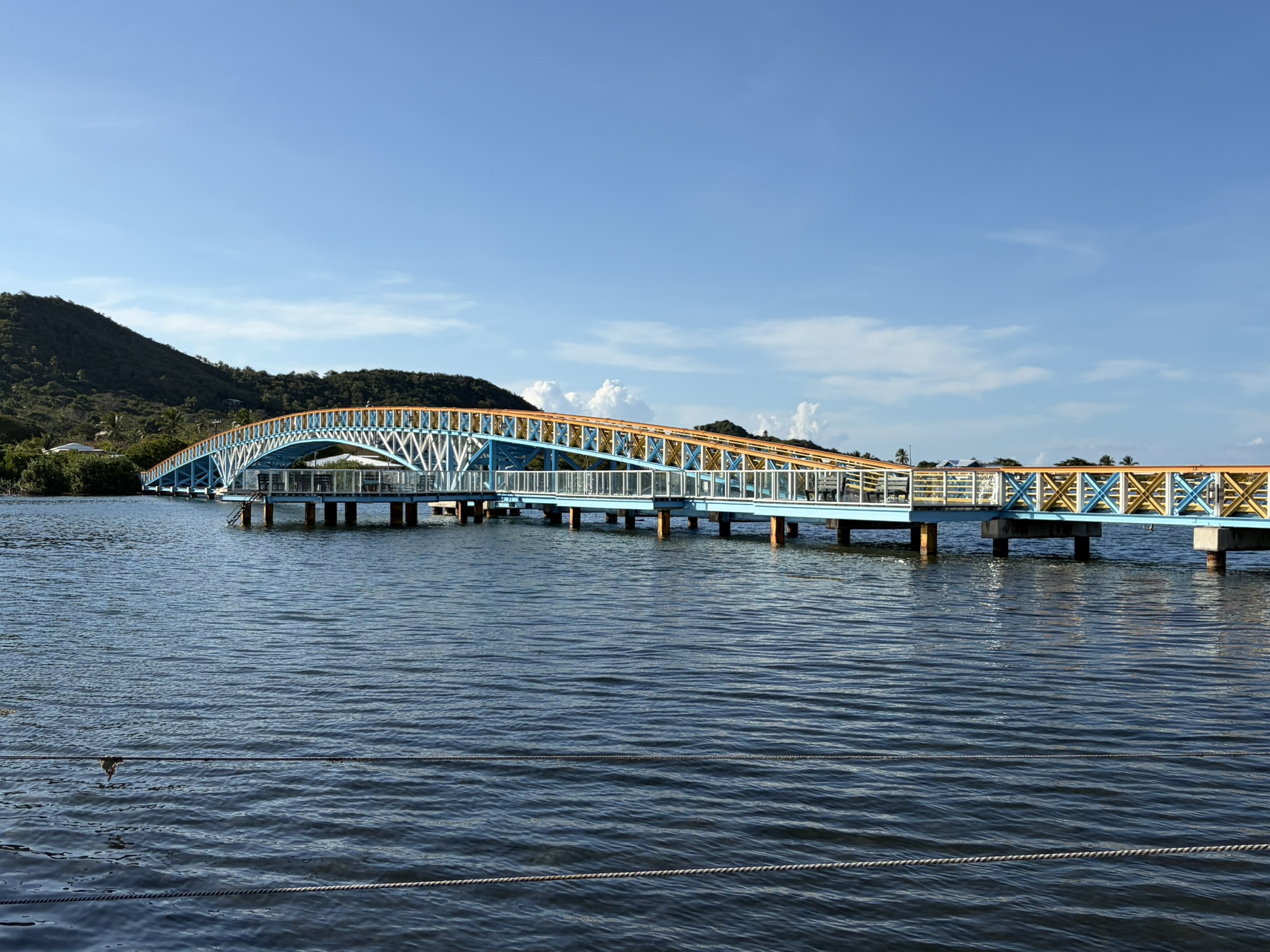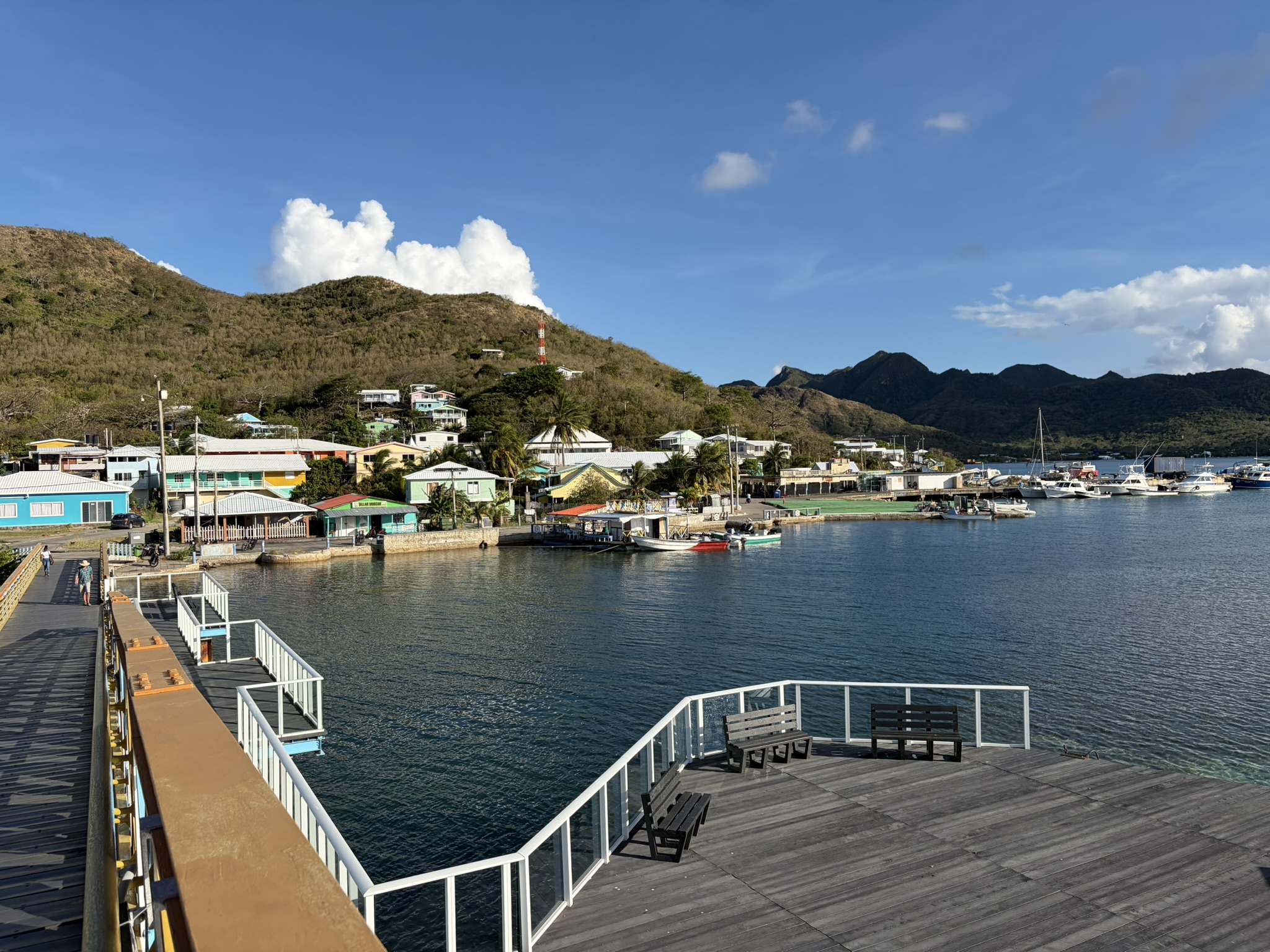 Unser erster Ausflug geht direkt in die Nähe auf die Nachbarinsel mit dem schönen Namen Santa Catalina. Diese ist mit Providencia über eine bunte Brücke verbunden und besteht aus einer langen Promenade mit Wohnhäusern. Am Ende kann man noch einen kleinen Hügel raufklettern und hat einen grandiosen Blick über die Bucht. Wieder zurück kehren wir in das vielgelobte kleine Restaurant von Big Mama ein und essen frischen, gegrillten Fisch. Man sieht sowohl hier wie auch im Ort auf der anderen Seite überall die Schäden des Hurrikans Iota, der im November 2020 mit Stärke 4 über die Insel hereinbrach. Mr Bush erzählte, dass ihm im oberen Stock das Dach weggeflogen ist und die Etage komplett leer geräumt und über der Insel verteilt wurde.