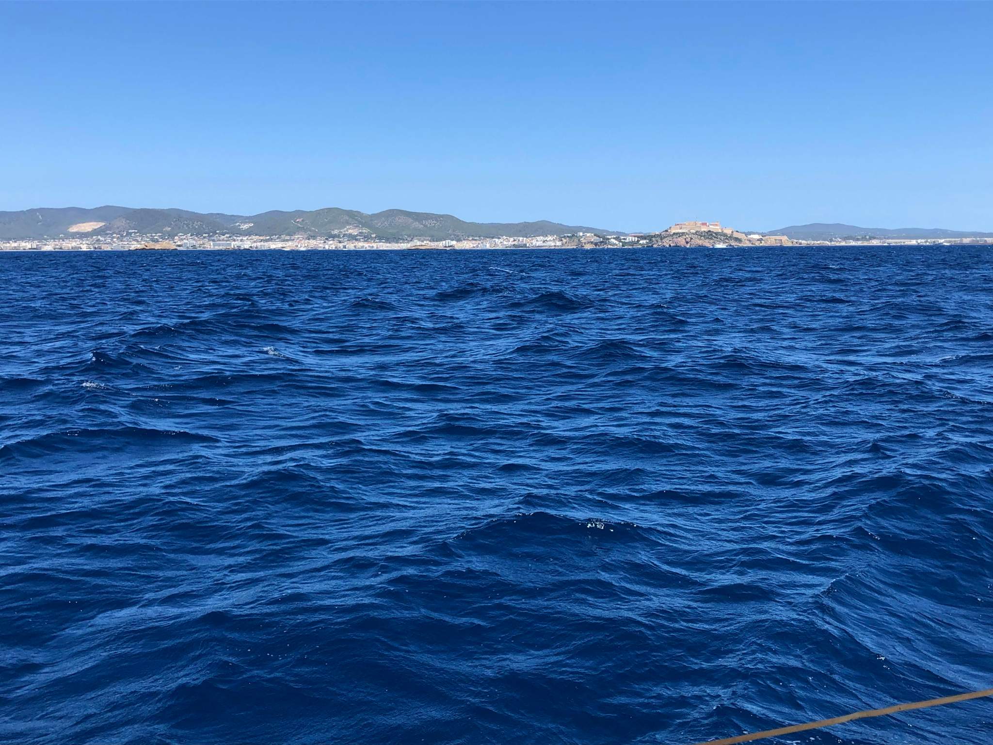 Da der Wind für die Nacht vielversprechend ist geht es nach dem Abendessen los Richtung Formentera durch die Nacht. Rechts ging die Sonne unter und links der Mond auf, sehr romantisch und entspannt. Jeder konnte ein paar Stunden schlafen, so dass wir gut durch die Nacht und über den Tag kamen. Gegen Mittag waren wir auf Formentera und haben uns an eine Boje in der Nähe des Ortes La Savina gehängt.