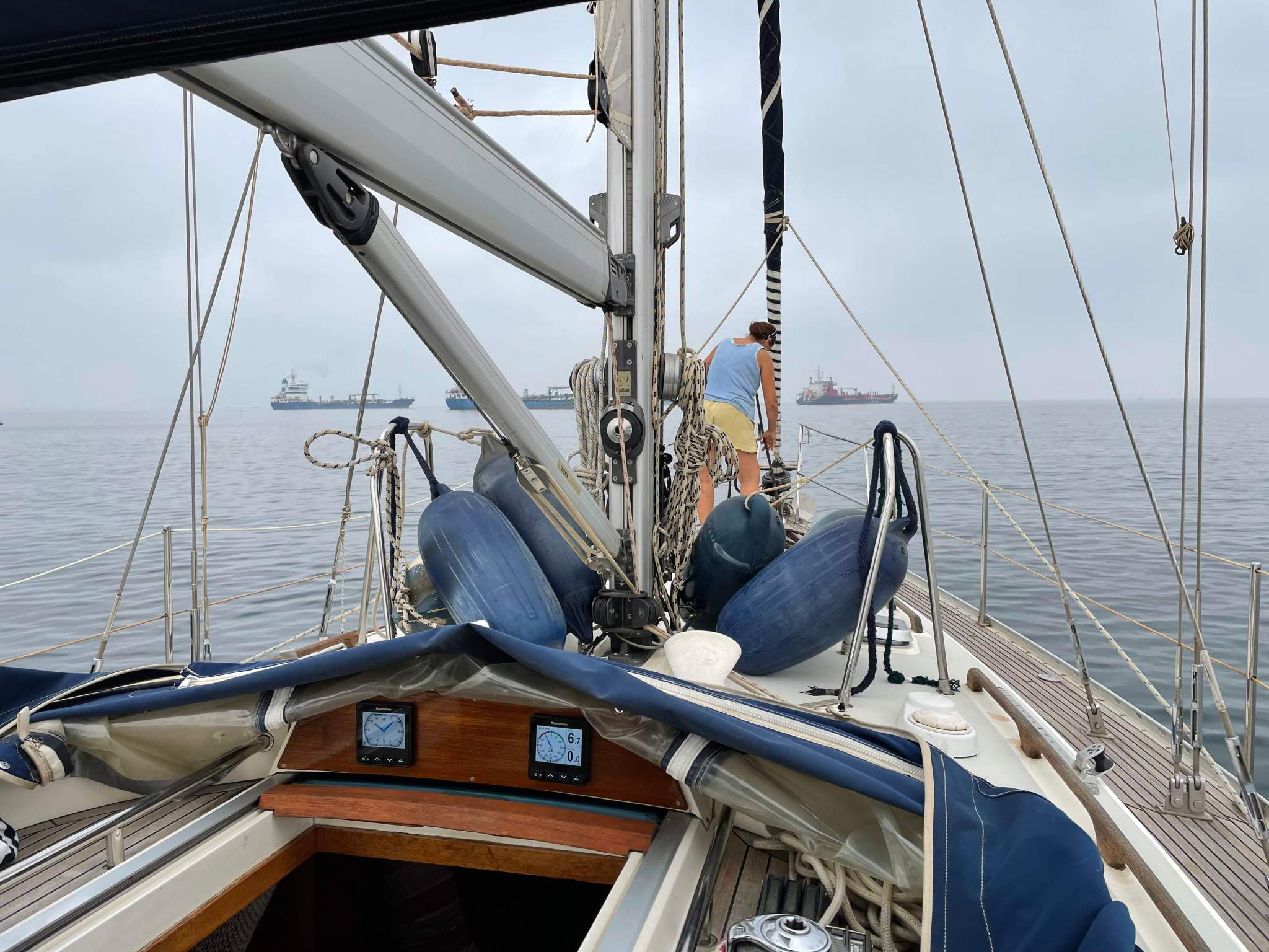 So, jetzt muss für den Rest des Trips das Großsegel und die Sturmfock ran und wenn das nicht reicht gibt es auch noch einen Motor. Morgen geht es weiter nach Cadiz.