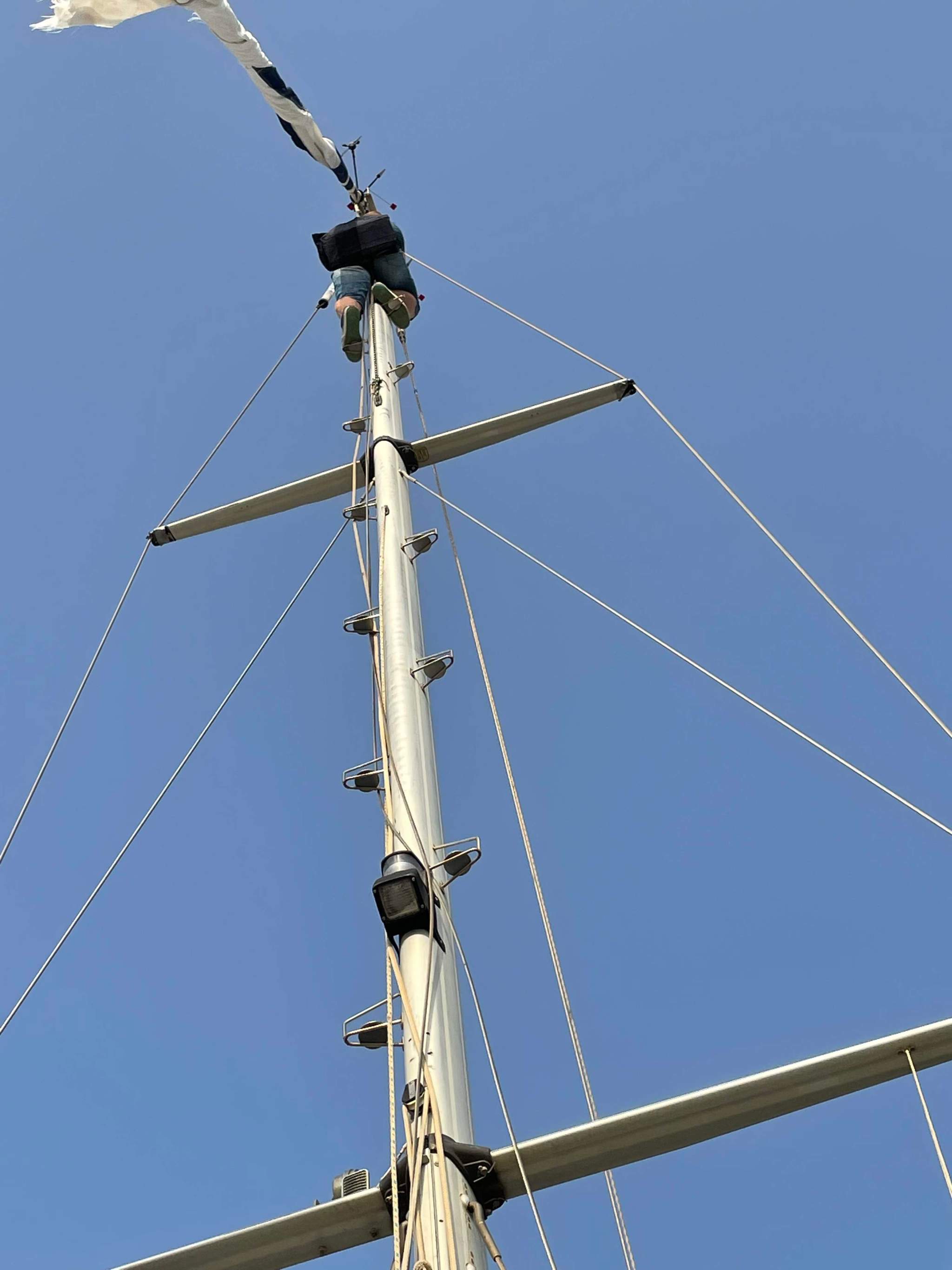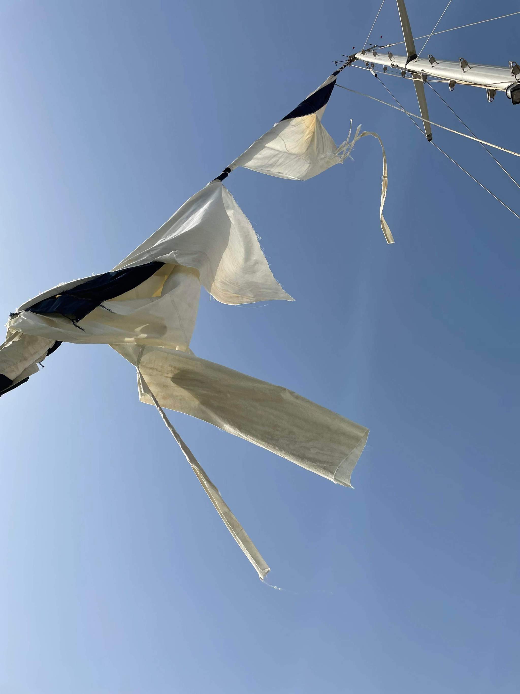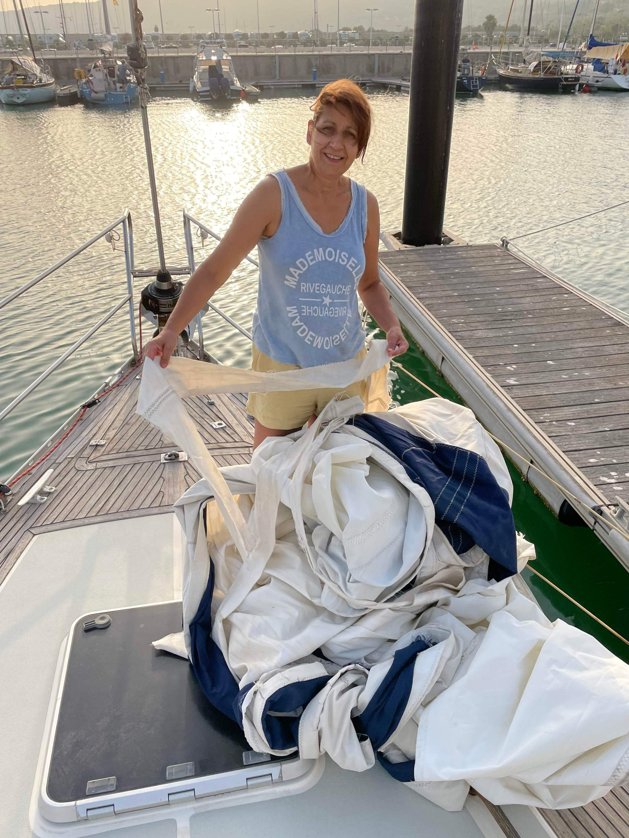 Den Orcas sind wir nicht begegnet, dafür aber einem Sturm der so heftig nicht vorhergesagt war. Durch den Düseneffekt im Kanal von Gibraltar ging uns bei Böen bis zu 40kn die ziemlich alte Genua kaputt und hing nur noch traurig um das Vorstag. Zum ersten Mal in unserer Seglerkarriere haben wir uns nicht mehr wirklich wohl gefühlt und waren froh als wir ansonsten unbeschadet in Barbate in der Marina eingetroffen sind. Es waren sofort sehr hilfsbereite Nachbarn zur Stelle die uns geholfen haben die Genua herunterzuholen. Das ich in den Mast musste um sie von oben loszumachen ließ sich trotzdem nicht vermeiden.